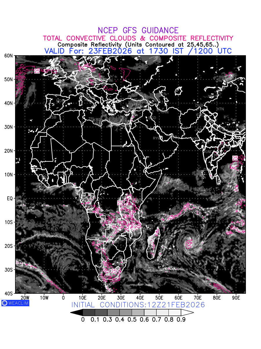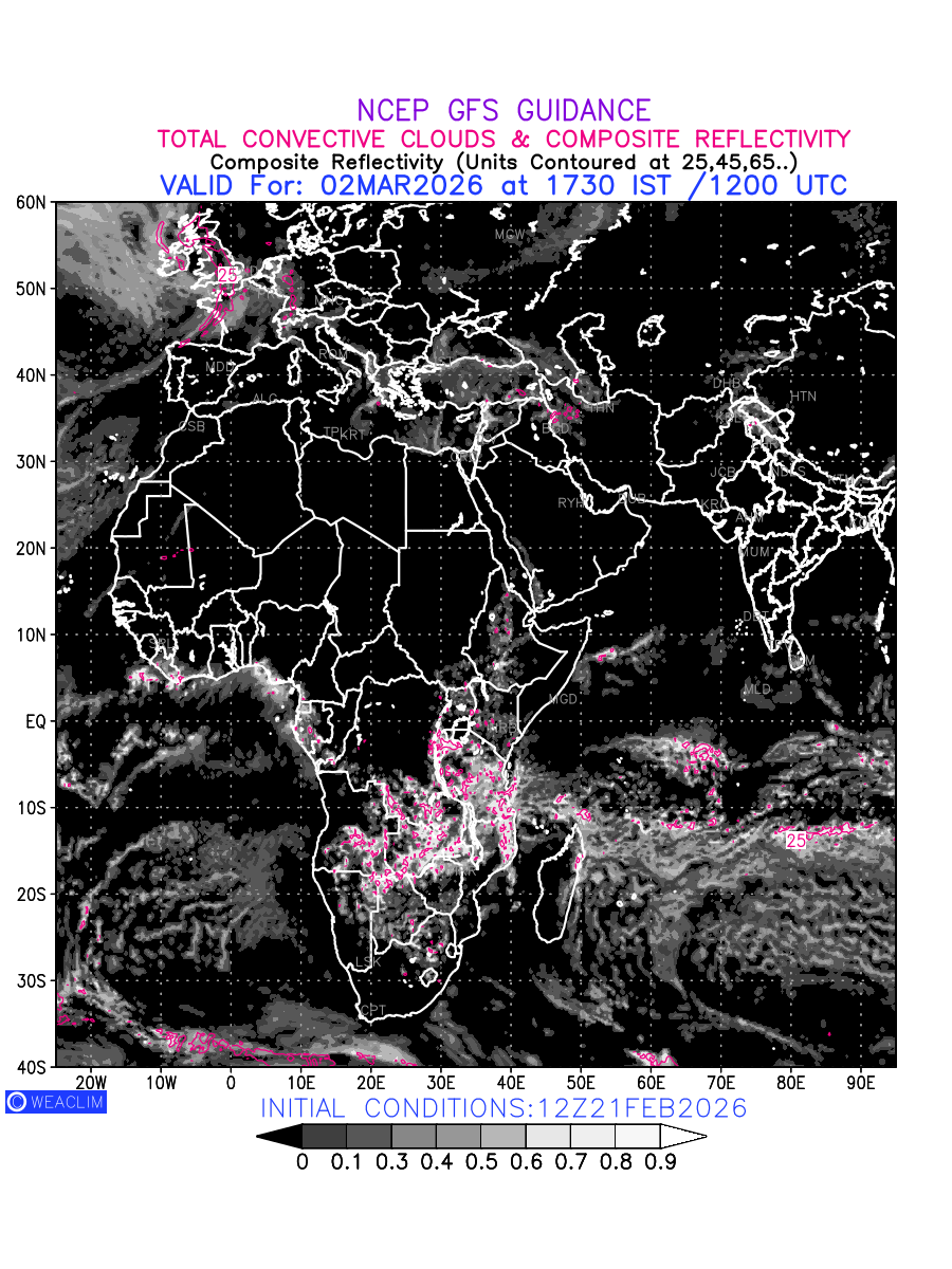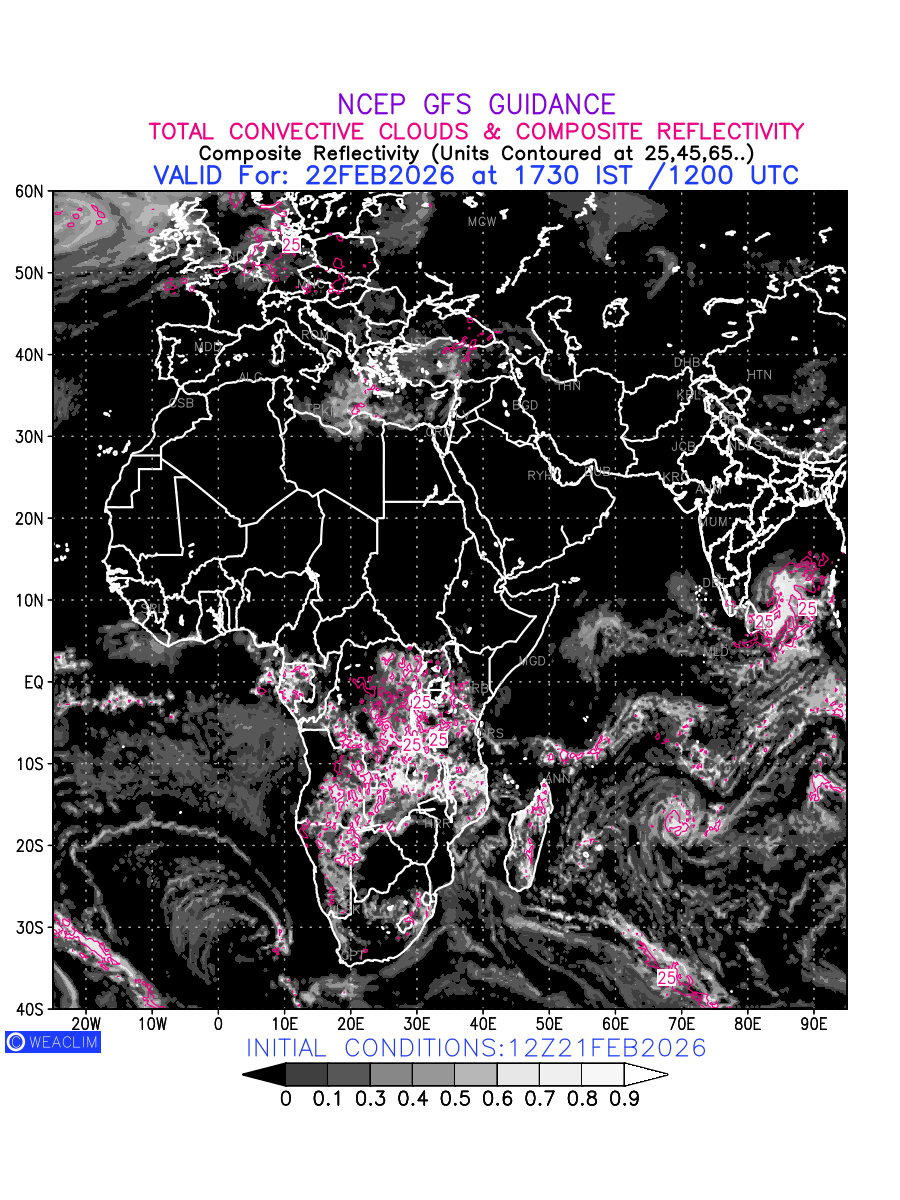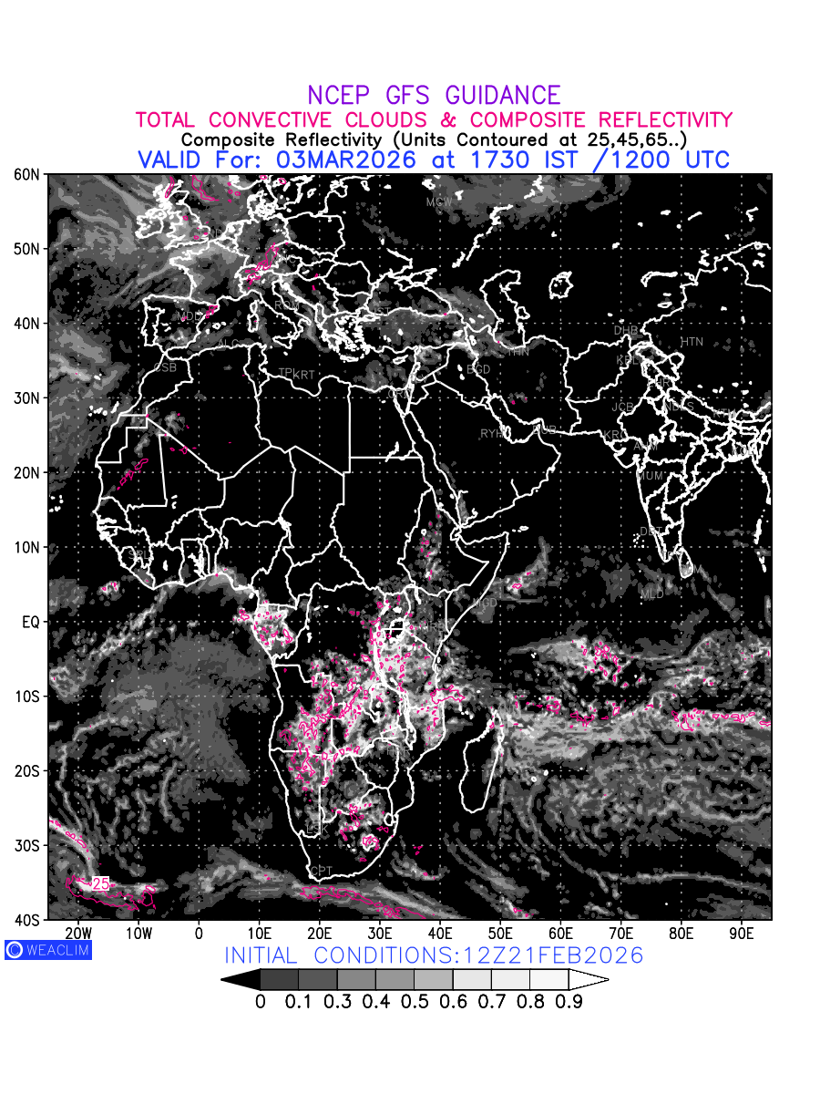 Convective clouds are formed by the vertical movement of air in the atmosphere and are associated with thunderstorms and other types of severe weather like intense rainfall, strong gusty winds etc. Shades from black to white on scale of 0 to 1 with whiter shade depicting more intensity of convection has been used in the depiction. Also shown is the Composite Reflectivity that takes the maximum reflectivity from each elevation angle of the Doppler Weather Radar and meshes it into one image.  Advantage of this type of image is the ability to quickly assess the intensity of storms. Predicted pattern of Total Convective Clouds and percentage of the sky covered by them is shown here along with Composite Reflectivity over the African Region for the next ten days.