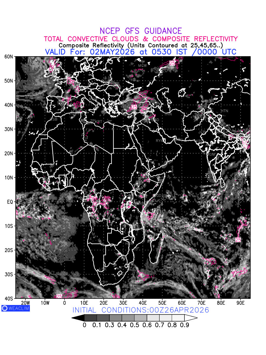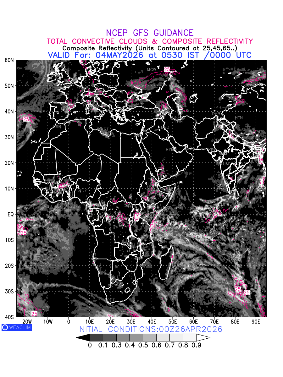 Convective clouds are formed by the vertical movement of air in the atmosphere and are associated with thunderstorms and other types of severe weather like intense rainfall, strong gusty winds etc. Shades from black to white on scale of 0 to 1 with whiter shade depicting more intensity of convection has been used in the depiction. Also shown is the Composite Reflectivity that takes the maximum reflectivity from each elevation angle of the Doppler Weather Radar and meshes it into one image. Advantage of this type of image is the ability to quickly assess the intensity of storms. Predicted pattern of Total Convective Clouds and percentage of the sky covered by them is shown here along with Composite Reflectivity over the African Region for the next ten days.