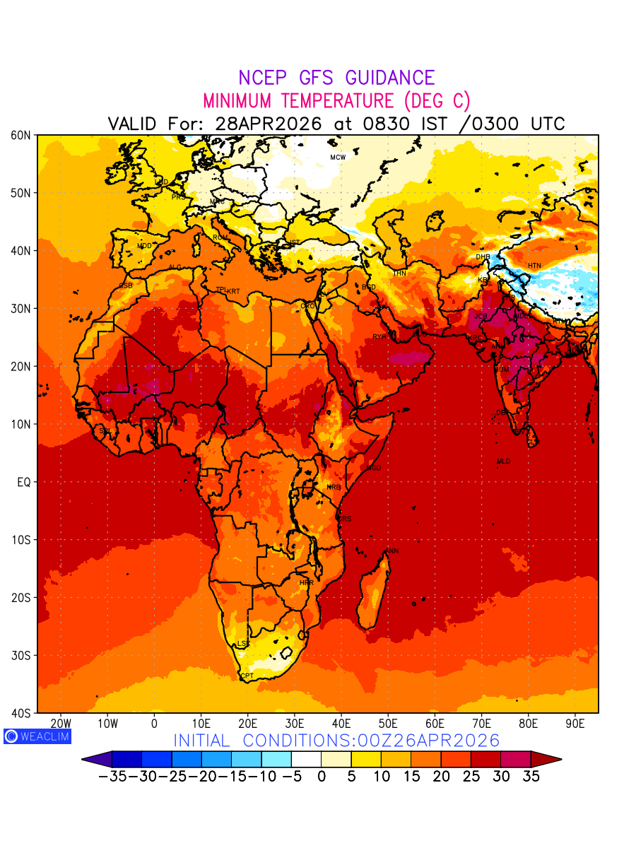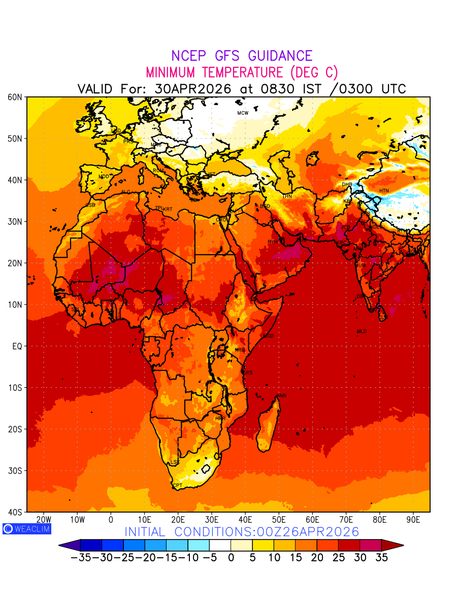 Minimum Temperature for Africa depicts the highest temperatures at 2m above the ground surface between 0300 UTC of the previous date to 0300 UTC of the required date. This is an important variable for weather forecasting, as it determines the conditions at the Earth’s surface during the coldest part of the date, affecting human activities, agriculture, and the environment. 2m Temperature data can be used for a variety of applications, such as predicting the onset of cold spells, forecasting temperature trends, and studying the impact of weather on various systems and processes.
