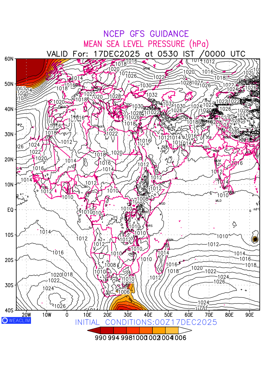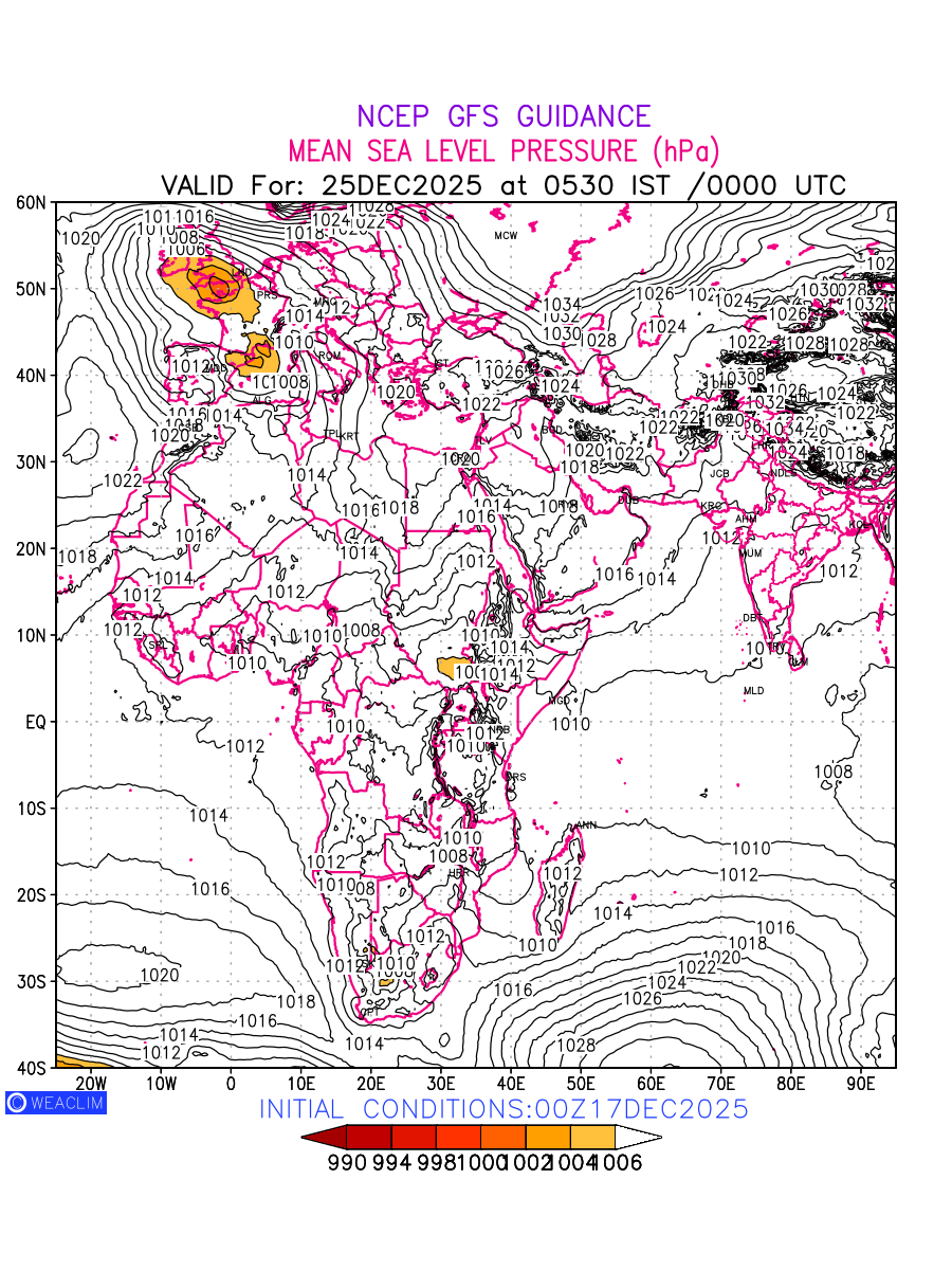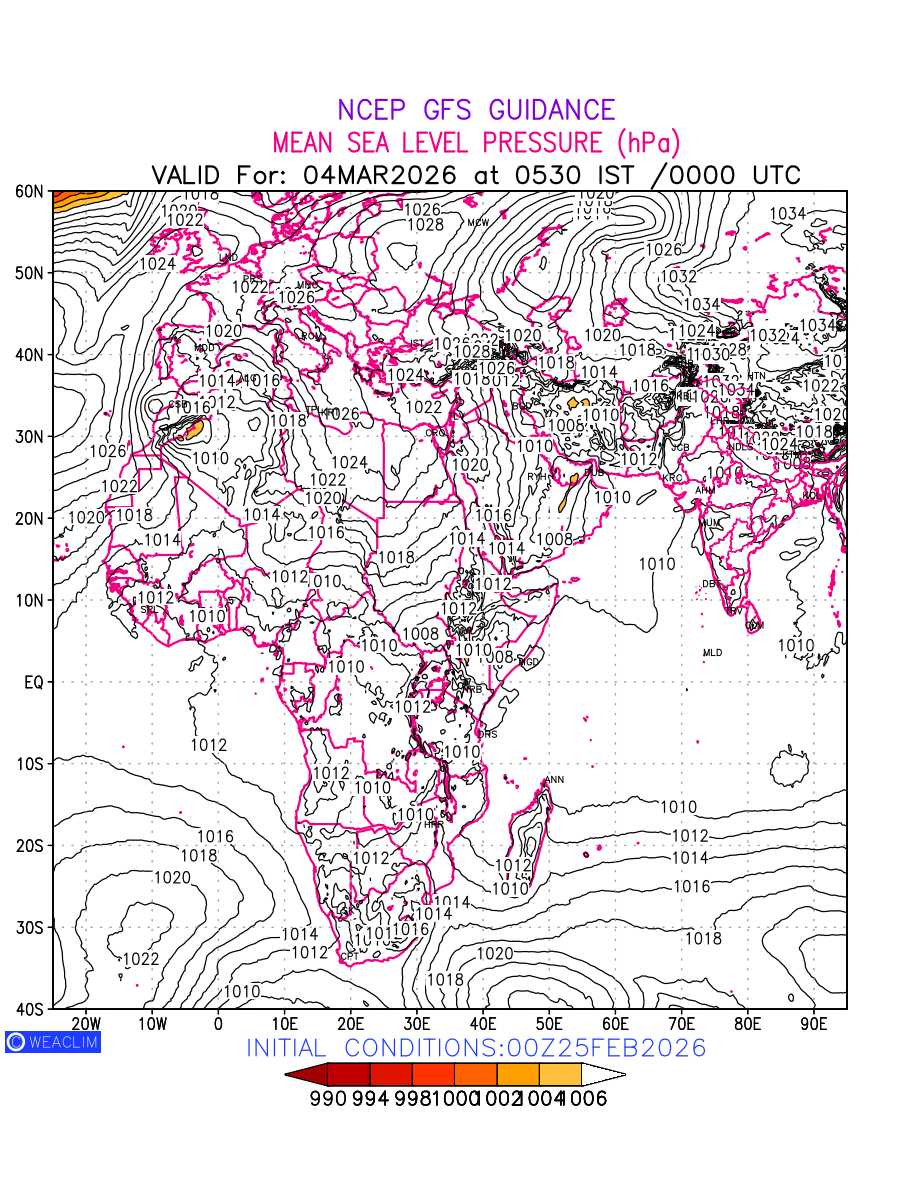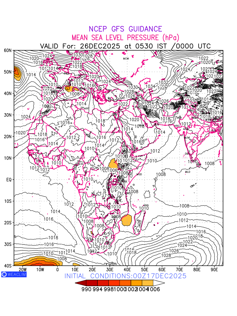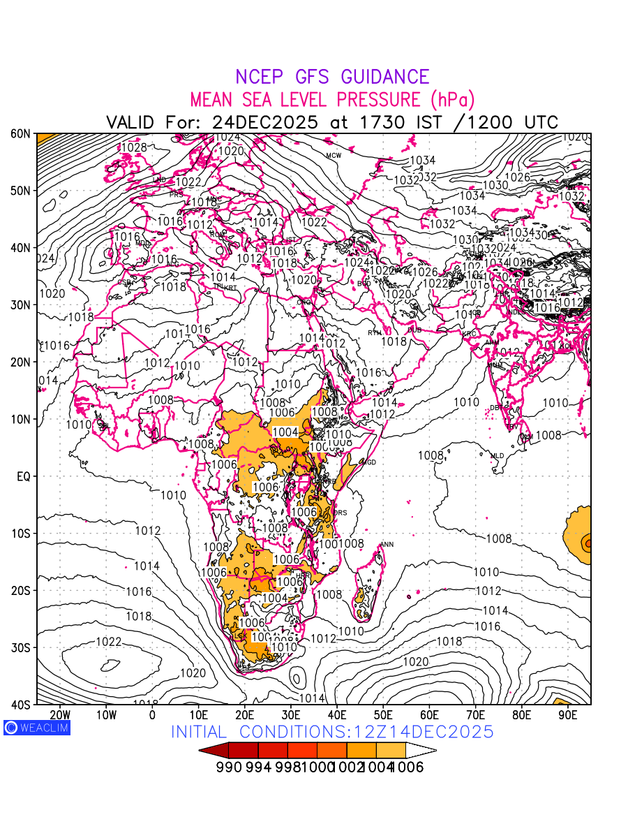 Mean Sea Level Pressure (MSLP) charts at the 24th hour for Africa typically show a color-coded contour map of atmospheric pressure at sea level, with lines of equal pressure (isobars) indicating areas of high and low pressure over a geographic area. Meteorologists use these charts to identify areas of high and low pressure, which can give indications of storms, cold fronts, or warm fronts. The MSLP charts are also useful in identifying areas of convergence and divergence in the atmosphere, which can influence the formation or decay of weather systems.