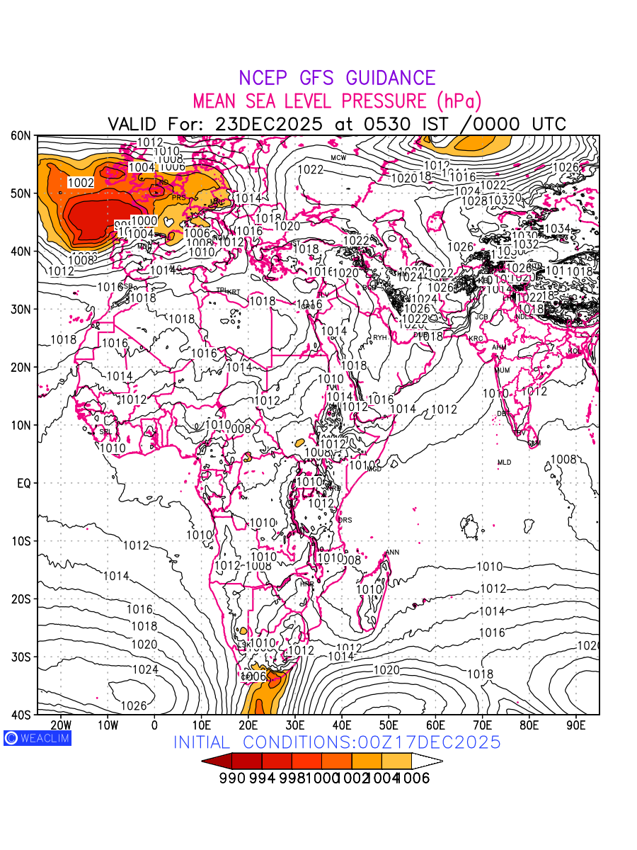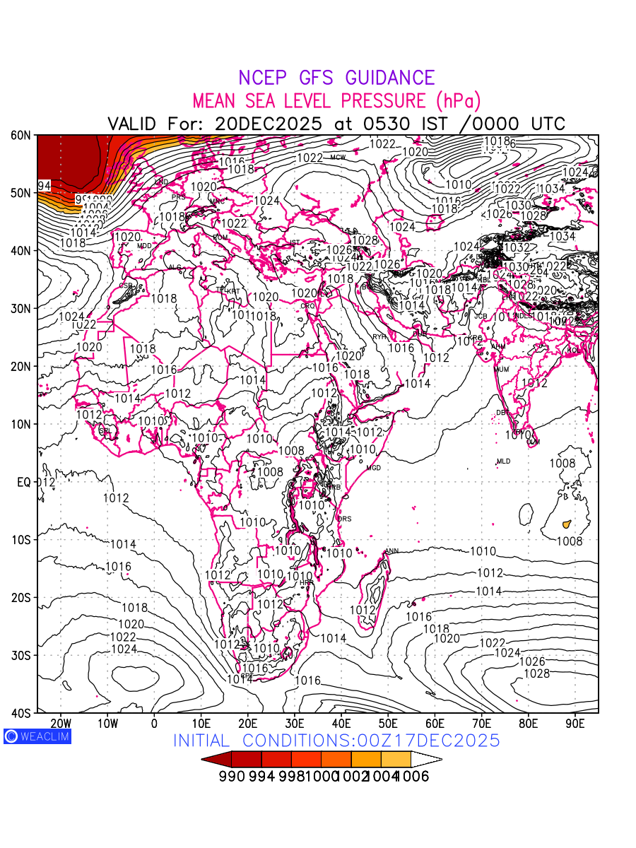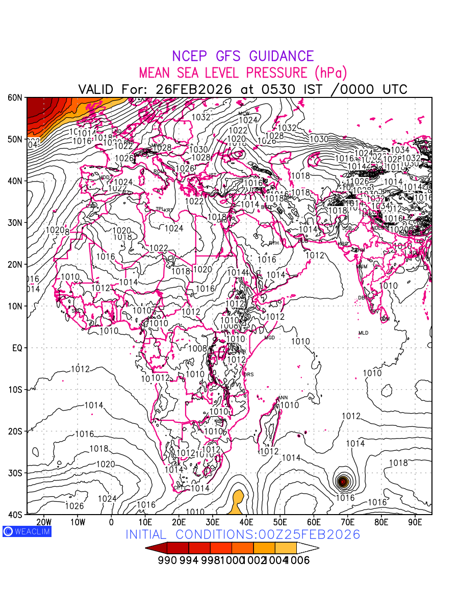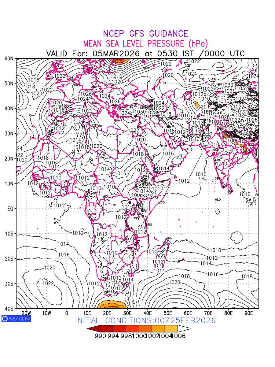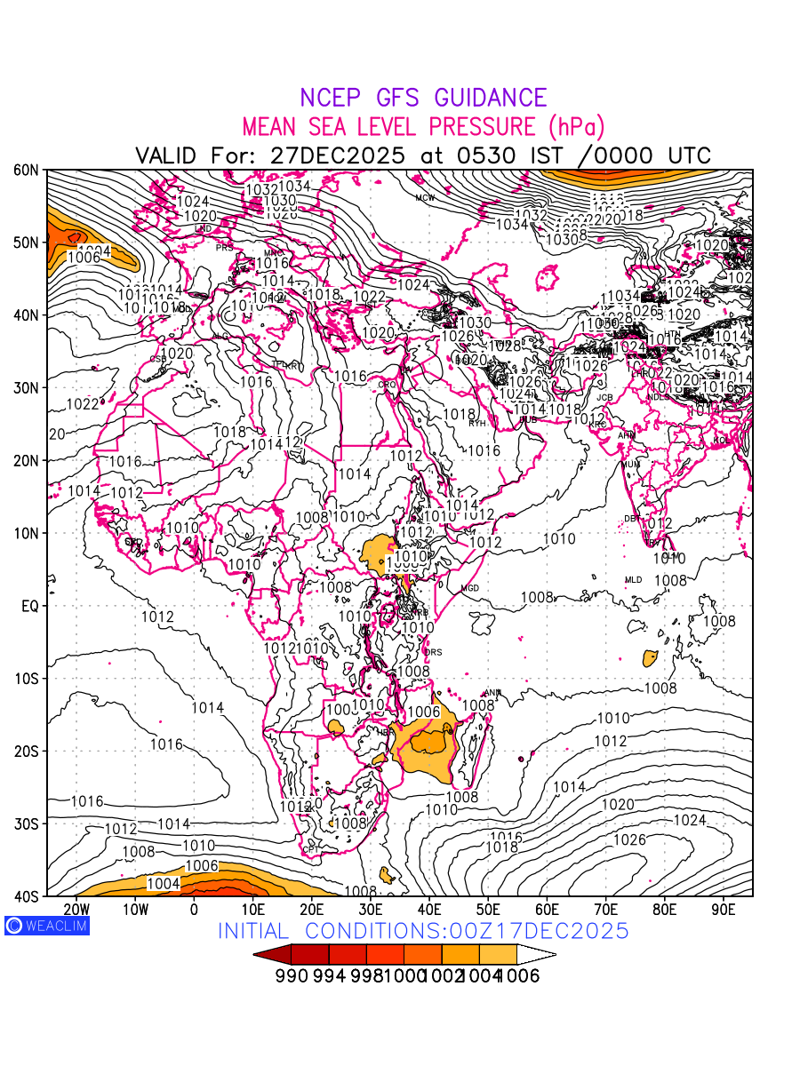 Mean Sea Level Pressure (MSLP) charts at the 24th hour for Africa typically show a color-coded contour map of atmospheric pressure at sea level, with lines of equal pressure (isobars) indicating areas of high and low pressure over a geographic area. Meteorologists use these charts to identify areas of high and low pressure, which can give indications of storms, cold fronts, or warm fronts. The MSLP charts are also useful in identifying areas of convergence and divergence in the atmosphere, which can influence the formation or decay of weather systems.