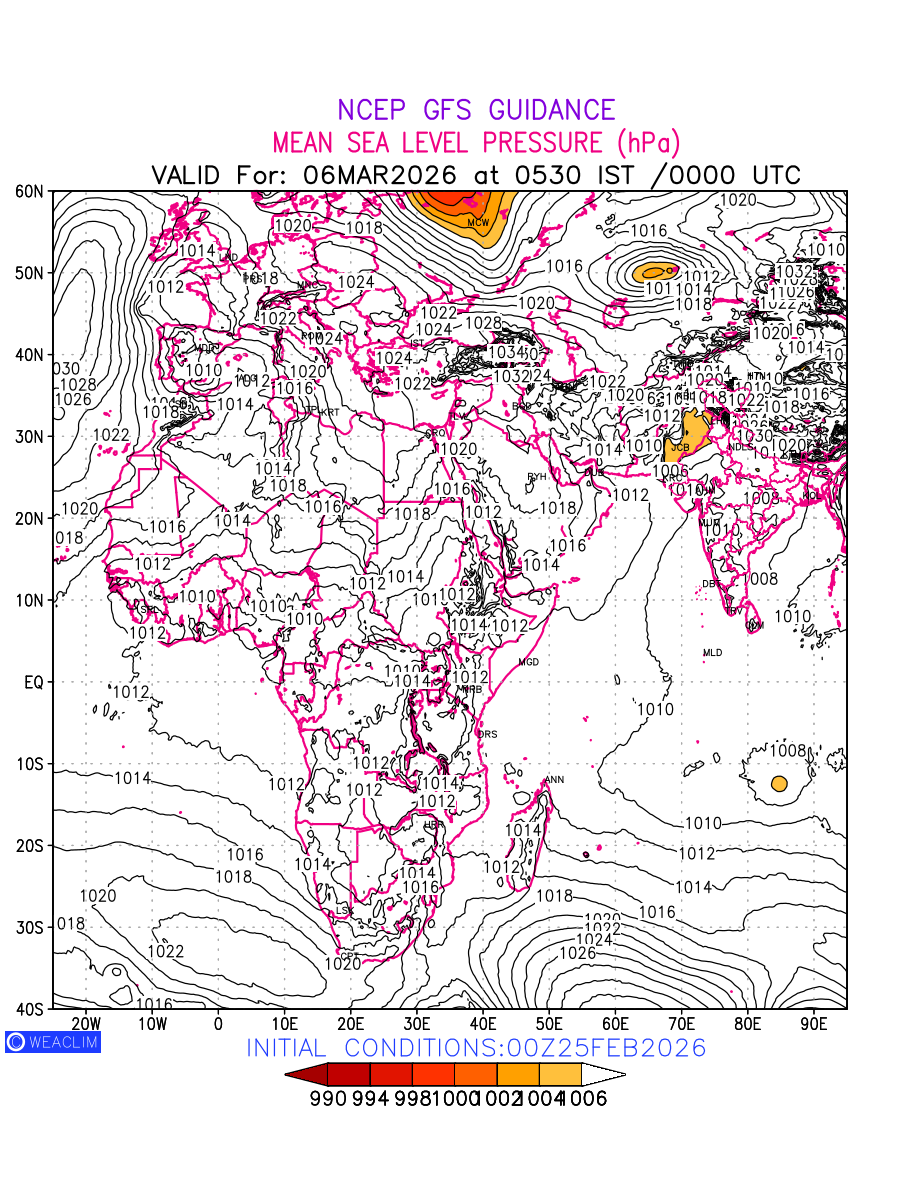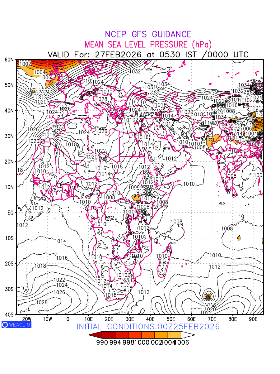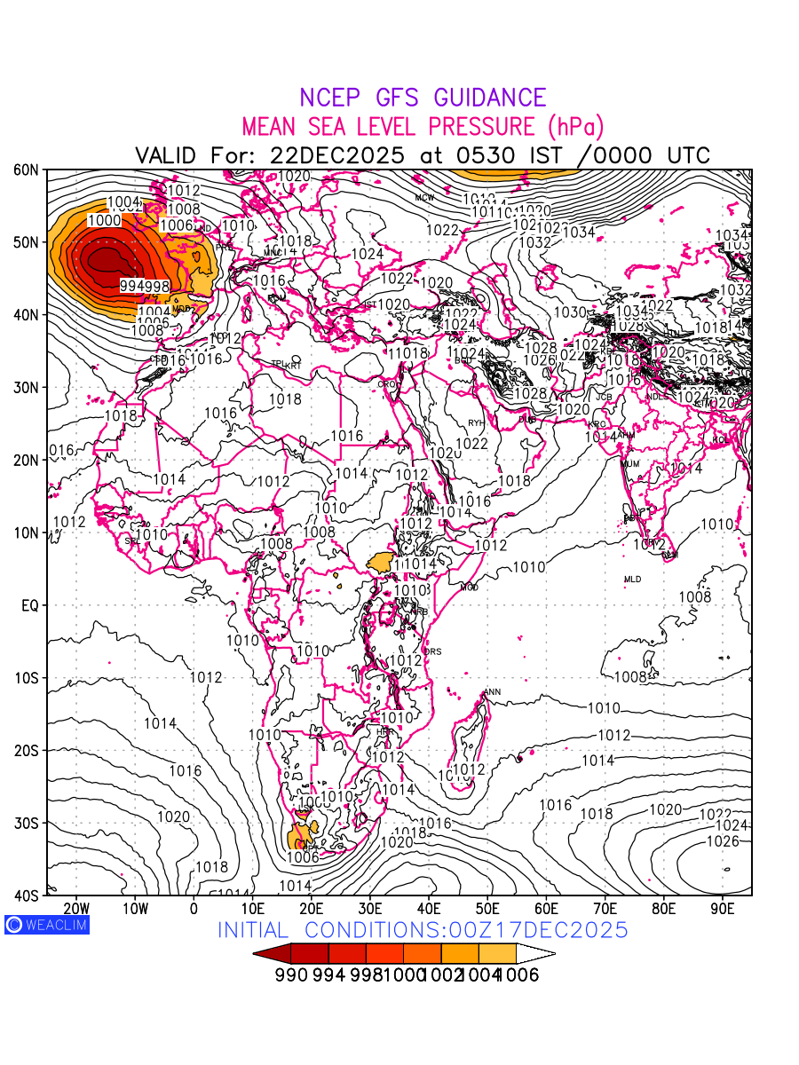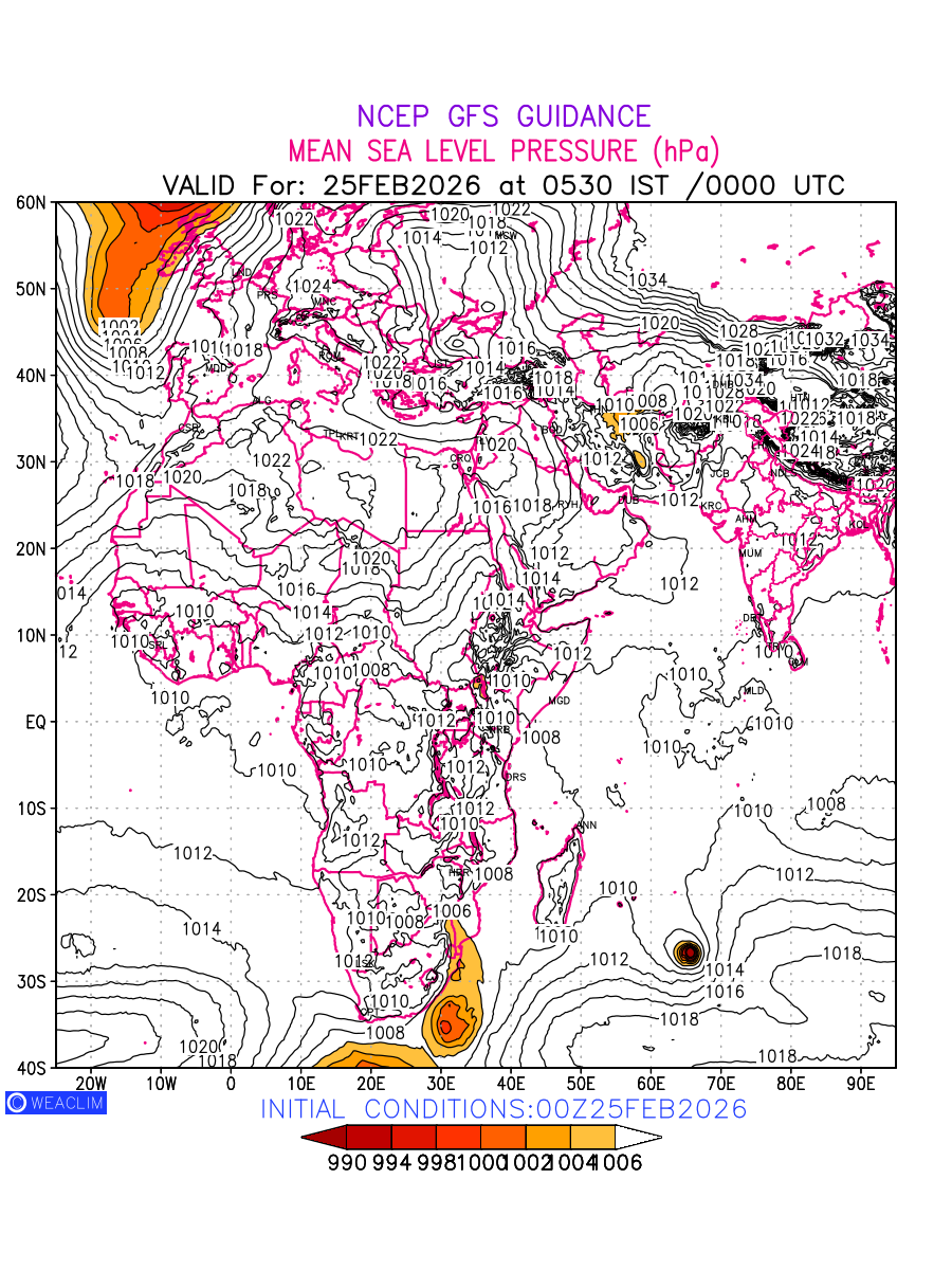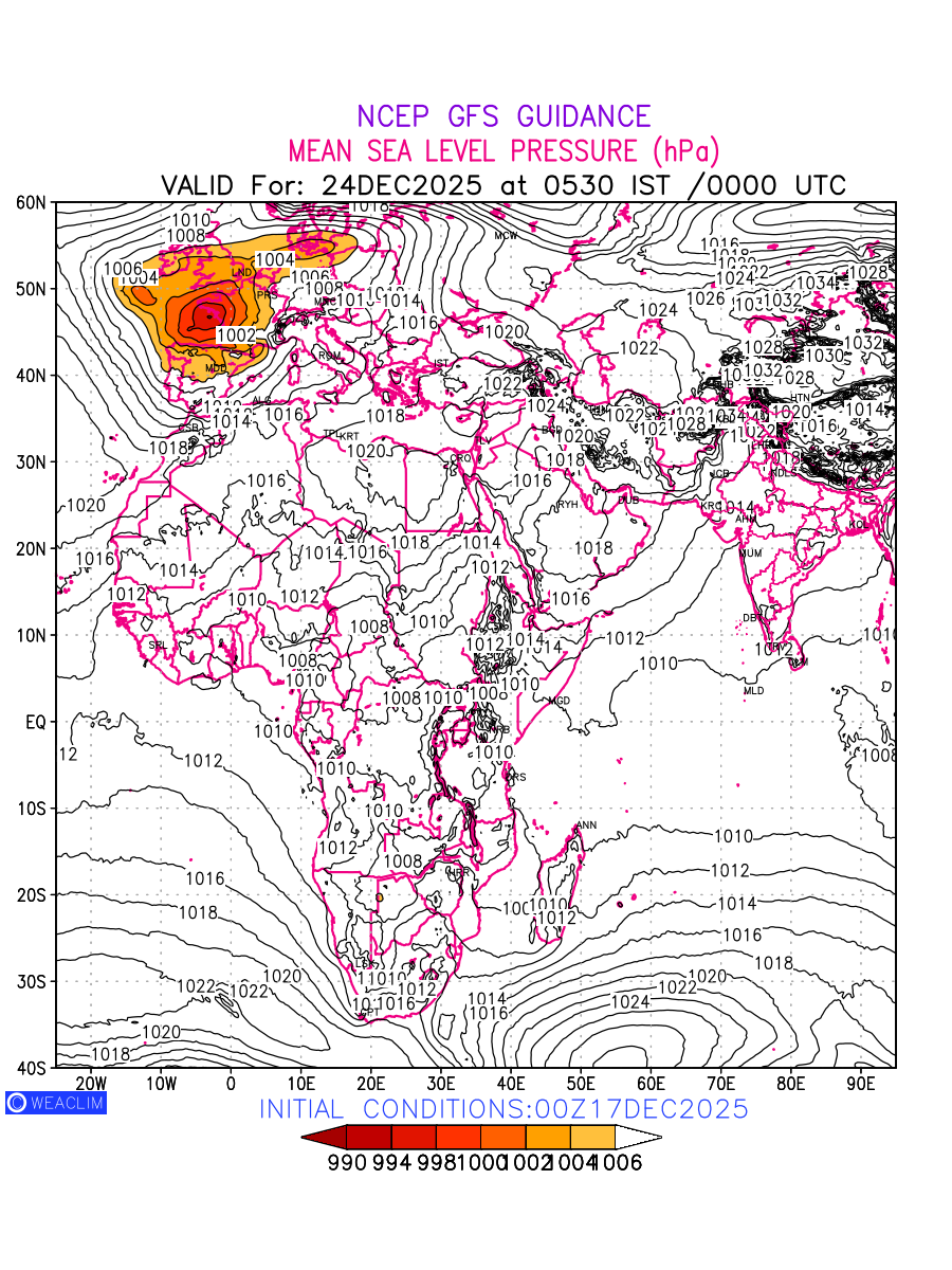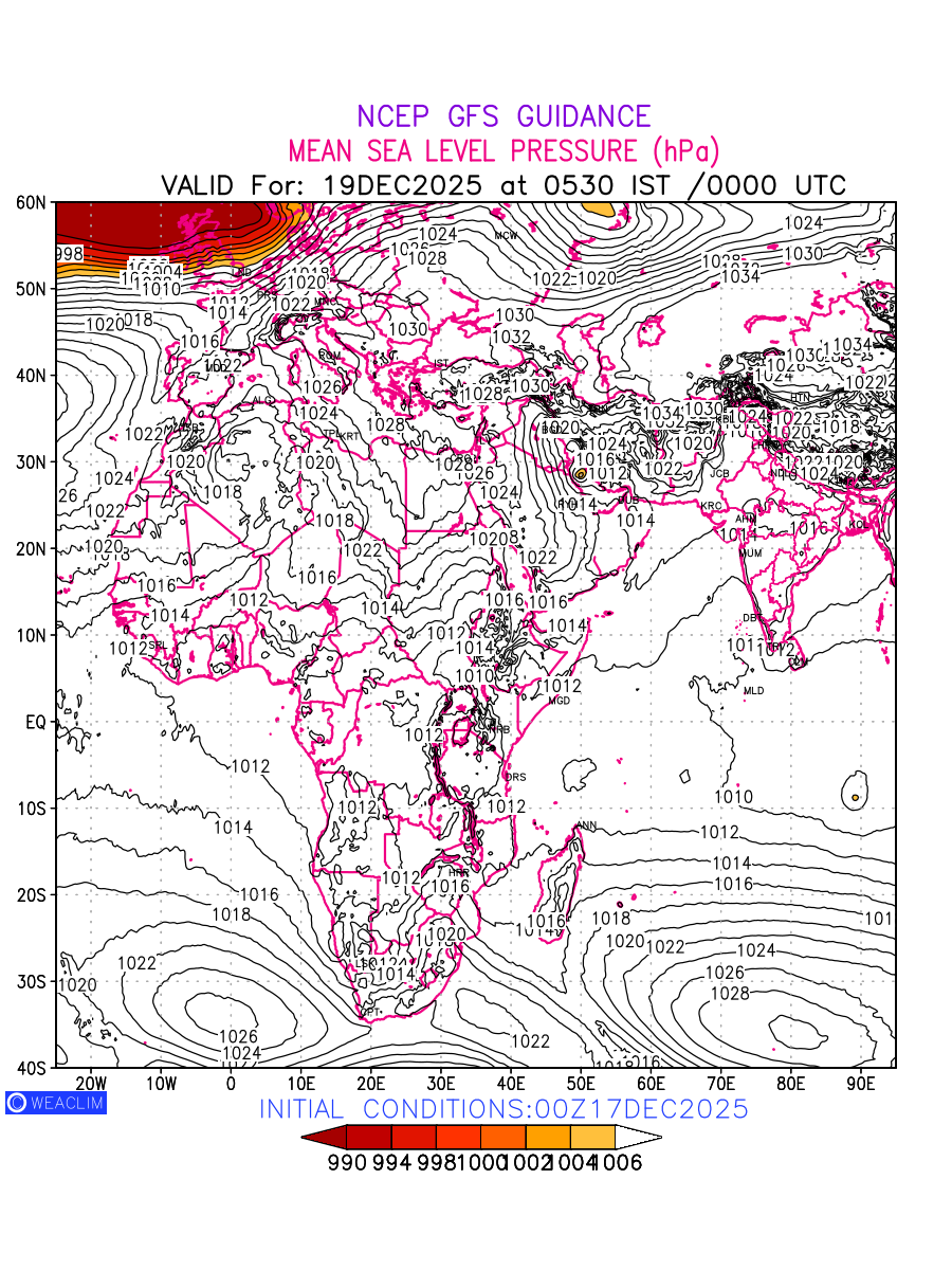 Mean Sea Level Pressure (MSLP) charts at the 24th hour for Africa typically show a color-coded contour map of atmospheric pressure at sea level, with lines of equal pressure (isobars) indicating areas of high and low pressure over a geographic area. Meteorologists use these charts to identify areas of high and low pressure, which can give indications of storms, cold fronts, or warm fronts. The MSLP charts are also useful in identifying areas of convergence and divergence in the atmosphere, which can influence the formation or decay of weather systems.