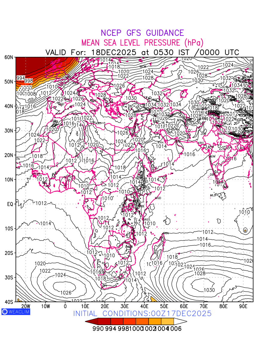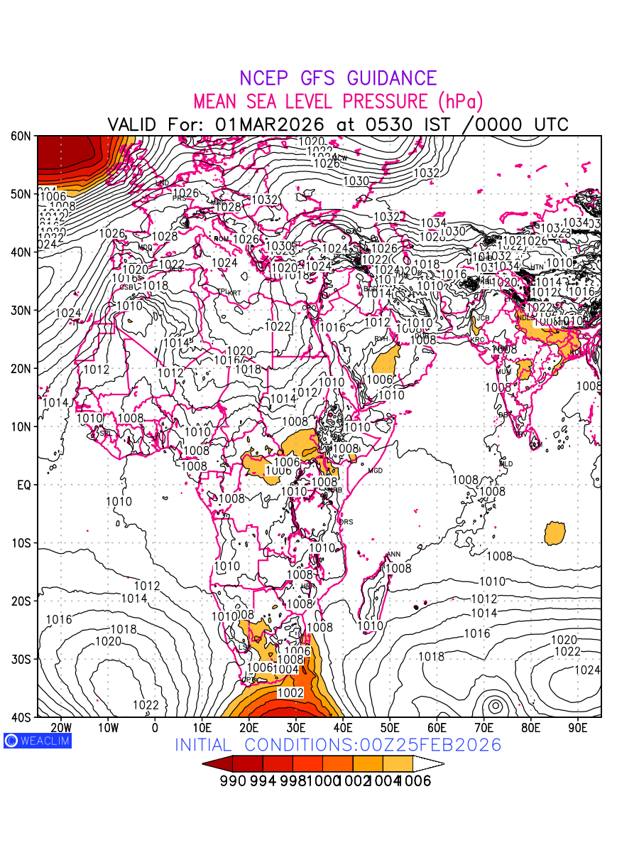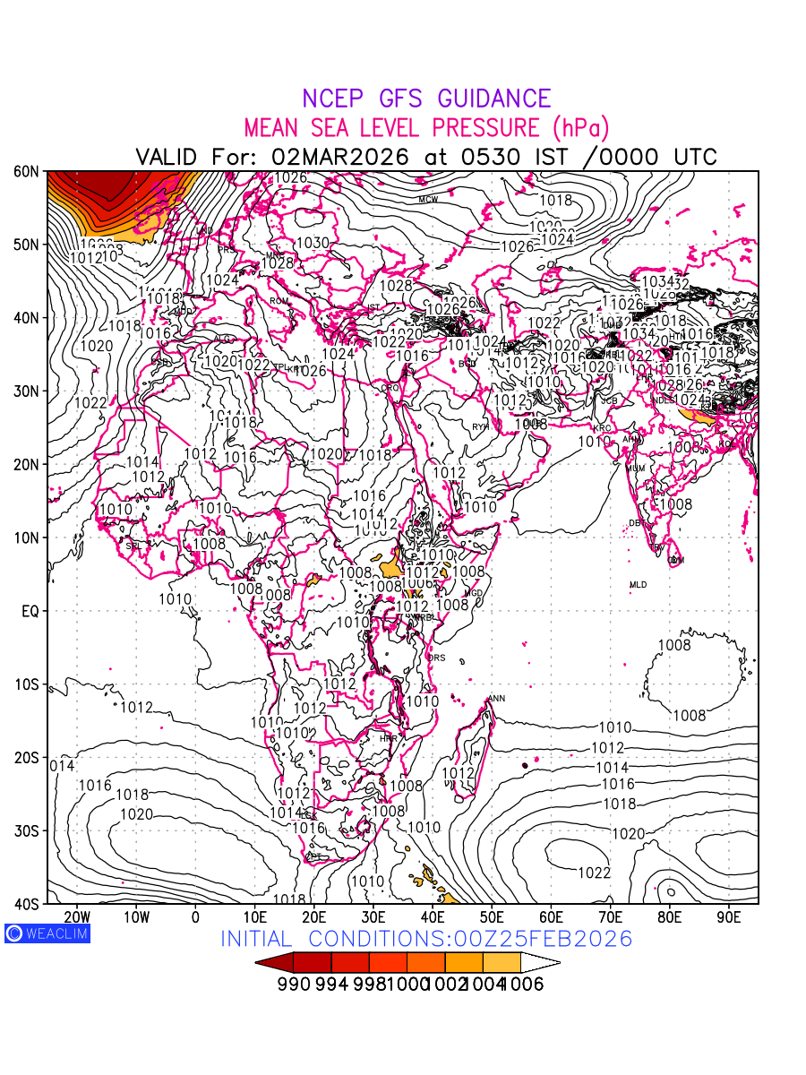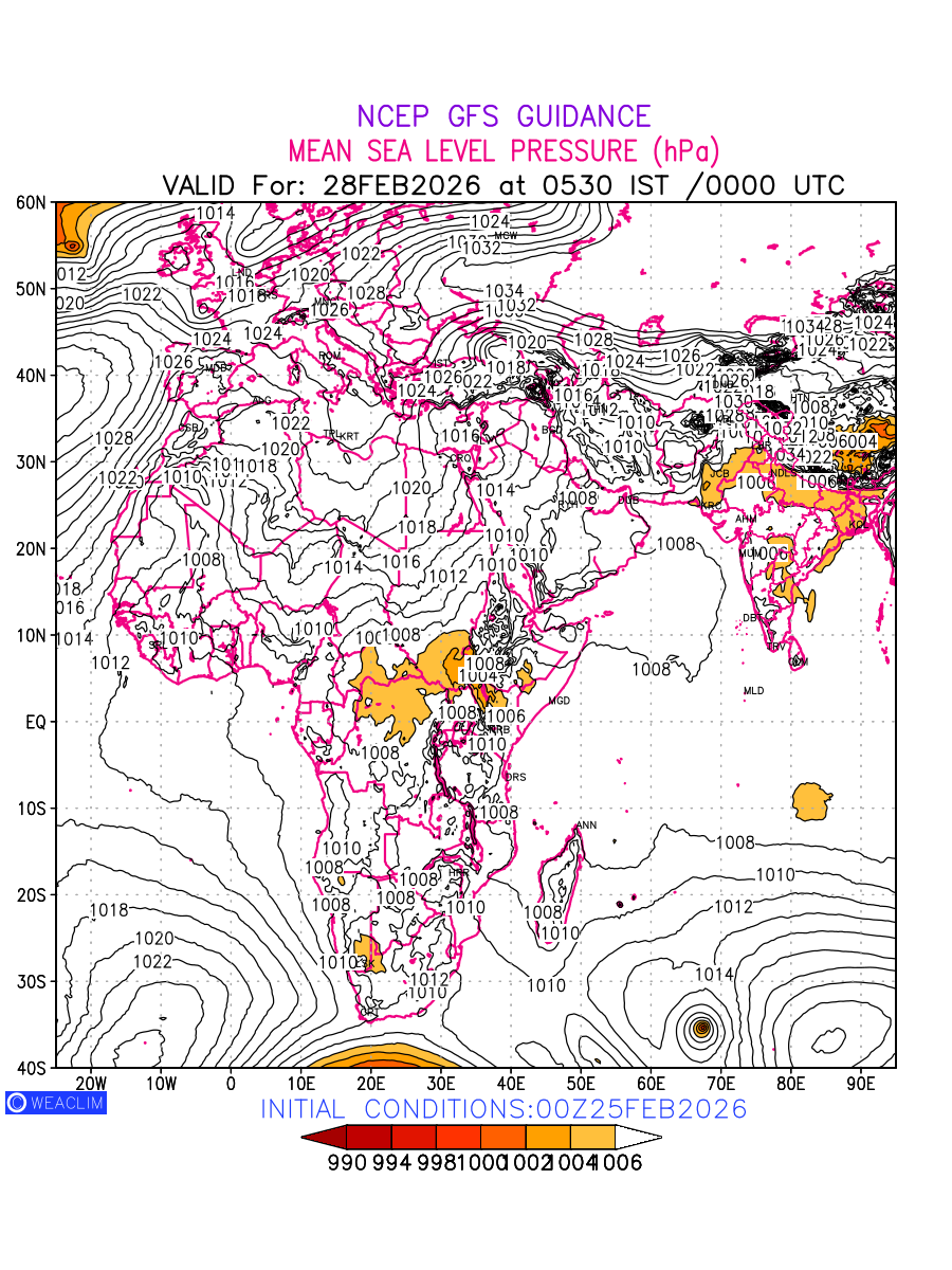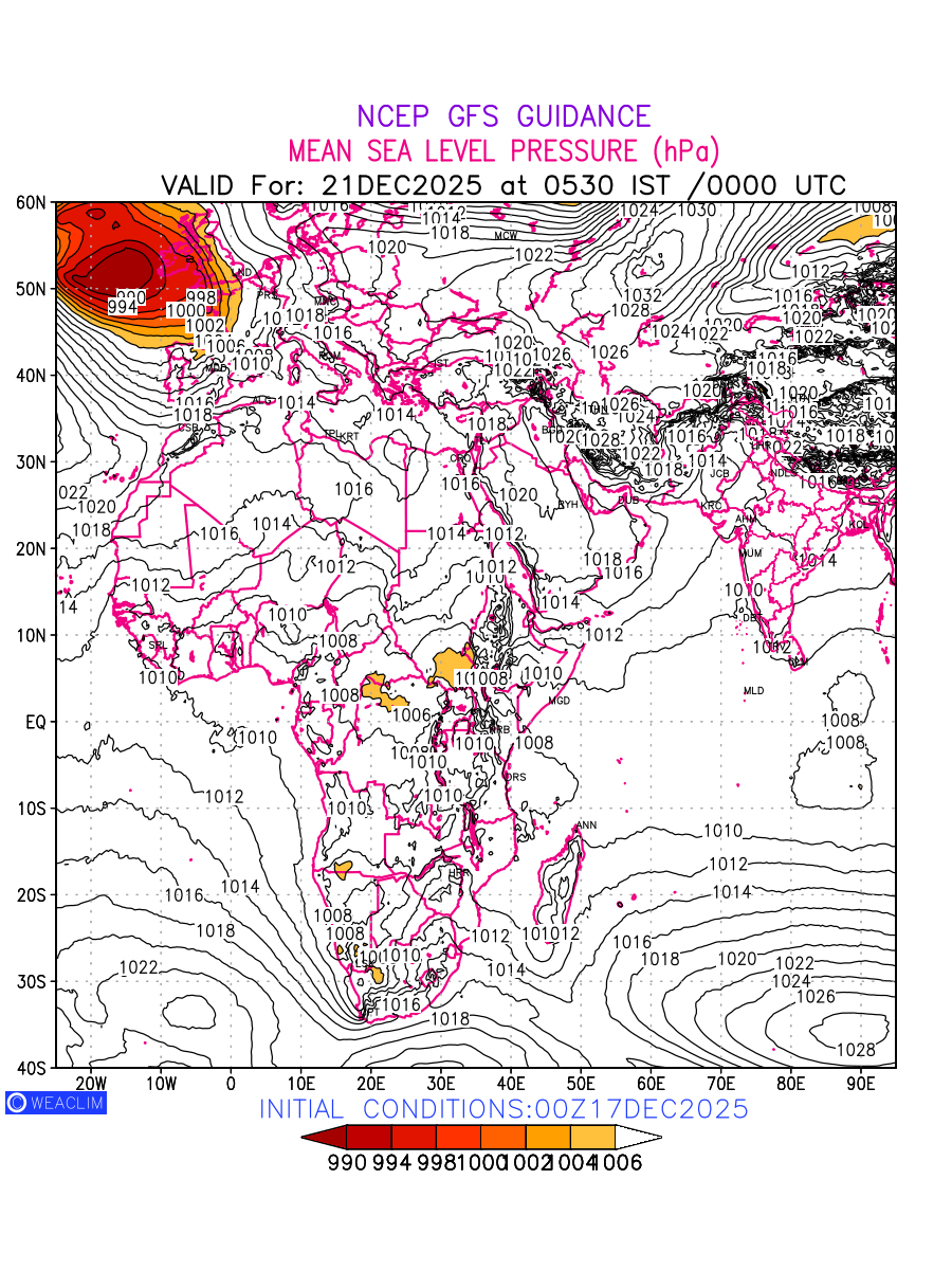 Mean Sea Level Pressure (MSLP) charts at the 24th hour for Africa typically show a color-coded contour map of atmospheric pressure at sea level, with lines of equal pressure (isobars) indicating areas of high and low pressure over a geographic area. Meteorologists use these charts to identify areas of high and low pressure, which can give indications of storms, cold fronts, or warm fronts. The MSLP charts are also useful in identifying areas of convergence and divergence in the atmosphere, which can influence the formation or decay of weather systems.