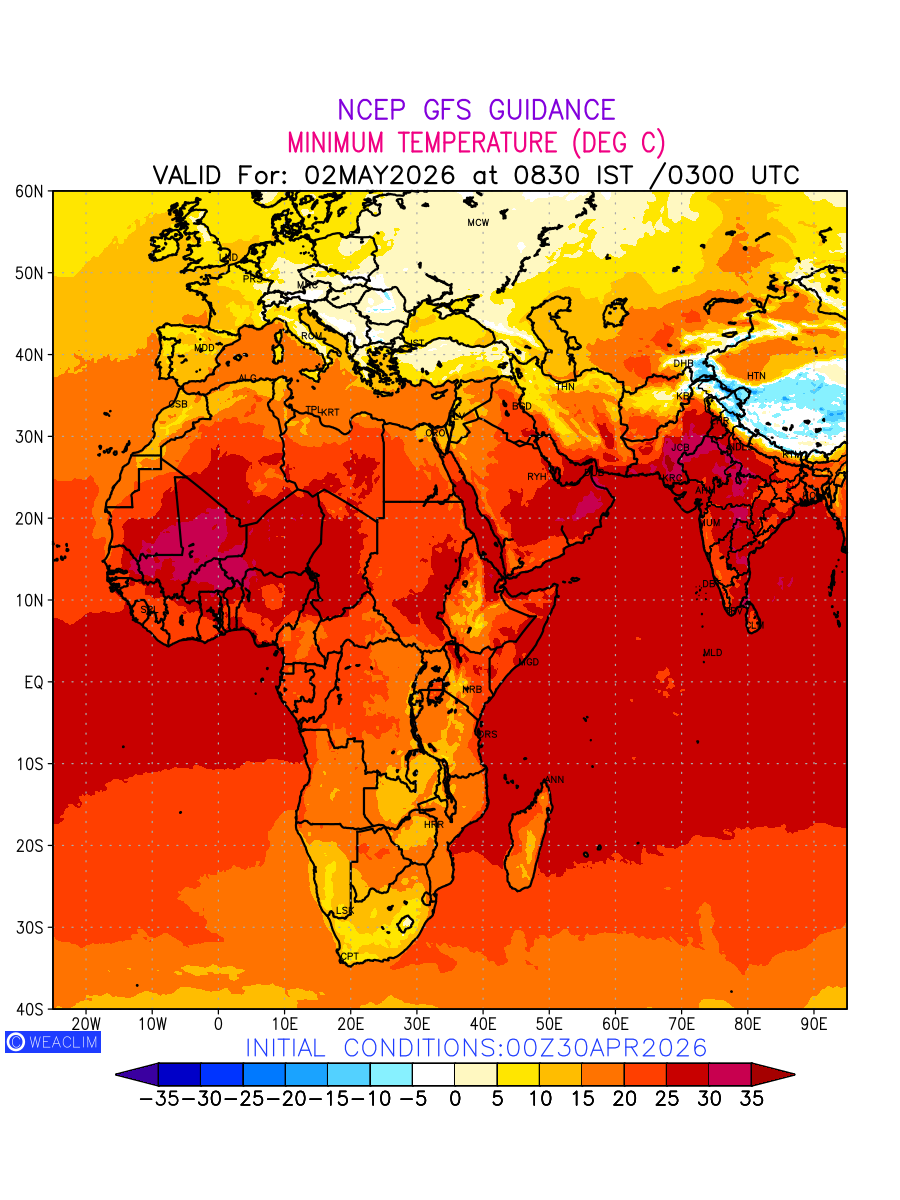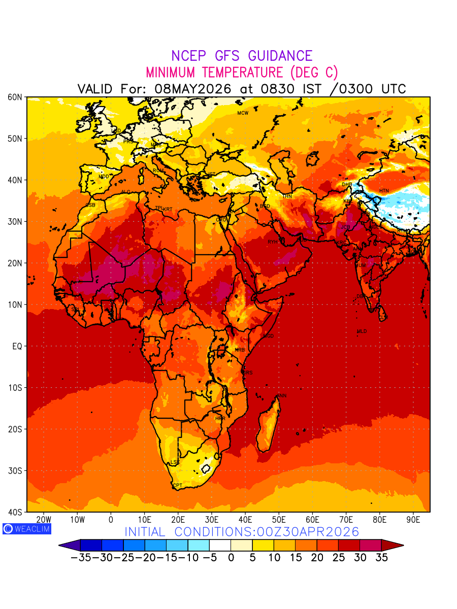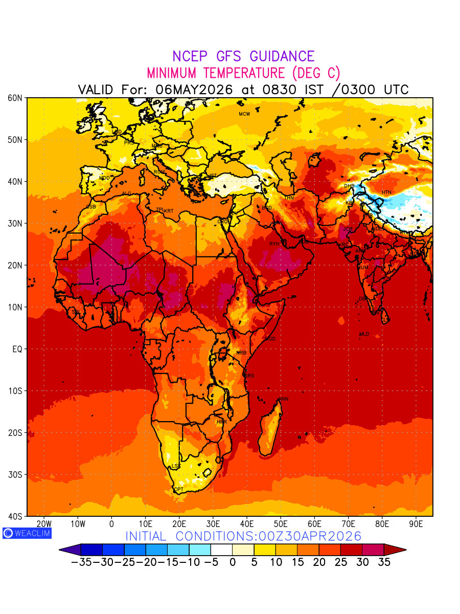 Minimum Temperature for Africa depicts the highest temperatures at 2m above the ground surface between 0300 UTC of the previous date to 0300 UTC of the required date. This is an important variable for weather forecasting, as it determines the conditions at the Earth’s surface during the coldest part of the date, affecting human activities, agriculture, and the environment. 2m Temperature data can be used for a variety of applications, such as predicting the onset of cold spells, forecasting temperature trends, and studying the impact of weather on various systems and processes.