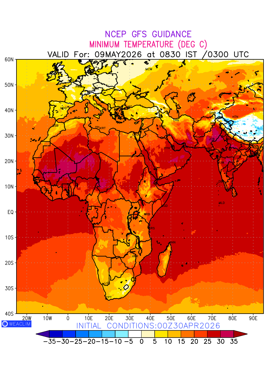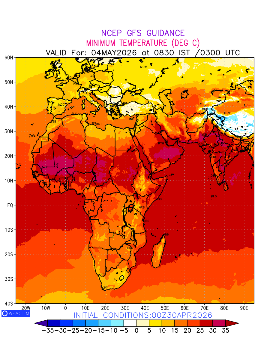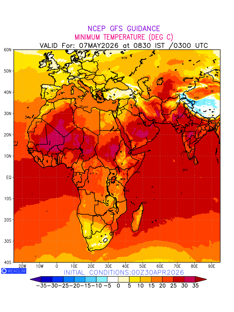 Minimum Temperature for Africa depicts the highest temperatures at 2m above the ground surface between 0300 UTC of the previous date to 0300 UTC of the required date. This is an important variable for weather forecasting, as it determines the conditions at the Earth’s surface during the coldest part of the date, affecting human activities, agriculture, and the environment. 2m Temperature data can be used for a variety of applications, such as predicting the onset of cold spells, forecasting temperature trends, and studying the impact of weather on various systems and processes.