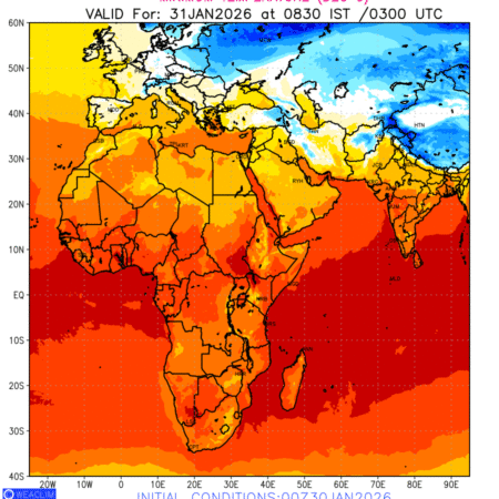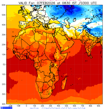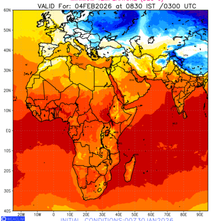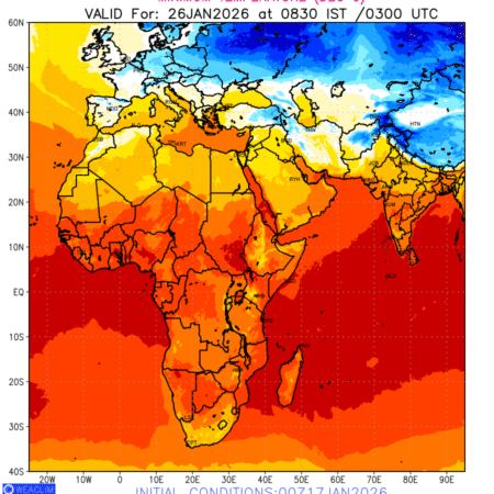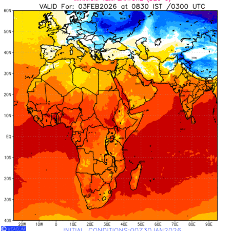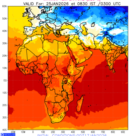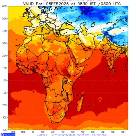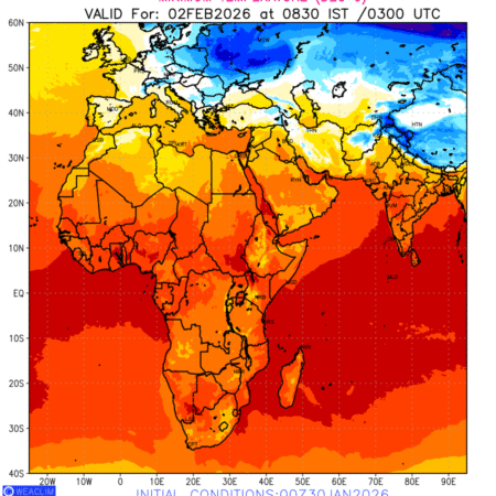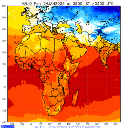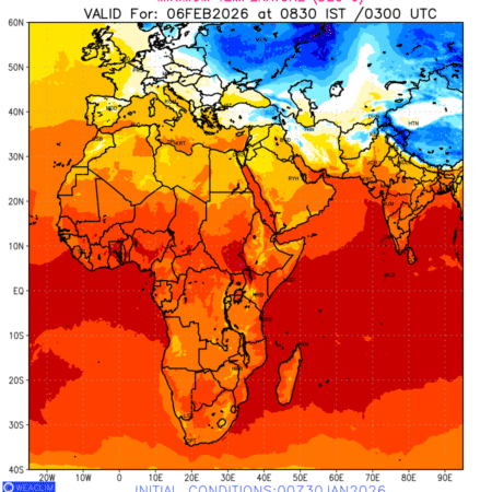Minimum Temperature for Africa depicts the highest temperatures at 2m above the ground surface between 0300 UTC of the previous date to 0300 UTC of the required date. This is an important variable for weather forecasting, as it determines the conditions at the Earth’s surface during the coldest part of the date, affecting human activities, agriculture, and the environment. 2m Temperature data can be used for a variety of applications, such as predicting the onset of cold spells, forecasting temperature trends, and studying the impact of weather on various systems and processes.