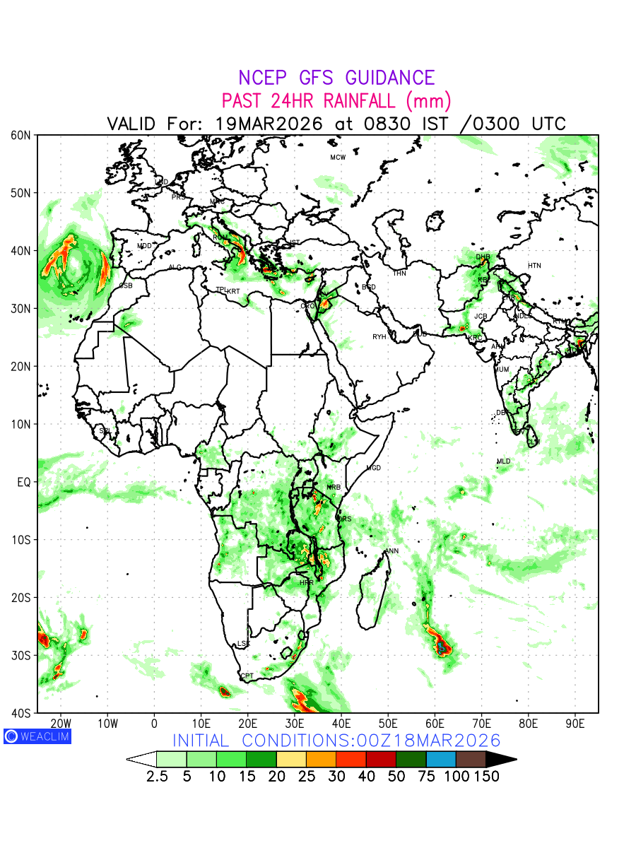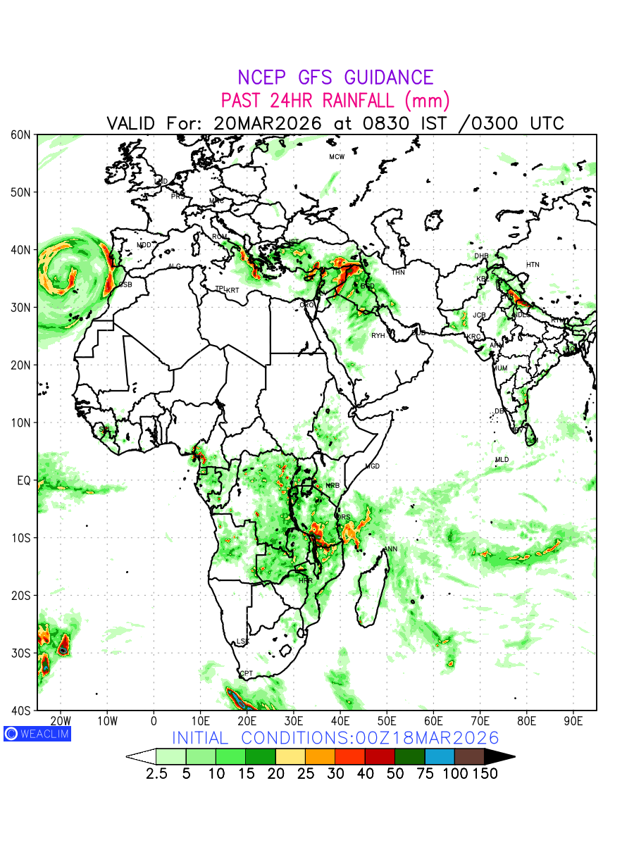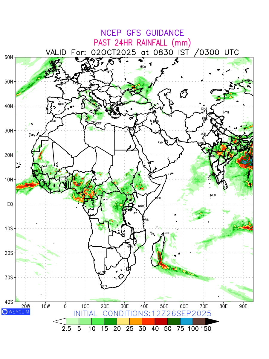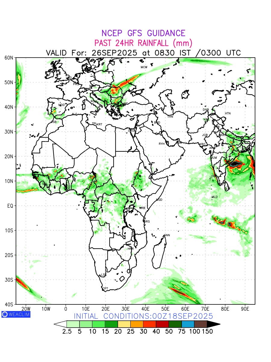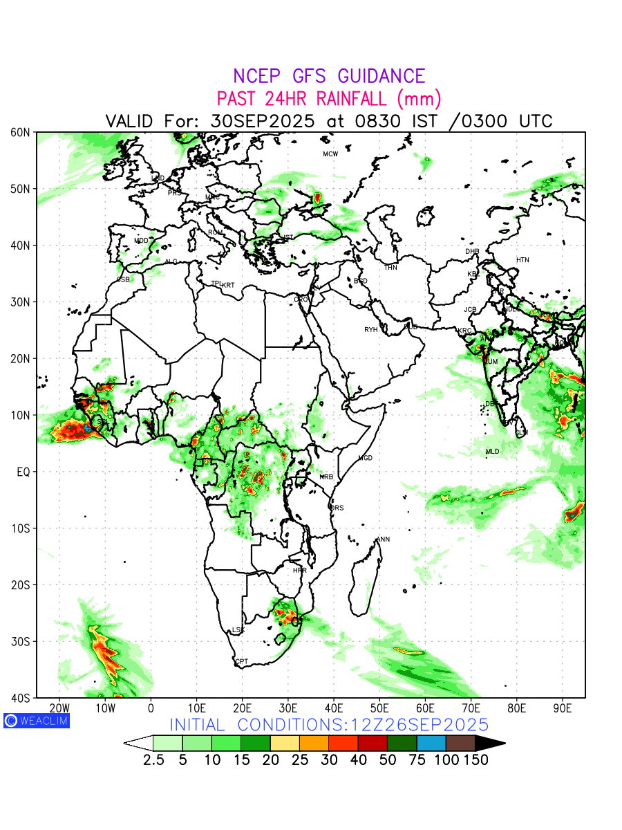 Rainfall forecast for 24 hours for Africa is expected amount of precipitation in millimeters for a given area over a time period of 24 hours and valid from 0300 UTC (0830 IST) of the previous date to 0300 UTC of the required date. This prediction enables the users to plan/review their tasks that are affected by rainfall related severe weather events that may lead to flooding, drought, snowfall and avalanche etc.