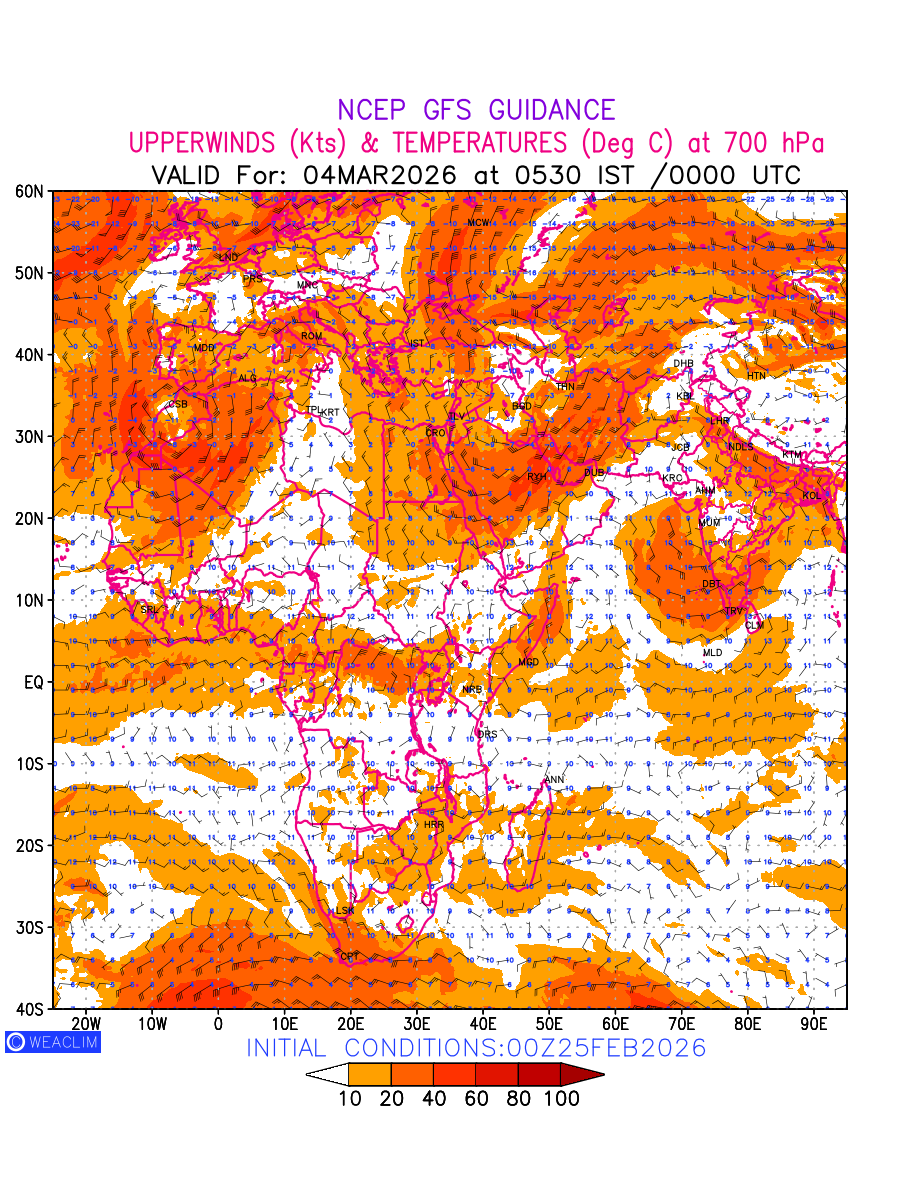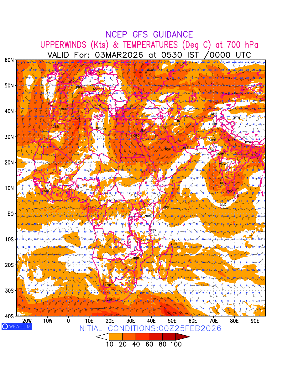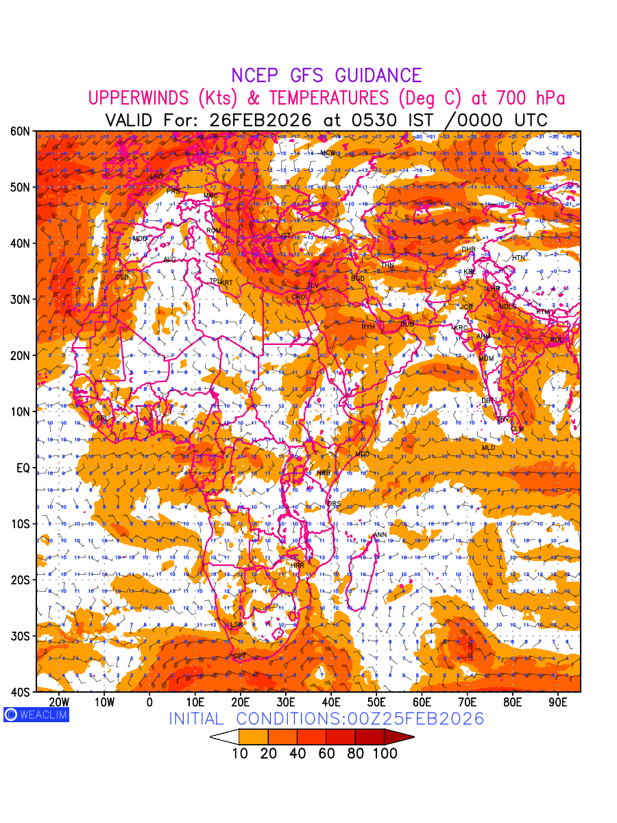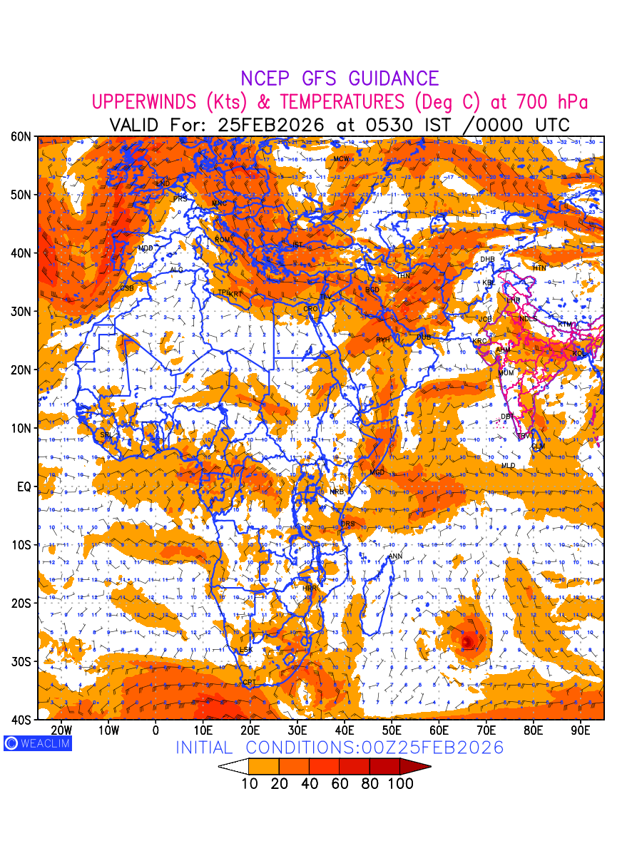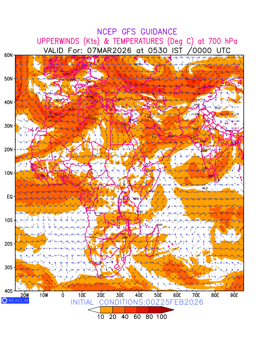 Winds at 700 hPa at the 24th hour for Africa refers to the predicted wind direction and speed at a pressure level of 700 hPa, which is located in the middle troposphere (approximately 3,000 meters or 10,000 feet above the Earths surface). The winds are presented in knots (kt), and the direction is given in degrees from true north. Winds with magnitude of more than 20 kt are marked in shades of red. At this level, the wind speed and direction can influence the movement and development of weather systems such as storms, fronts, and high-pressure systems.The depiction also shows the temperature along with the wind barb on the grid points at 700 hPa. Along with the wind speed (kt) and direction, upper air temperatures (Deg C) are also shown at the grid points over the African Region at 700 hPa level for the next ten days.