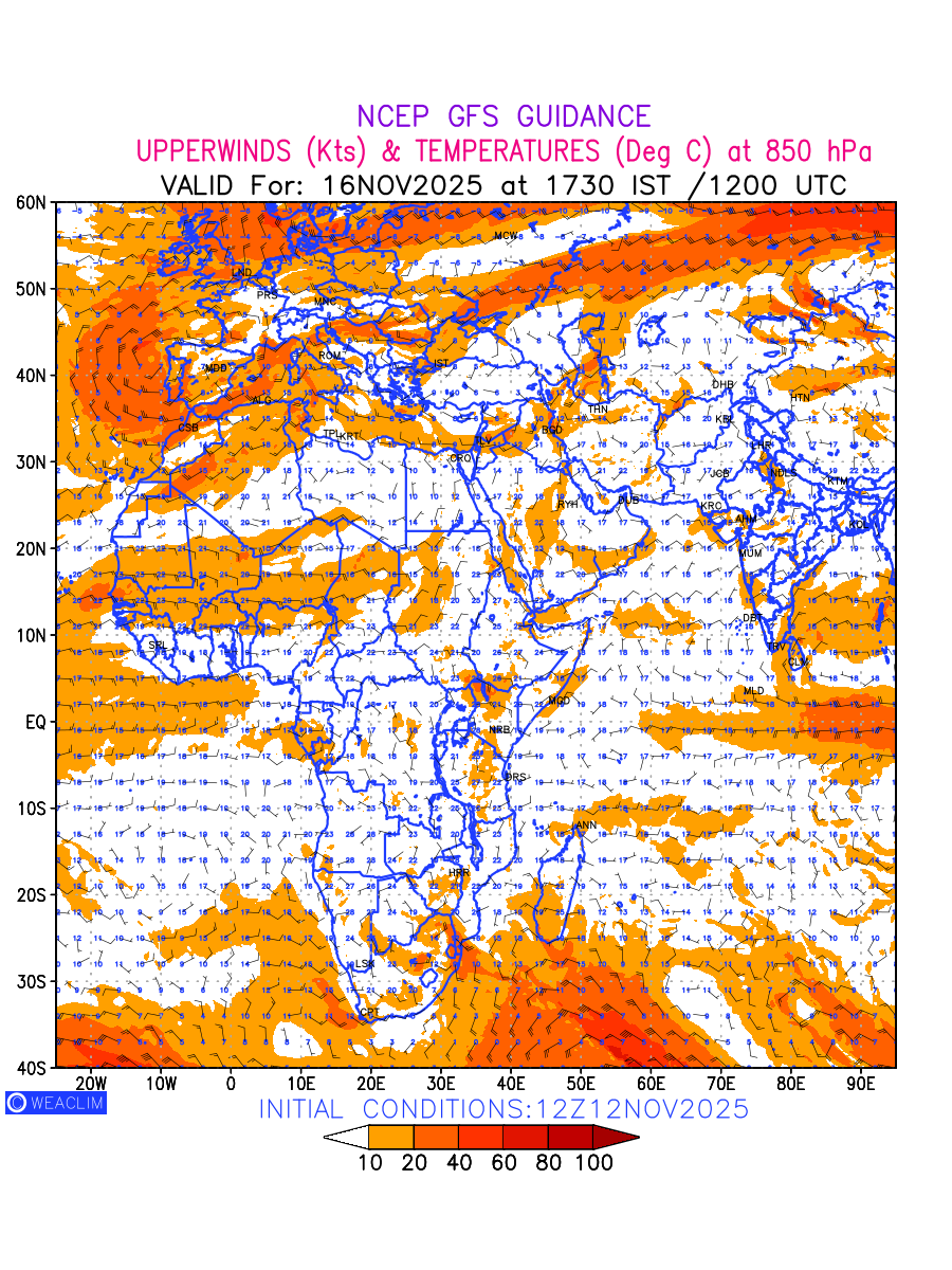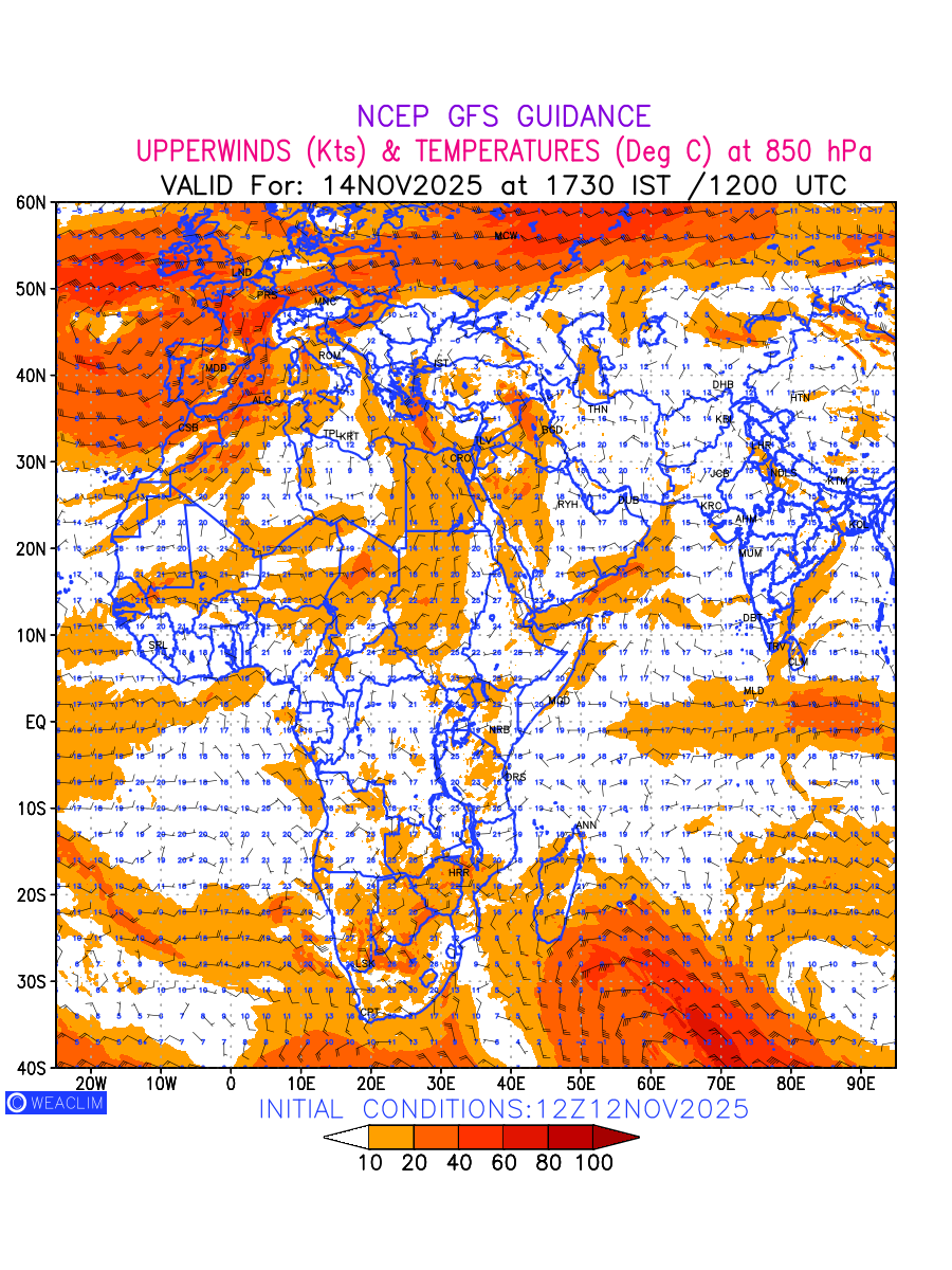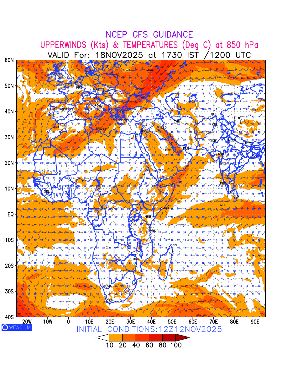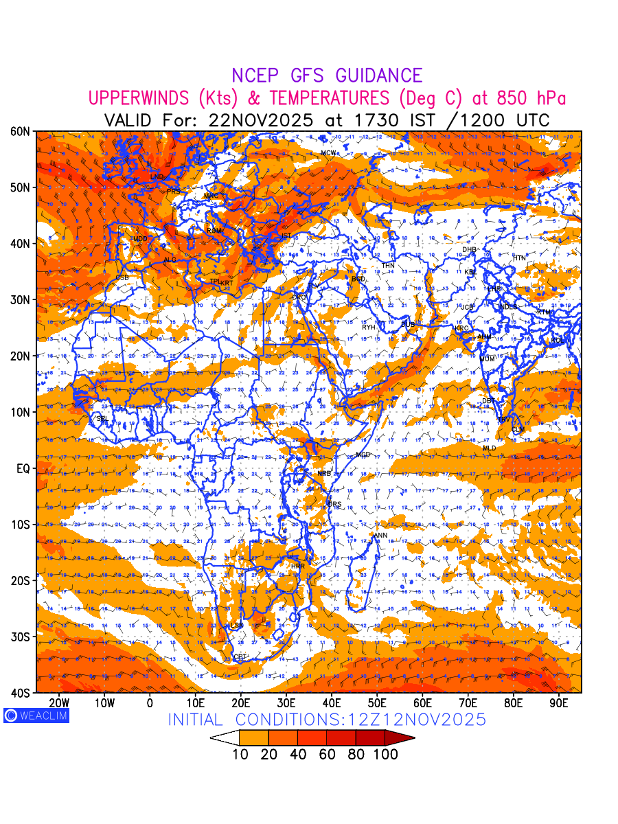 Winds at 850 hPa at the 24 th hour for Africa refers to the predicted wind direction and speed at a pressure level of 850 hPa, which is located in the lower troposphere (1,500 meters or 5,000 feet above the Earth’s surface).The winds are presented in knots (kt), and the direction is given in degrees from true north. Winds with magnitude of more than 20 kt are marked in shades of red. Being close to the Earth’s surface it is strongly influenced by surface features such as mountains, valleys, and bodies of water. It gives insight into the strength and direction of wind flow in the lower troposphere, affecting the movement of weather systems and the transport of heat, moisture, and pollutants in the atmosphere. Depiction also shows the temperature along with the wind barb on the grid points at 850 hPa. Along with the wind speed (kt) and direction, upper air temperatures (Deg C) are also shown at the grid points over the African Region at 850 hPa level for the next ten days.