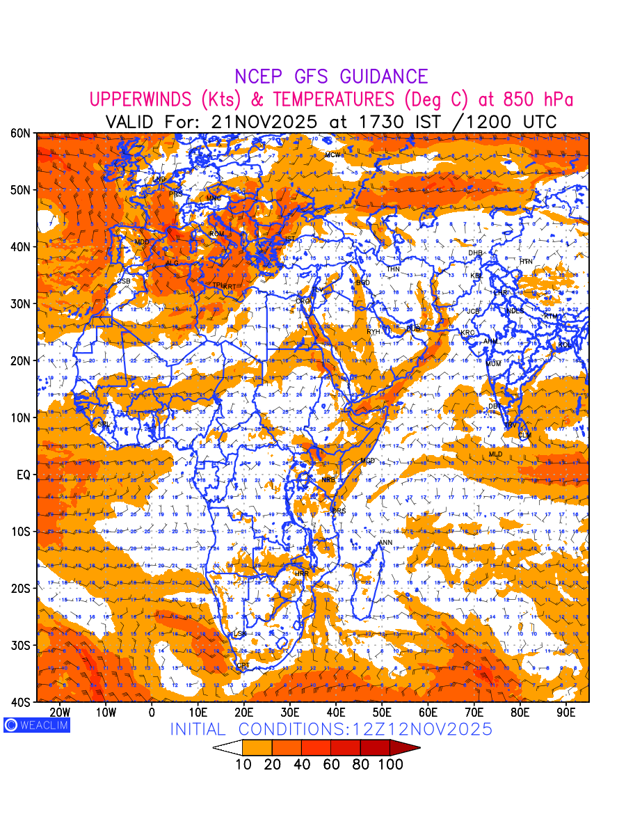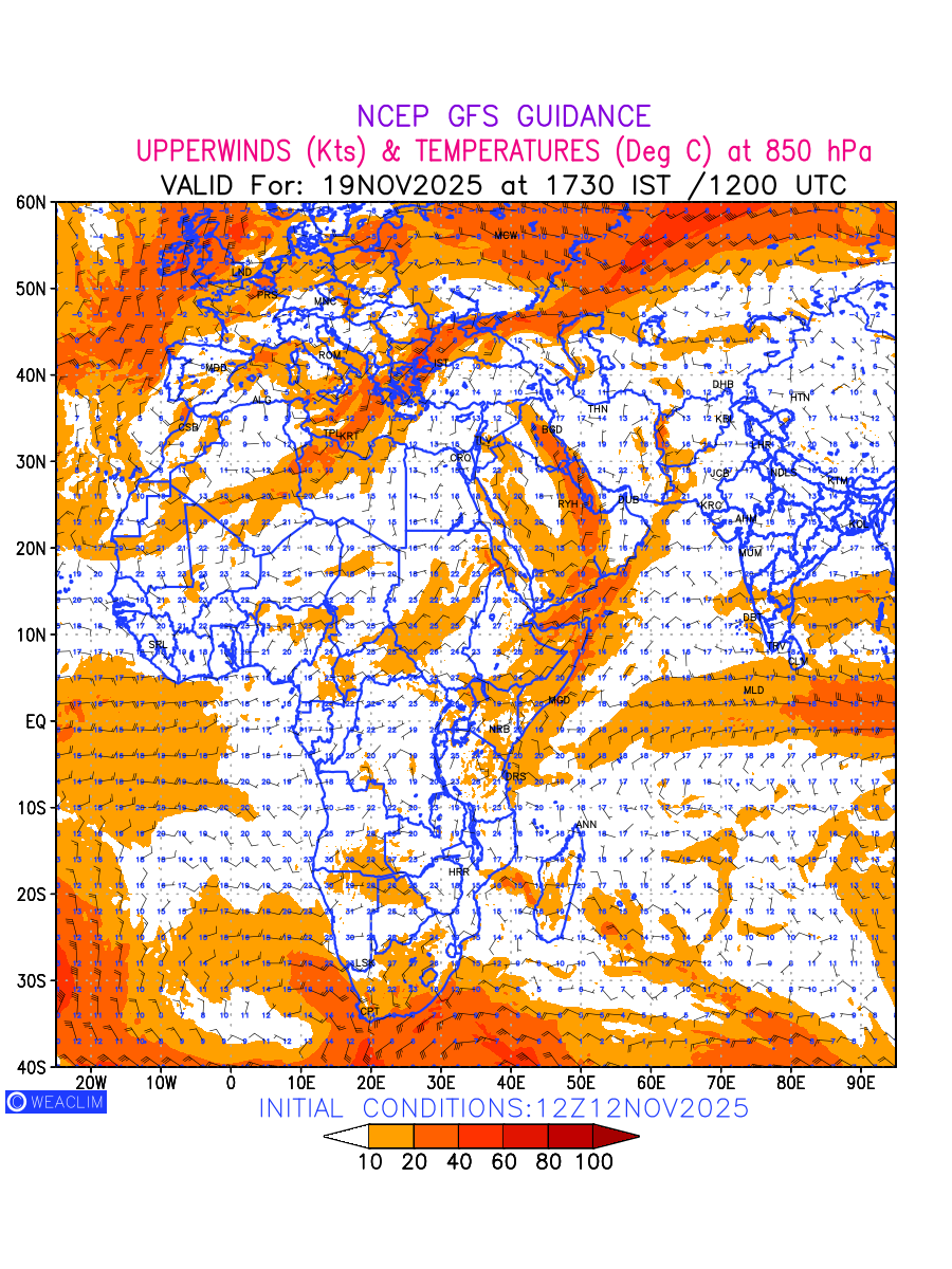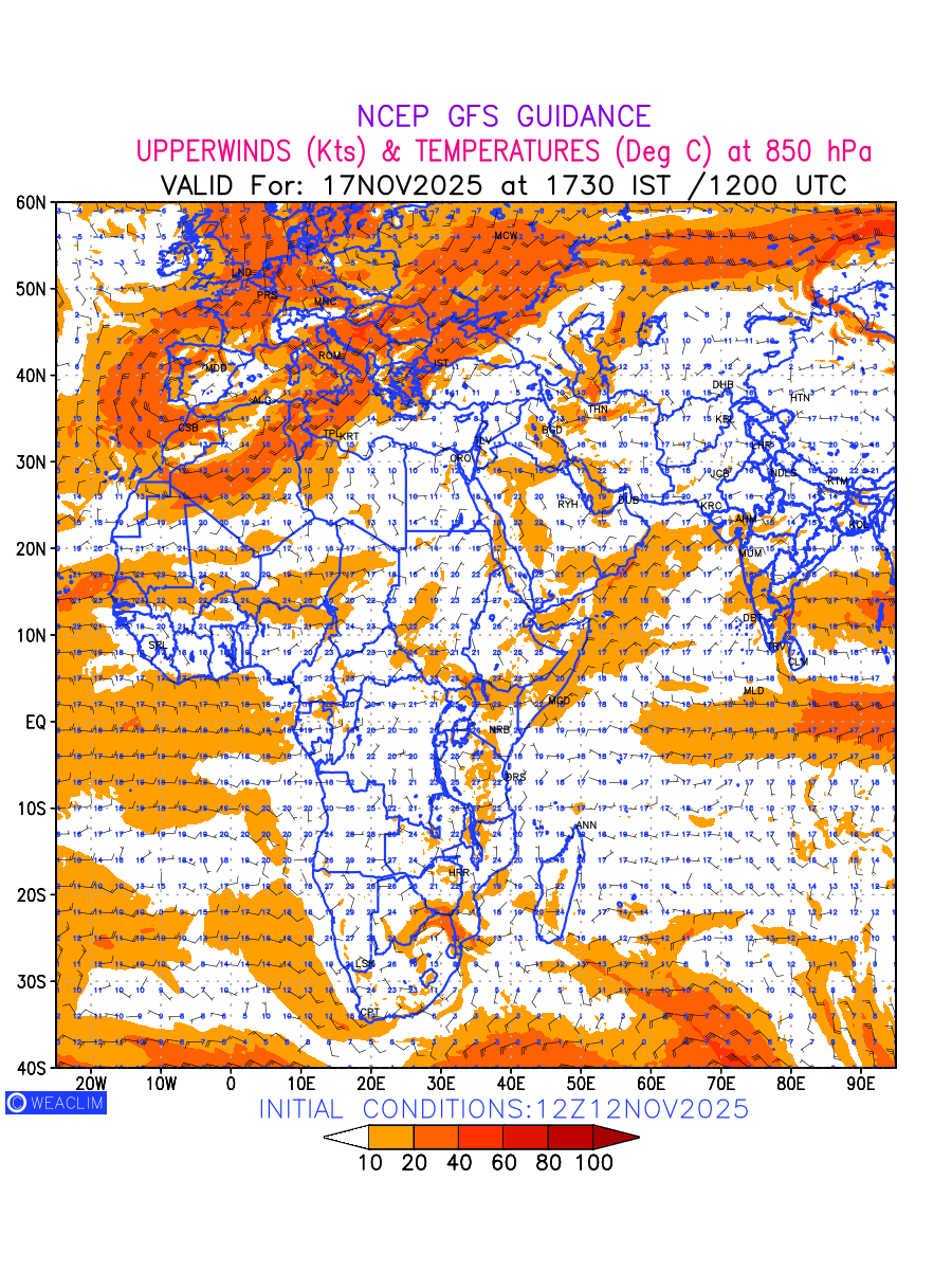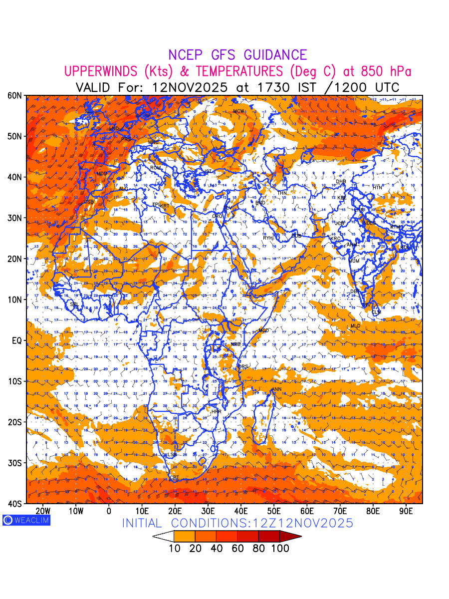 Winds at 850 hPa at the 24 th hour for Africa refers to the predicted wind direction and speed at a pressure level of 850 hPa, which is located in the lower troposphere (1,500 meters or 5,000 feet above the Earth’s surface).The winds are presented in knots (kt), and the direction is given in degrees from true north. Winds with magnitude of more than 20 kt are marked in shades of red. Being close to the Earth’s surface it is strongly influenced by surface features such as mountains, valleys, and bodies of water. It gives insight into the strength and direction of wind flow in the lower troposphere, affecting the movement of weather systems and the transport of heat, moisture, and pollutants in the atmosphere. Depiction also shows the temperature along with the wind barb on the grid points at 850 hPa. Along with the wind speed (kt) and direction, upper air temperatures (Deg C) are also shown at the grid points over the African Region at 850 hPa level for the next ten days.