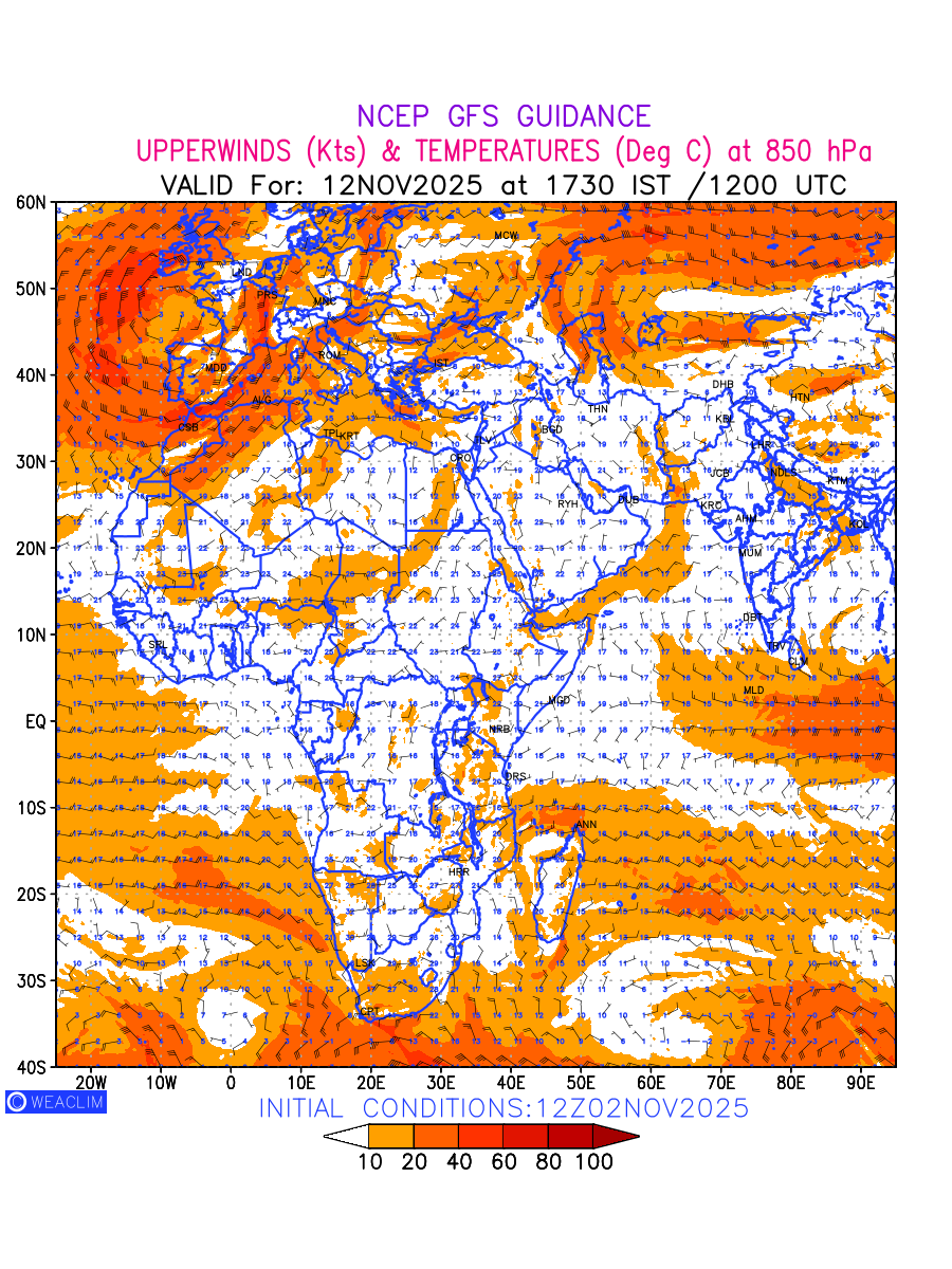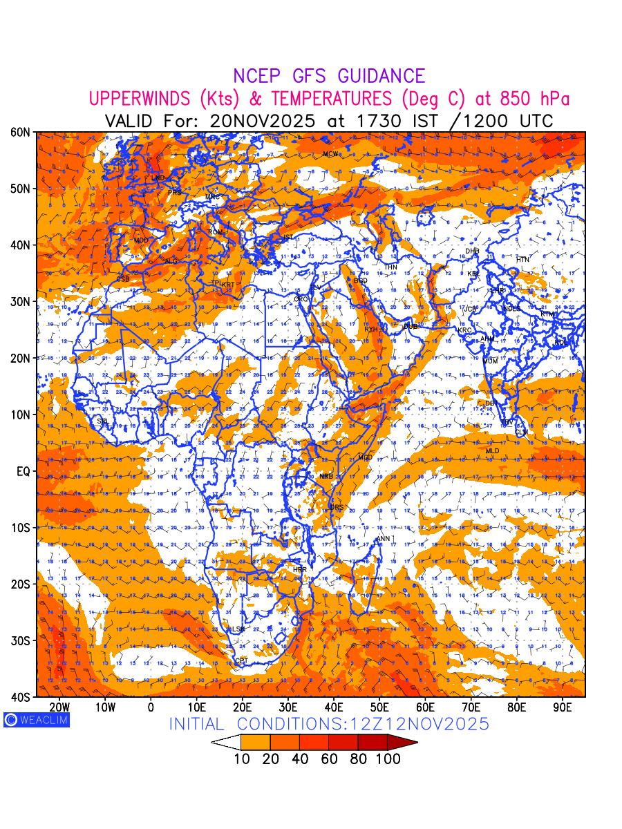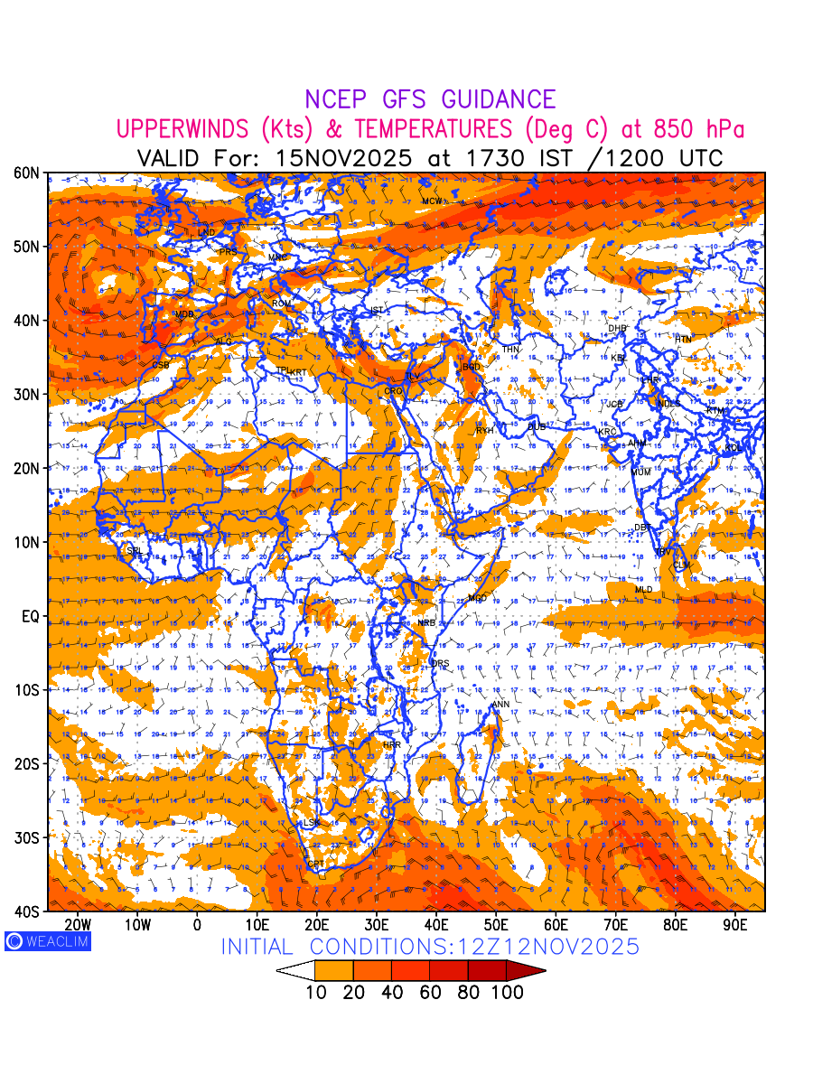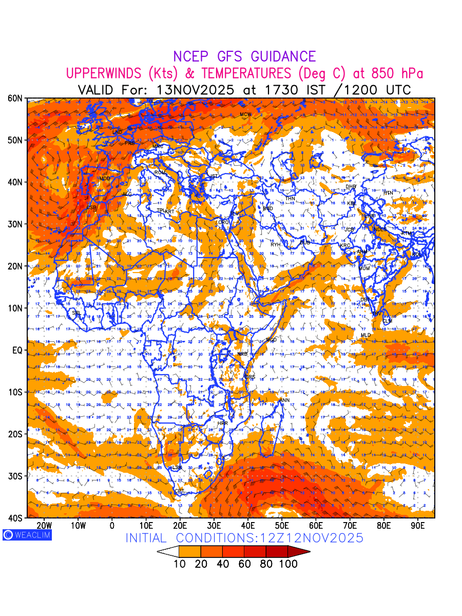 Winds at 850 hPa at the 24 th hour for Africa refers to the predicted wind direction and speed at a pressure level of 850 hPa, which is located in the lower troposphere (1,500 meters or 5,000 feet above the Earth’s surface).The winds are presented in knots (kt), and the direction is given in degrees from true north. Winds with magnitude of more than 20 kt are marked in shades of red. Being close to the Earth’s surface it is strongly influenced by surface features such as mountains, valleys, and bodies of water. It gives insight into the strength and direction of wind flow in the lower troposphere, affecting the movement of weather systems and the transport of heat, moisture, and pollutants in the atmosphere. Depiction also shows the temperature along with the wind barb on the grid points at 850 hPa. Along with the wind speed (kt) and direction, upper air temperatures (Deg C) are also shown at the grid points over the African Region at 850 hPa level for the next ten days.