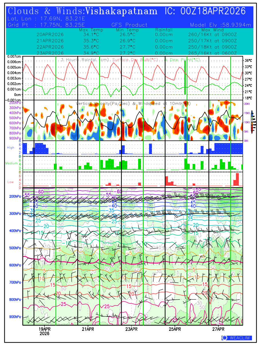 Location Specific Forecasts or Meteograms are graphics that display predicted meteorological data over time for a particular location. They provide a convenient way to quickly visualize and interpret complex weather data, allowing users to make informed decisions based on the latest weather information. These predictions are customised to a time frame with validity of ten days from the date of issue. First Panel at the bottom is the time height representation of the atmospheric profile from surface to 100 hPa level showing the magnitude and direction of winds through wind barbs, isotherm of temperature with freezing level depicted in black and the relative humidity contoured and shaded in green. Second, third and fourth panels show the oktas of low, medium and high clouds in red, green and blue colors, respectively. The fifth panel shows time height representation of Vertical Velocity (ω in Pa/Sec) contoured in shaded colors and the wind speed at 10 meters (kt). Vertical velocity shows the magnitude of verti al winds with negative values showing upward movement (causing formation of convective clouds) and positive values showing downward movement (leading to clear skies) of the airmass at the selected location. The sixth panel shows the Hourly Rainfall (in cm) along with Surface Dry Bulb and Dew Point Temperatures ( o C) over the time period of next ten days. The seventh panel shows the values of predicted Maximum and Minimum Temperature ( o C), Rainfall amount (in cm) and time of Maximum Winds (kt) expected during the next three days.The eighth panel at the top gives the general information on name of the selected location, time of initial conditions (in UTC), latitude and longitude of the location and its model elevation.