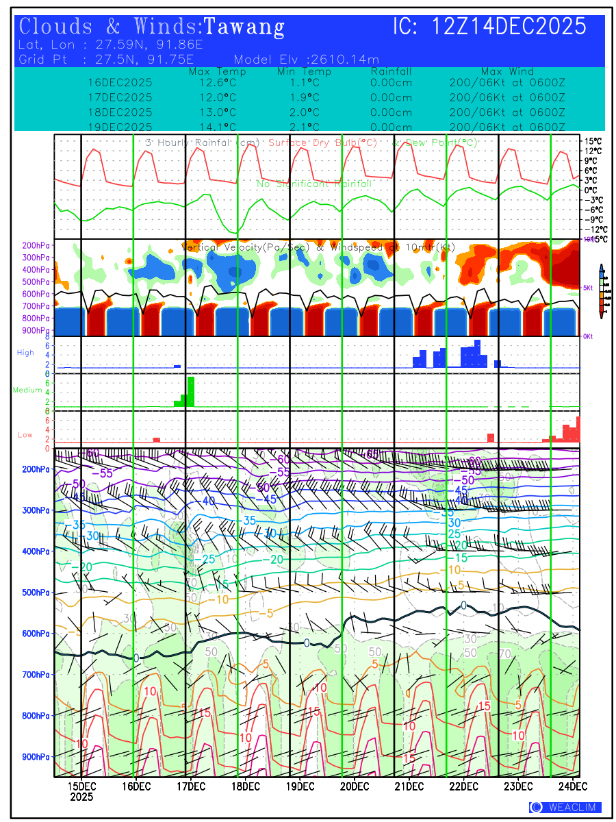 Location Specific Forecasts or Meteograms are graphics that display predicted meteorological data over time for a particular location. They provide a convenient way to quickly visualize and interpret complex weather data, allowing users to make informed decisions based on the latest weather information. These predictions are customised to a time frame with validity of ten days from the date of issue. First Panel at the bottom is the time height representation of the atmospheric profile from surface to 100 hPa level showing the magnitude and direction of winds through wind barbs, isotherm of temperature with freezing level depicted in black and the relative humidity contoured and shaded in green. Second, third and fourth panels show the oktas of low, medium and high clouds in red, green and blue colors, respectively. The fifth panel shows time height representation of Vertical Velocity (ω in Pa/Sec) contoured in shaded colors and the wind speed at 10 meters (kt). Vertical velocity shows the magnitude of verti al winds with negative values showing upward movement (causing formation of convective clouds) and positive values showing downward movement (leading to clear skies) of the airmass at the selected location. The sixth panel shows the Hourly Rainfall (in cm) along with Surface Dry Bulb and Dew Point Temperatures ( o C) over the time period of next ten days. The seventh panel shows the values of predicted Maximum and Minimum Temperature ( o C), Rainfall amount (in cm) and time of Maximum Winds (kt) expected during the next three days.The eighth panel at the top gives the general information on name of the selected location, time of initial conditions (in UTC), latitude and longitude of the location and its model elevation.