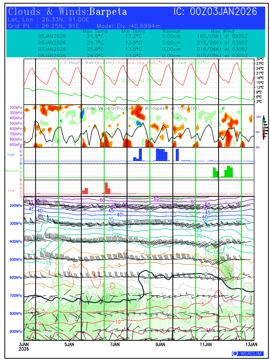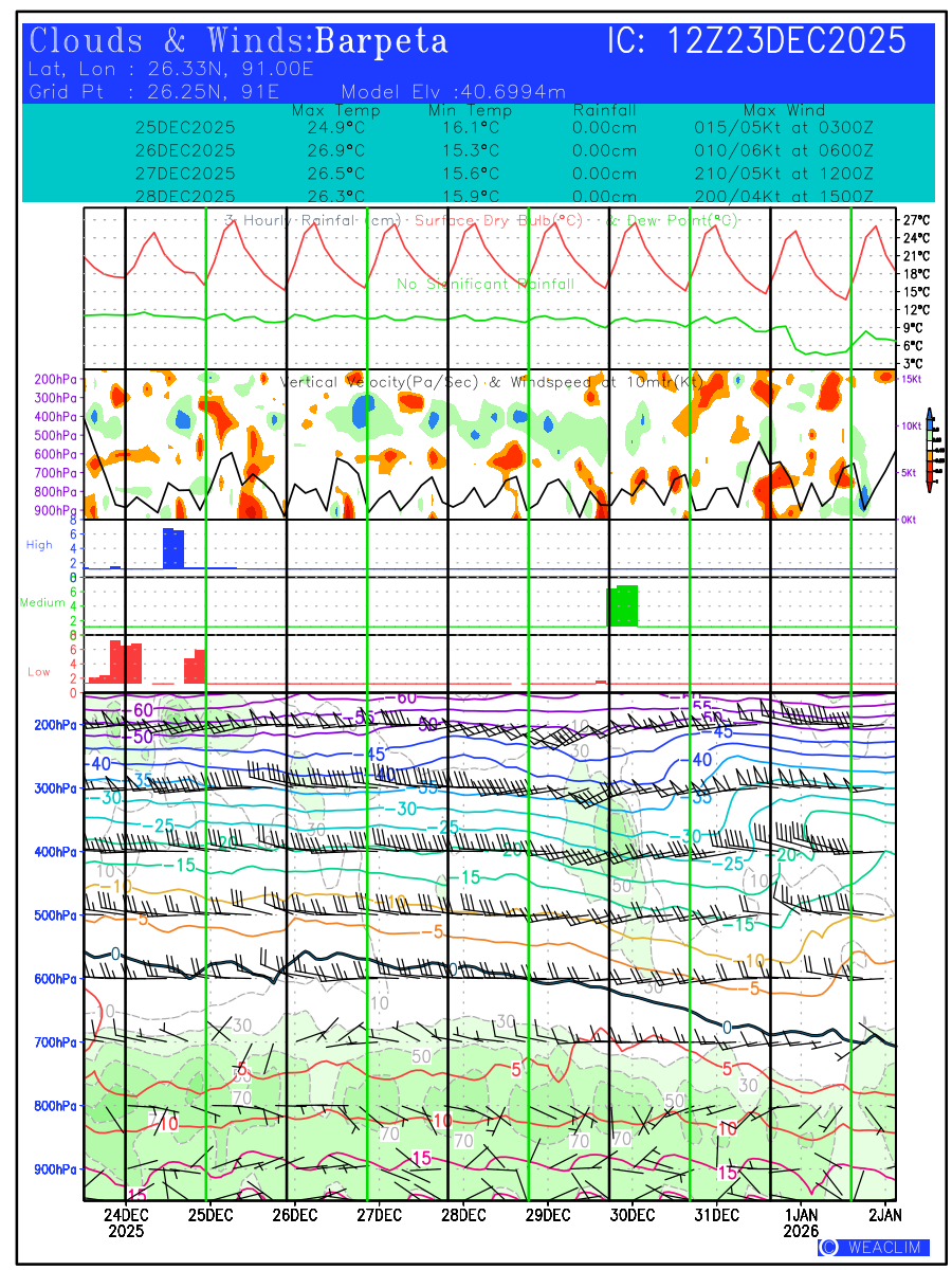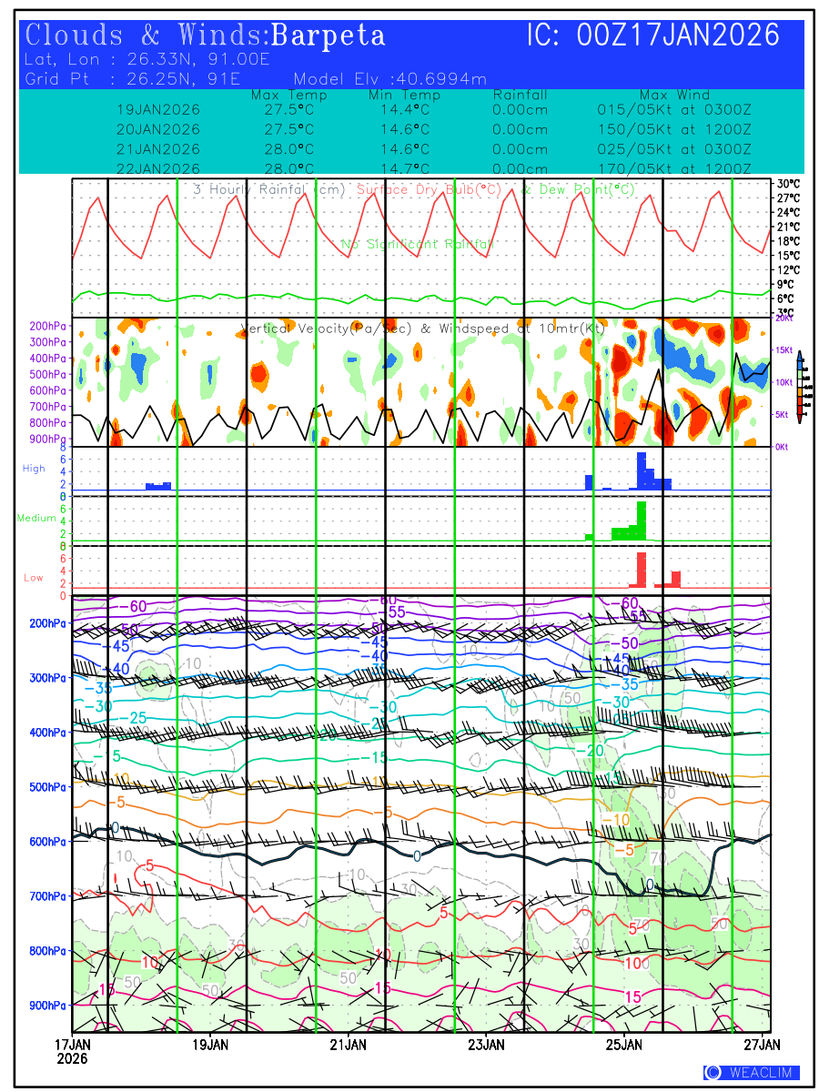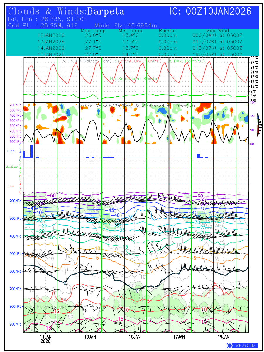 Location Specific Forecasts or Meteograms are graphics that display predicted meteorological data over time for a particular location. They provide a convenient way to quickly visualize and interpret complex weather data, allowing users to make informed decisions based on the latest weather information. These predictions are customised to a time frame with validity of ten days from the date of issue. First Panel at the bottom is the time height representation of the atmospheric profile from surface to 100 hPa level showing the magnitude and direction of winds through wind barbs, isotherm of temperature with freezing level depicted in black and the relative humidity contoured and shaded in green. Second, third and fourth panels show the oktas of low, medium and high clouds in red, green and blue colors, respectively. The fifth panel shows time height representation of Vertical Velocity (ω in Pa/Sec) contoured in shaded colors and the wind speed at 10 meters (kt). Vertical velocity shows the magnitude of verti al winds with negative values showing upward movement (causing formation of convective clouds) and positive values showing downward movement (leading to clear skies) of the airmass at the selected location. The sixth panel shows the Hourly Rainfall (in cm) along with Surface Dry Bulb and Dew Point Temperatures ( o C) over the time period of next ten days. The seventh panel shows the values of predicted Maximum and Minimum Temperature ( o C), Rainfall amount (in cm) and time of Maximum Winds (kt) expected during the next three days.The eighth panel at the top gives the general information on name of the selected location, time of initial conditions (in UTC), latitude and longitude of the location and its model elevation.