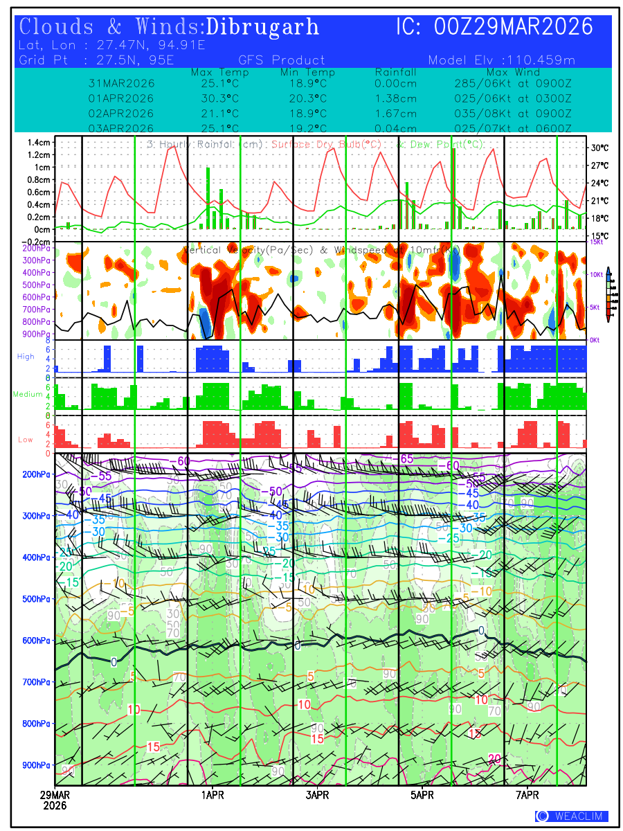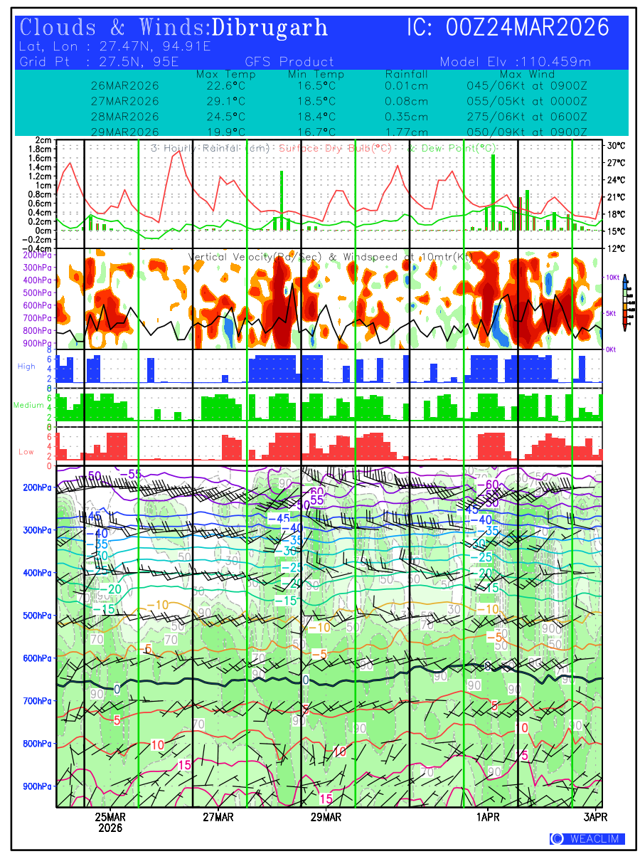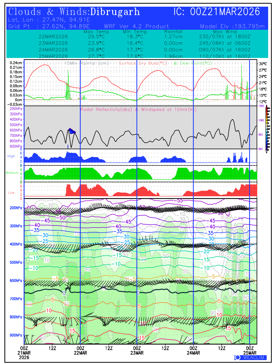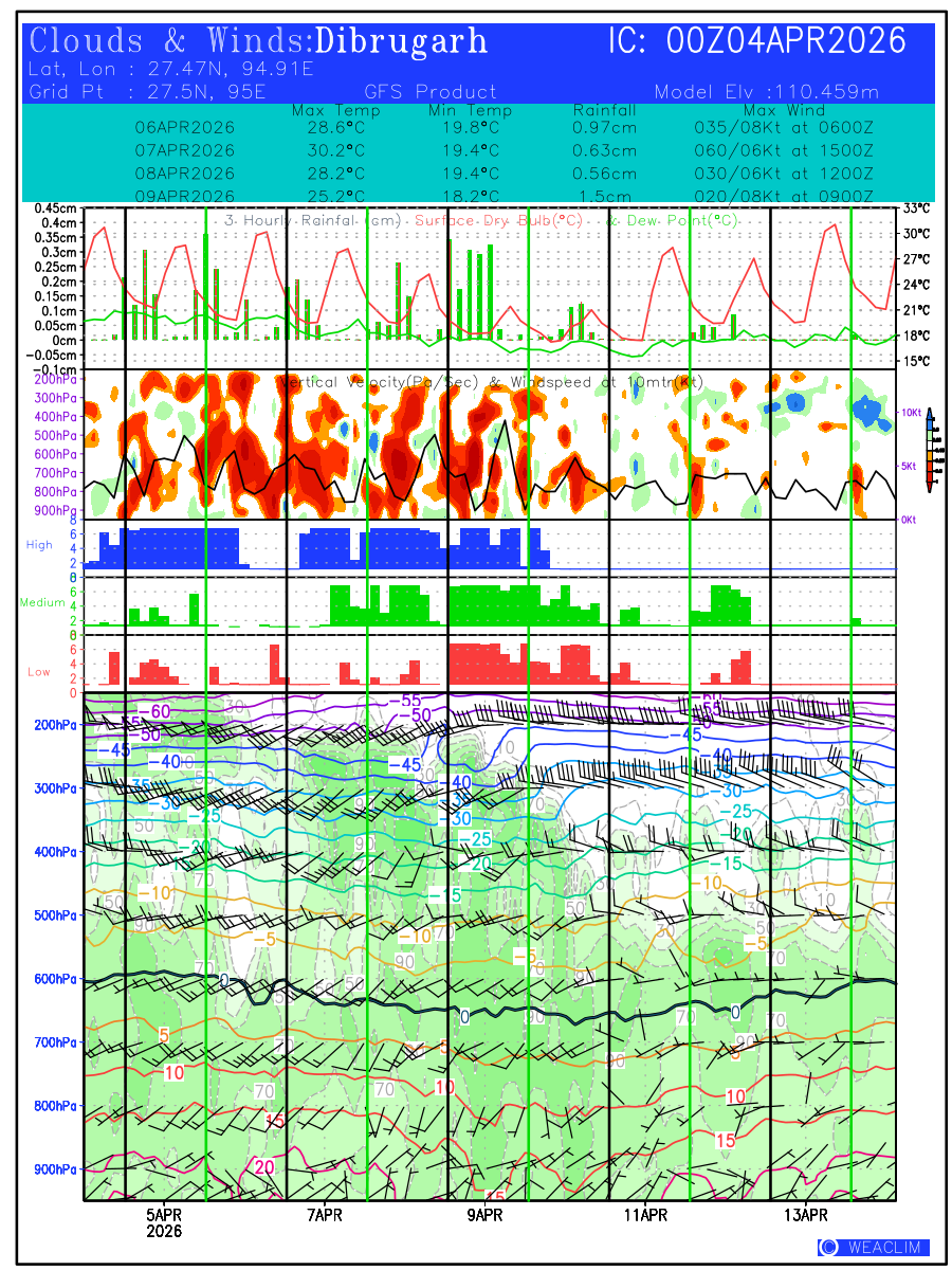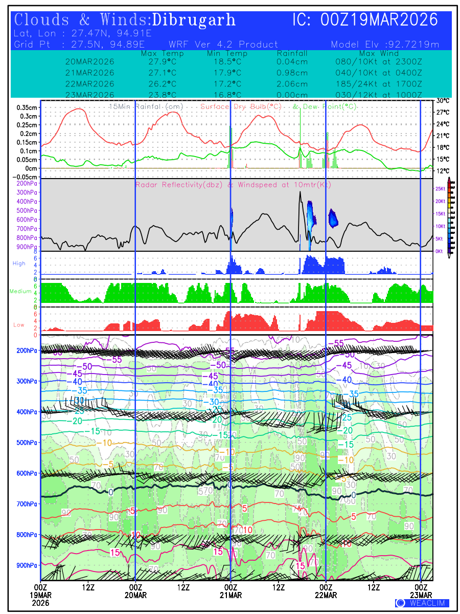 Location Specific Forecasts or Meteograms are graphics that display predicted meteorological data over time for a particular location. They provide a convenient way to quickly visualize and interpret complex weather data, allowing users to make informed decisions based on the latest weather information. These predictions are customised to a time frame with validity of ten days from the date of issue. First Panel at the bottom is the time height representation of the atmospheric profile from surface to 100 hPa level showing the magnitude and direction of winds through wind barbs, isotherm of temperature with freezing level depicted in black and the relative humidity contoured and shaded in green. Second, third and fourth panels show the oktas of low, medium and high clouds in red, green and blue colors, respectively. The fifth panel shows time height representation of Vertical Velocity (ω in Pa/Sec) contoured in shaded colors and the wind speed at 10 meters (kt). Vertical velocity shows the magnitude of verti al winds with negative values showing upward movement (causing formation of convective clouds) and positive values showing downward movement (leading to clear skies) of the airmass at the selected location. The sixth panel shows the Hourly Rainfall (in cm) along with Surface Dry Bulb and Dew Point Temperatures ( o C) over the time period of next ten days. The seventh panel shows the values of predicted Maximum and Minimum Temperature ( o C), Rainfall amount (in cm) and time of Maximum Winds (kt) expected during the next three days.The eighth panel at the top gives the general information on name of the selected location, time of initial conditions (in UTC), latitude and longitude of the location and its model elevation.
