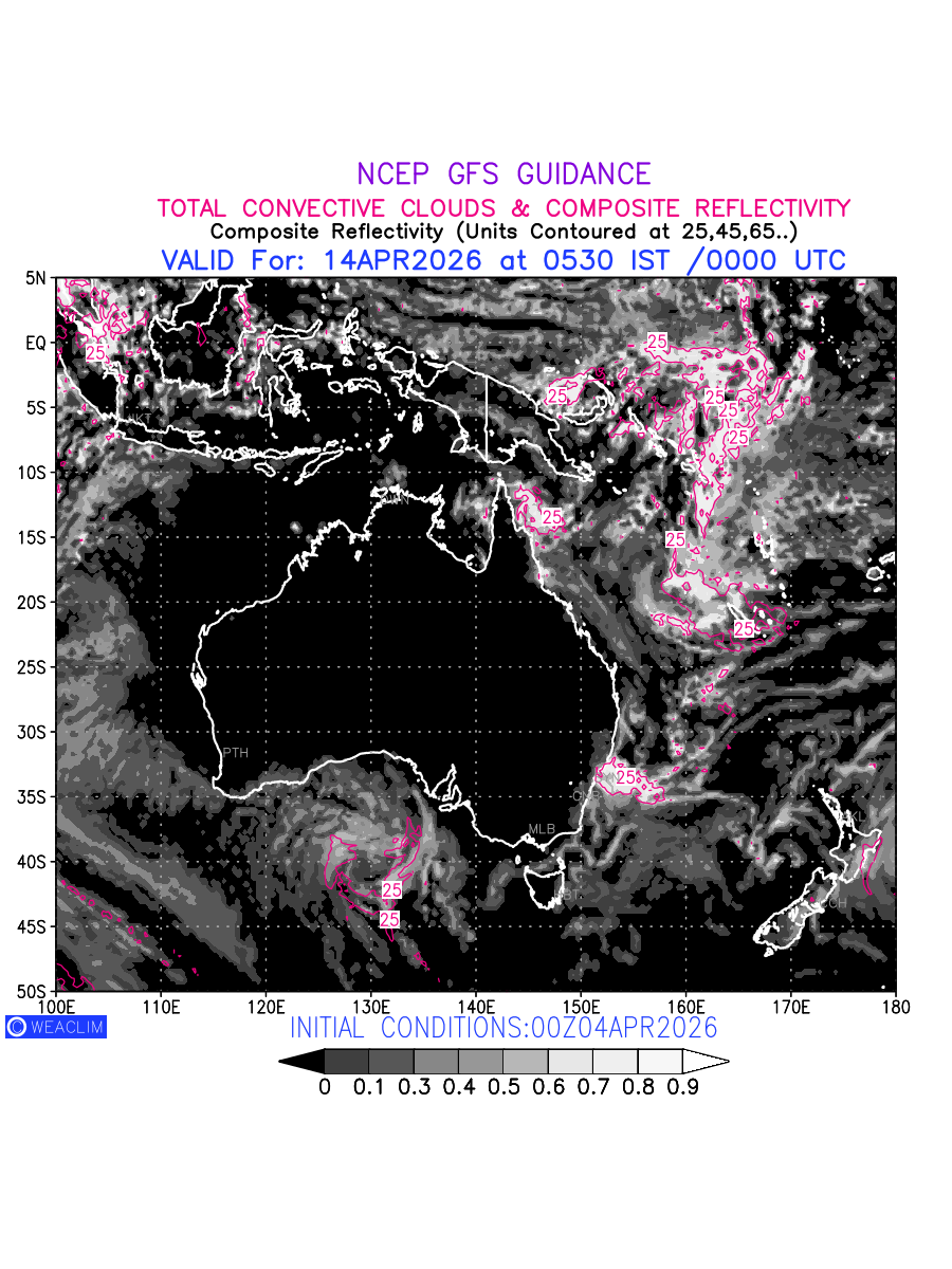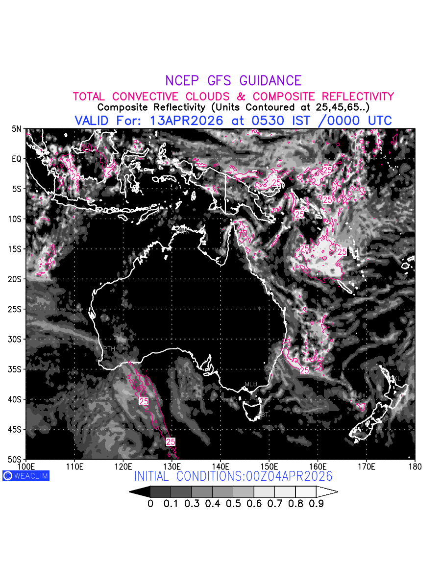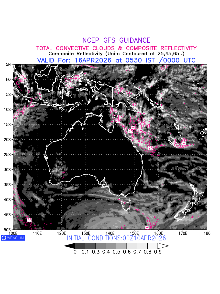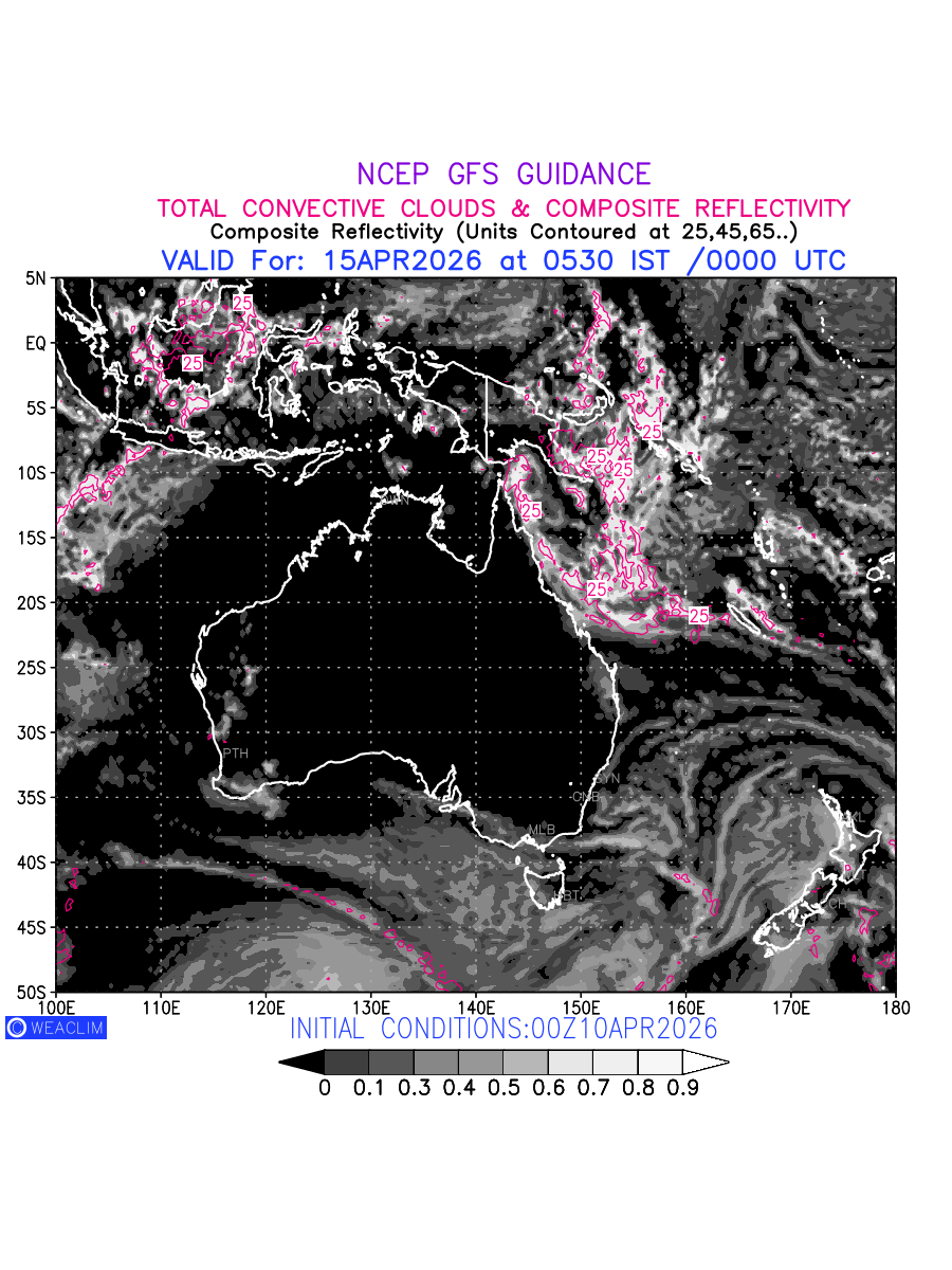 Convective clouds are formed by the vertical movement of air in the atmosphere and are associated with thunderstorms and other types of severe weather like intense rainfall, strong gusty winds etc. Shades from black to white on scale of 0 to 1 with whiter shade depicting more intensity of convection has been used in the depiction. Also shown is the Composite Reflectivity that takes the maximum reflectivity from each elevation angle of the Doppler Weather Radar and meshes it into one image. Advantage of this type of image is the ability to quickly assess the intensity of storms. Predicted pattern of Total Convective Clouds and percentage of the sky covered by them is shown here along with Composite Reflectivity for the Australian Region for the next ten days.