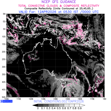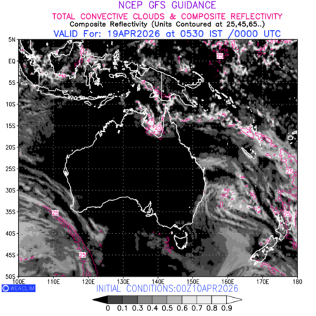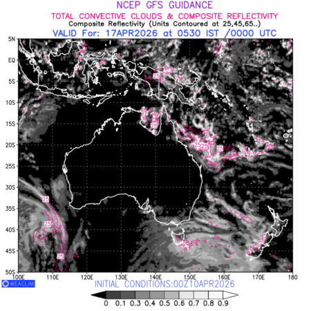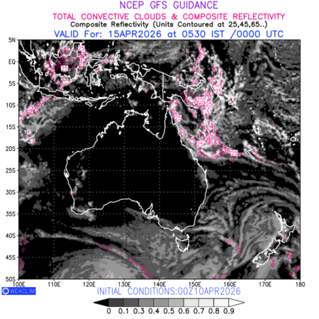 Convective clouds are formed by the vertical movement of air in the atmosphere and are associated with thunderstorms and other types of severe weather like intense rainfall, strong gusty winds etc. Shades from black to white on scale of 0 to 1 with whiter shade depicting more intensity of convection has been used in the depiction. Also shown is the Composite Reflectivity that takes the maximum reflectivity from each elevation angle of the Doppler Weather Radar and meshes it into one image. Advantage of this type of image is the ability to quickly assess the intensity of storms. Predicted pattern of Total Convective Clouds and percentage of the sky covered by them is shown here along with Composite Reflectivity for the Australian Region for the next ten days.