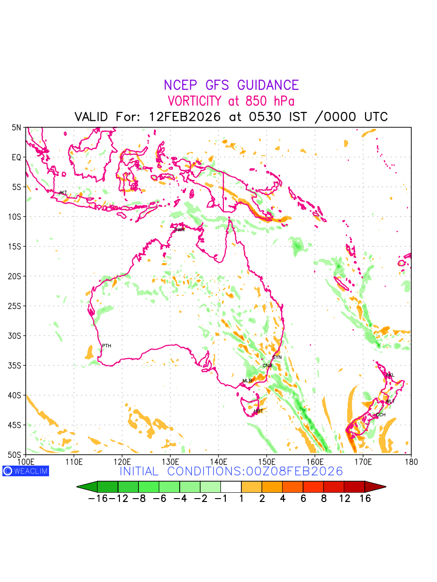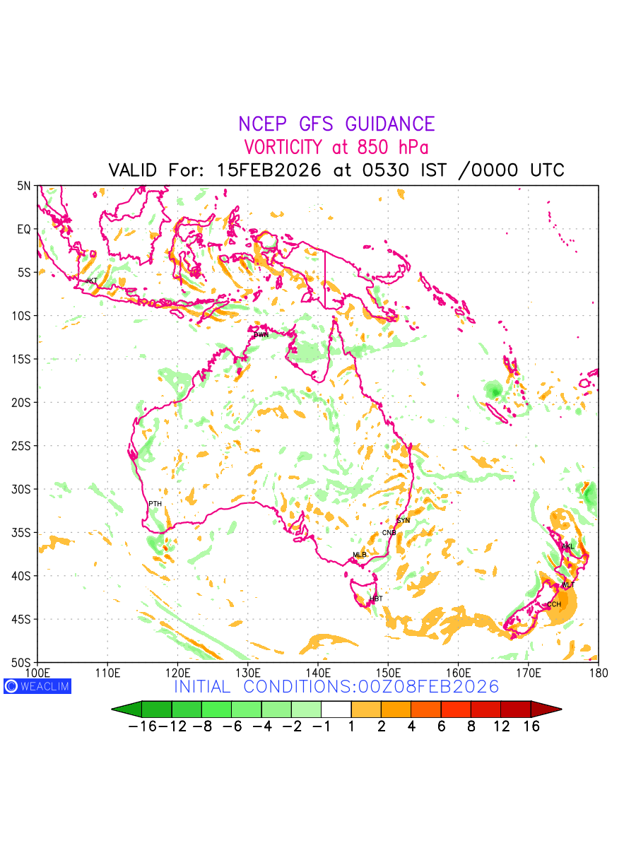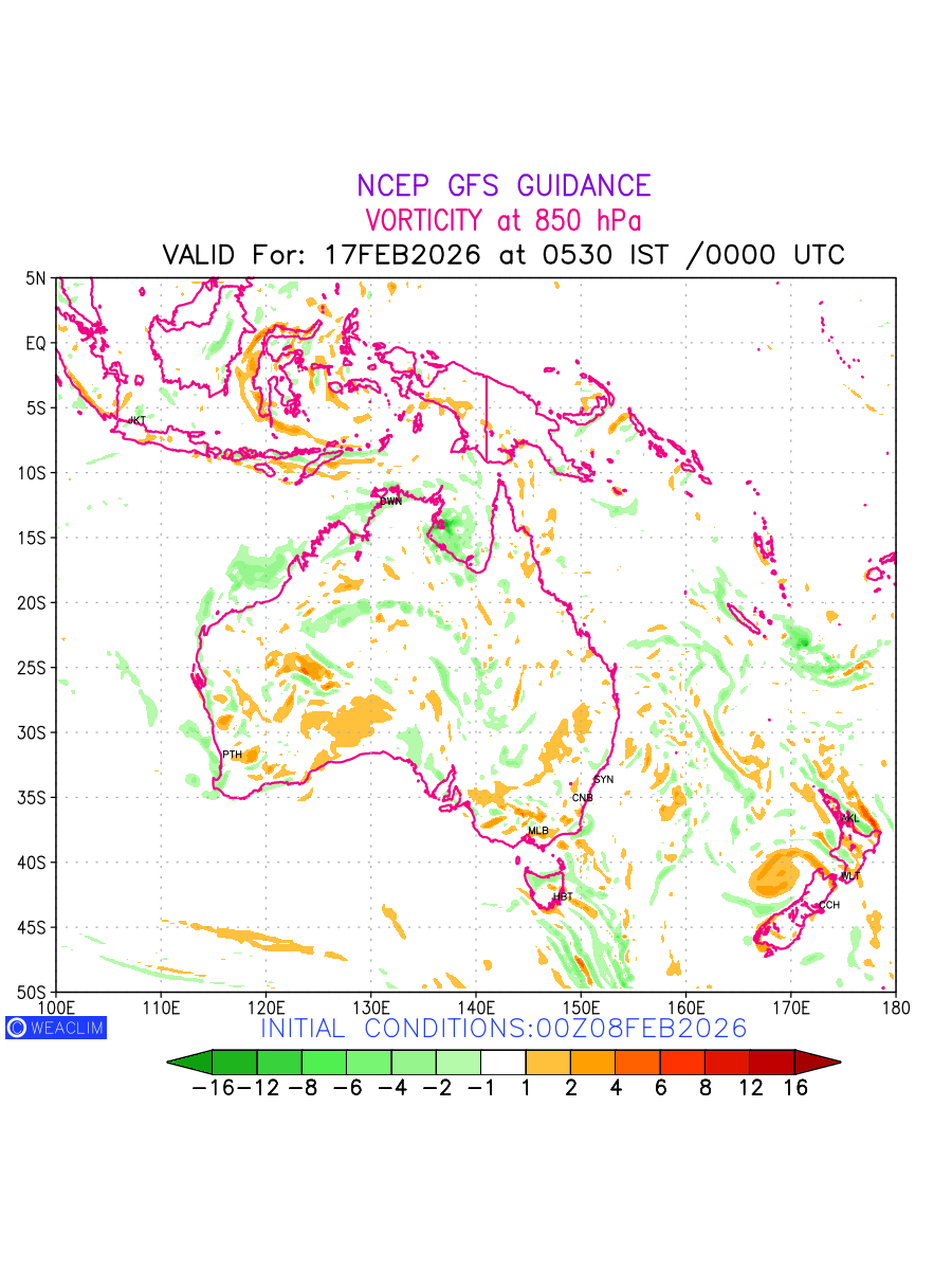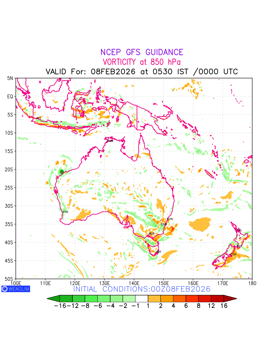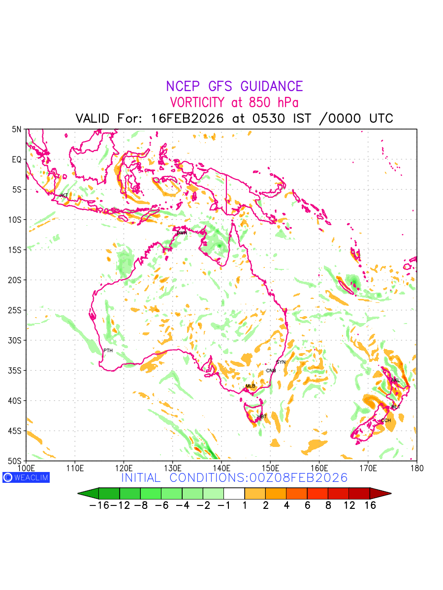 Low Level Convergence at the 24th hour for Australia, New Zealand and Tasmania is the graphical representation of the expected magnitude and pattern of horizontal rotation (or the vorticity) of atmosphere around a vertical axis or the vorticity at 850 hPa (1.5km). In northern hemisphere it is typically displayed with warm colors ranging from shades of red (to yellow) indicating positive vorticity (cyclonic rotation), and cool colors shades of green (to blue) indicating negative vorticity (anticyclonic rotation). They are useful tools for identifying areas of high and low vorticity, associated with weather systems such as fronts, lows, and highs etc.