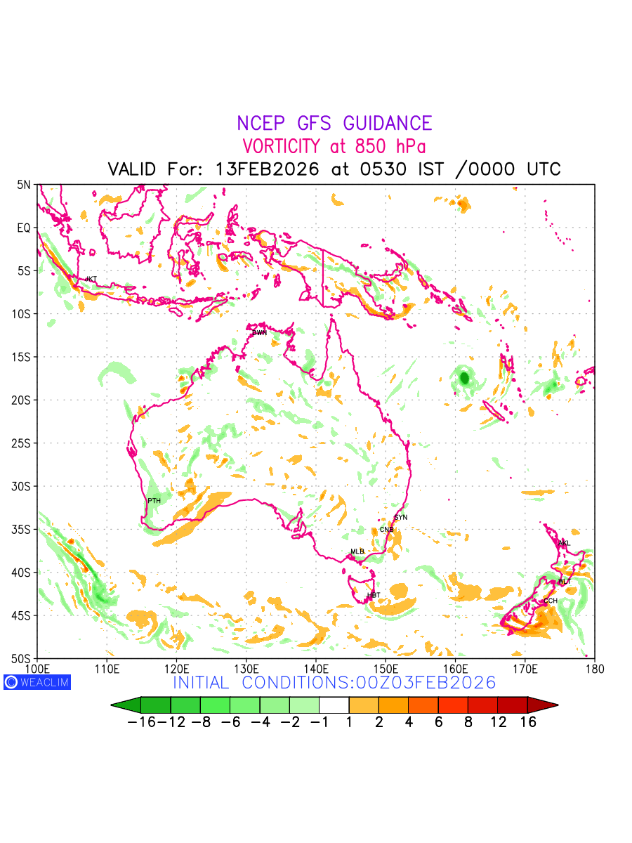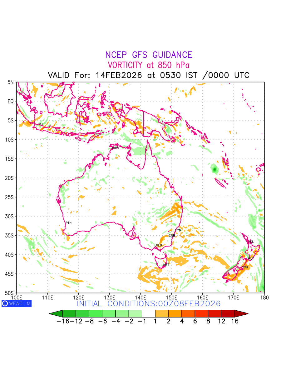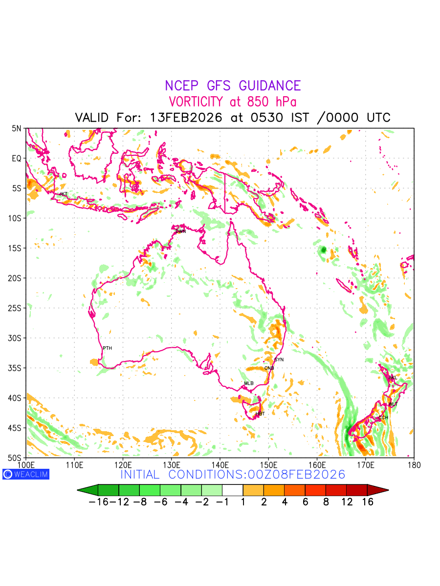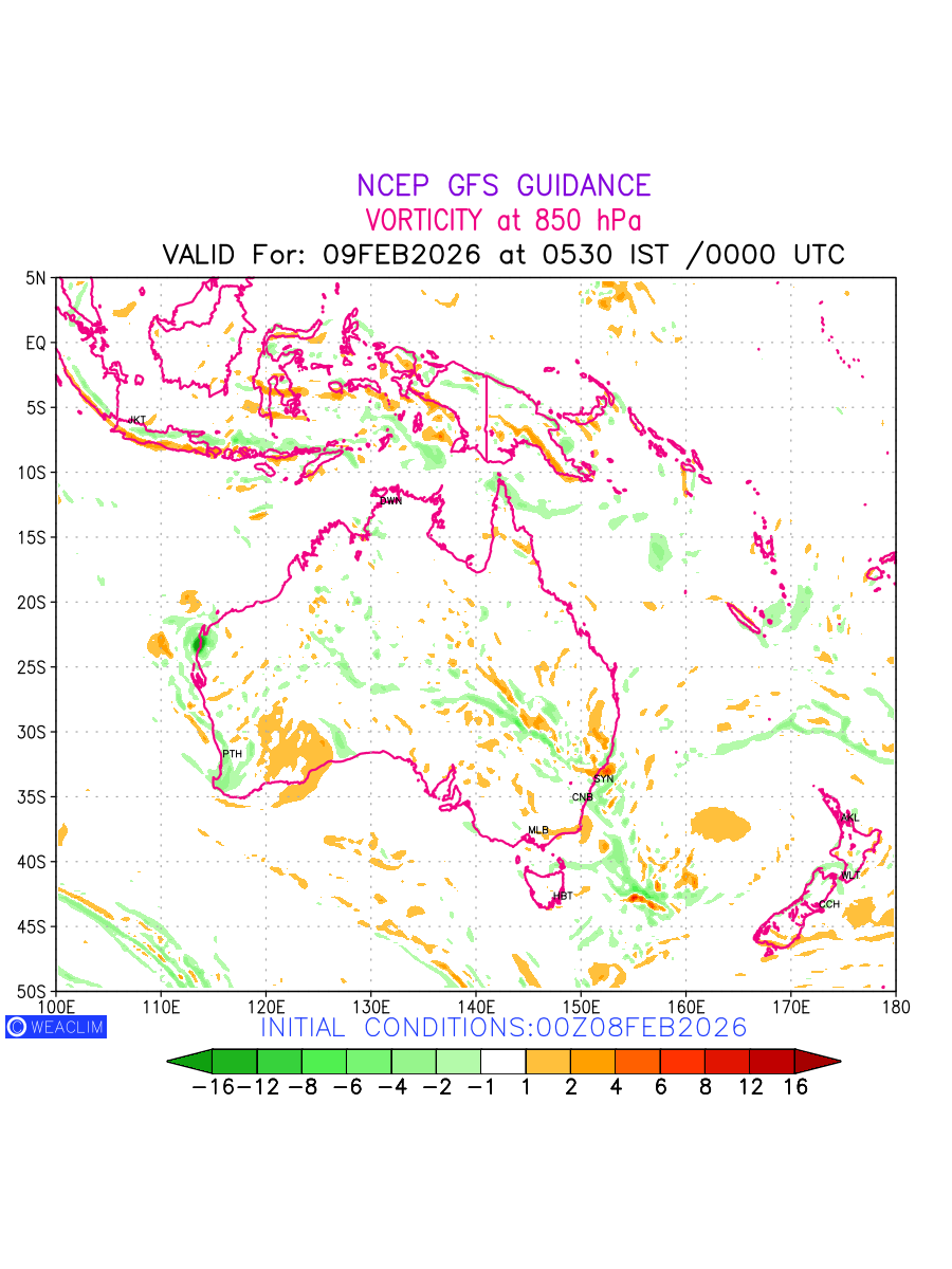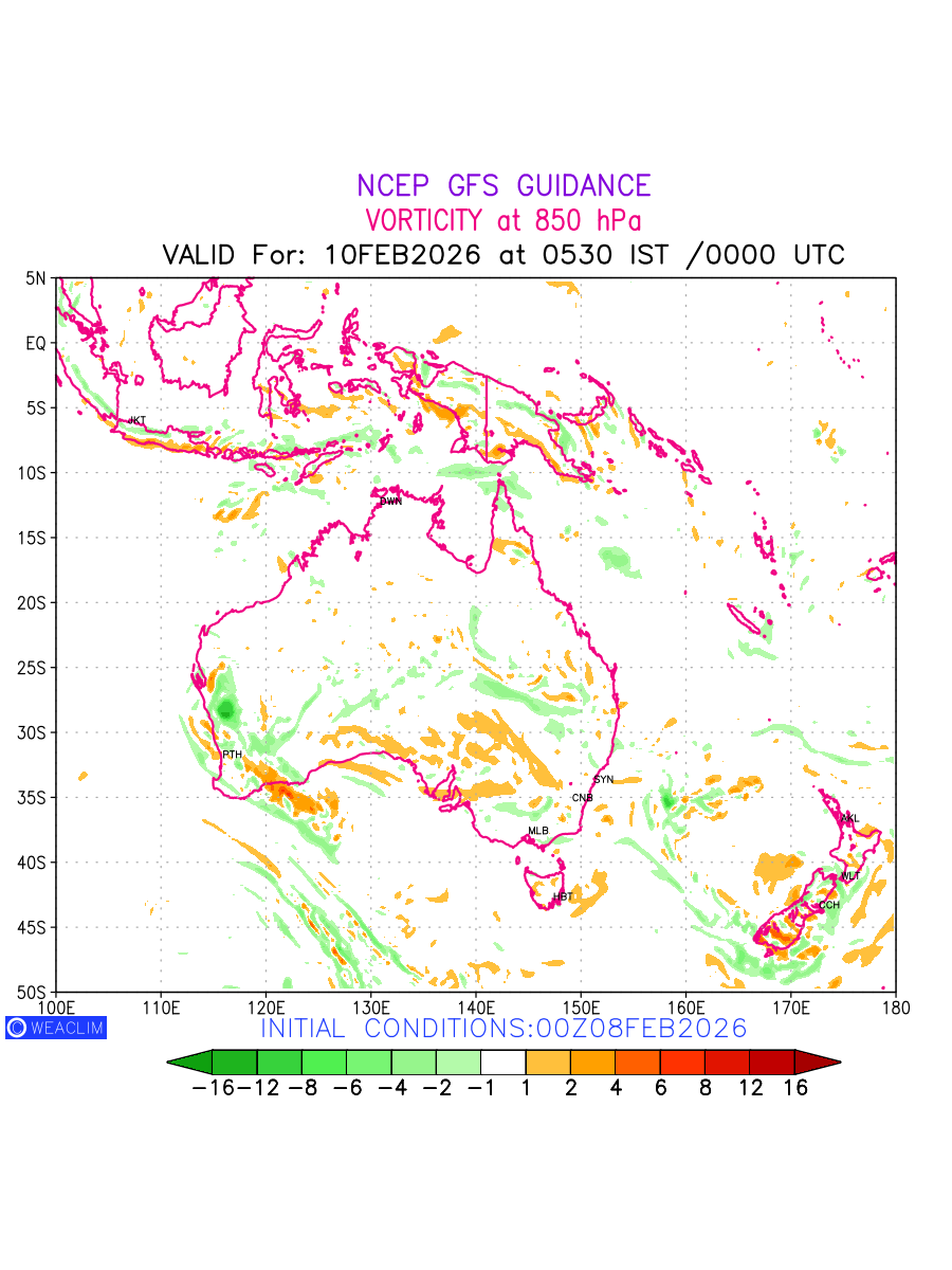 Low Level Convergence at the 24th hour for Australia, New Zealand and Tasmania is the graphical representation of the expected magnitude and pattern of horizontal rotation (or the vorticity) of atmosphere around a vertical axis or the vorticity at 850 hPa (1.5km). In northern hemisphere it is typically displayed with warm colors ranging from shades of red (to yellow) indicating positive vorticity (cyclonic rotation), and cool colors shades of green (to blue) indicating negative vorticity (anticyclonic rotation). They are useful tools for identifying areas of high and low vorticity, associated with weather systems such as fronts, lows, and highs etc.