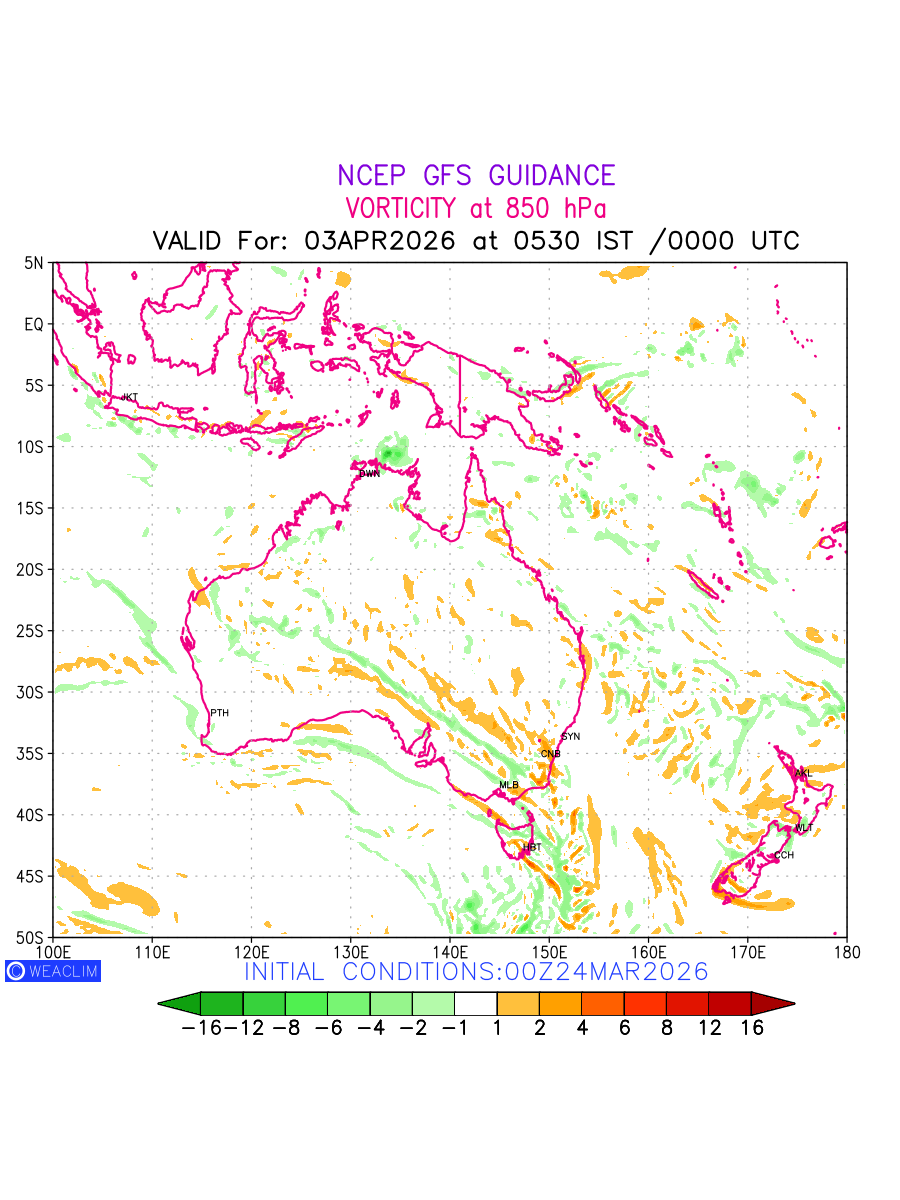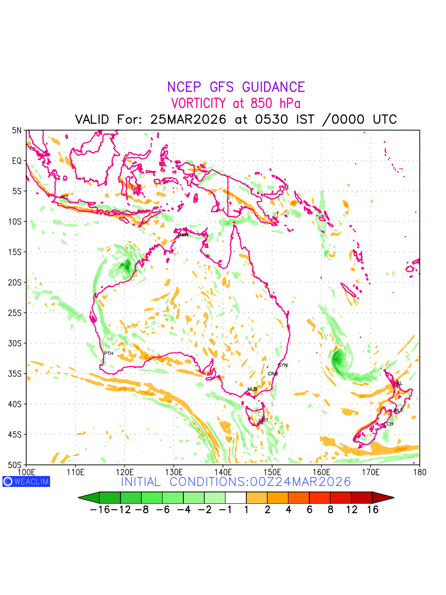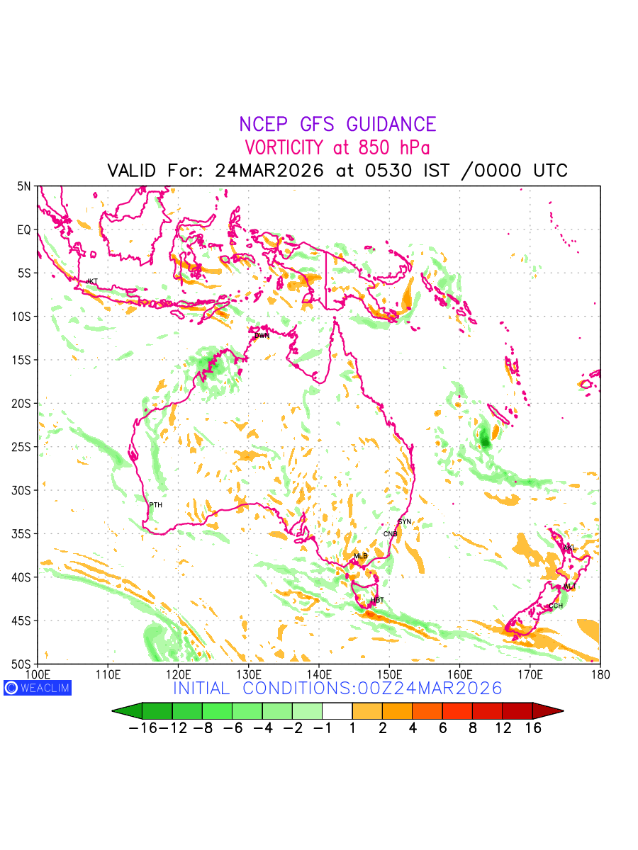 Low Level Convergence at the 24th hour for Australia, New Zealand and Tasmania is the graphical representation of the expected magnitude and pattern of horizontal rotation (or the vorticity) of atmosphere around a vertical axis or the vorticity at 850 hPa (1.5km). In northern hemisphere it is typically displayed with warm colors ranging from shades of red (to yellow) indicating positive vorticity (cyclonic rotation), and cool colors shades of green (to blue) indicating negative vorticity (anticyclonic rotation). They are useful tools for identifying areas of high and low vorticity, associated with weather systems such as fronts, lows, and highs etc.