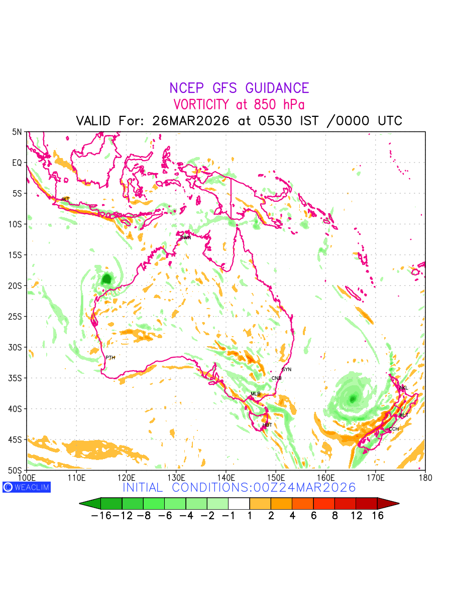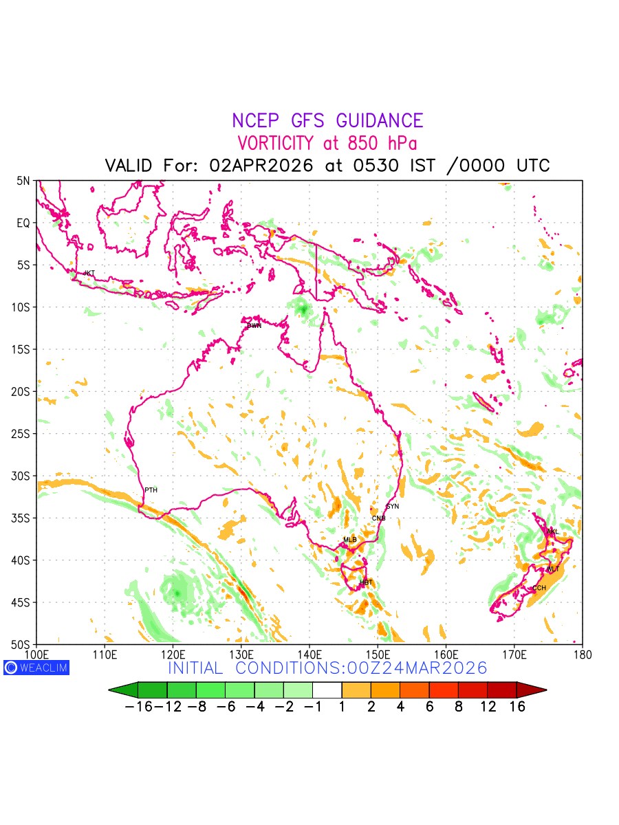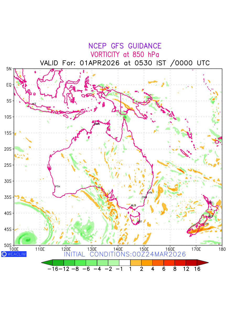Low Level Convergence at the 24th hour for Australia, New Zealand and Tasmania is the graphical representation of the expected magnitude and pattern of horizontal rotation (or the vorticity) of atmosphere around a vertical axis or the vorticity at 850 hPa (1.5km). In northern hemisphere it is typically displayed with warm colors ranging from shades of red (to yellow) indicating positive vorticity (cyclonic rotation), and cool colors shades of green (to blue) indicating negative vorticity (anticyclonic rotation). They are useful tools for identifying areas of high and low vorticity, associated with weather systems such as fronts, lows, and highs etc.