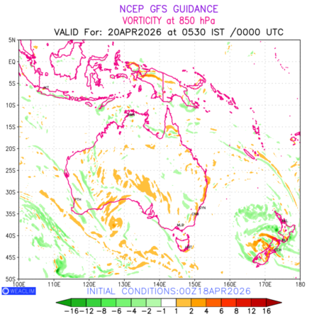 Low Level Convergence at the 24th hour for Australia, New Zealand and Tasmania is the graphical representation of the expected magnitude and pattern of horizontal rotation (or the vorticity) of atmosphere around a vertical axis or the vorticity at 850 hPa (1.5km). In northern hemisphere it is typically displayed with warm colors ranging from shades of red (to yellow) indicating positive vorticity (cyclonic rotation), and cool colors shades of green (to blue) indicating negative vorticity (anticyclonic rotation). They are useful tools for identifying areas of high and low vorticity, associated with weather systems such as fronts, lows, and highs etc.