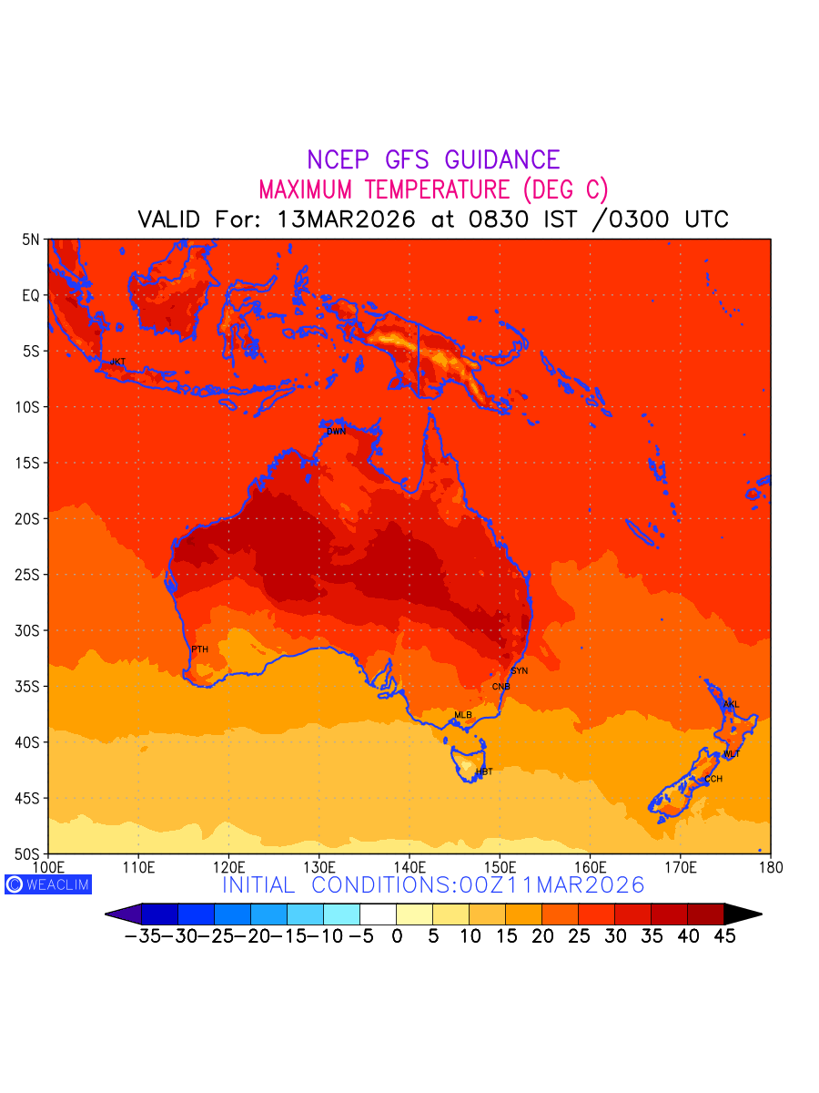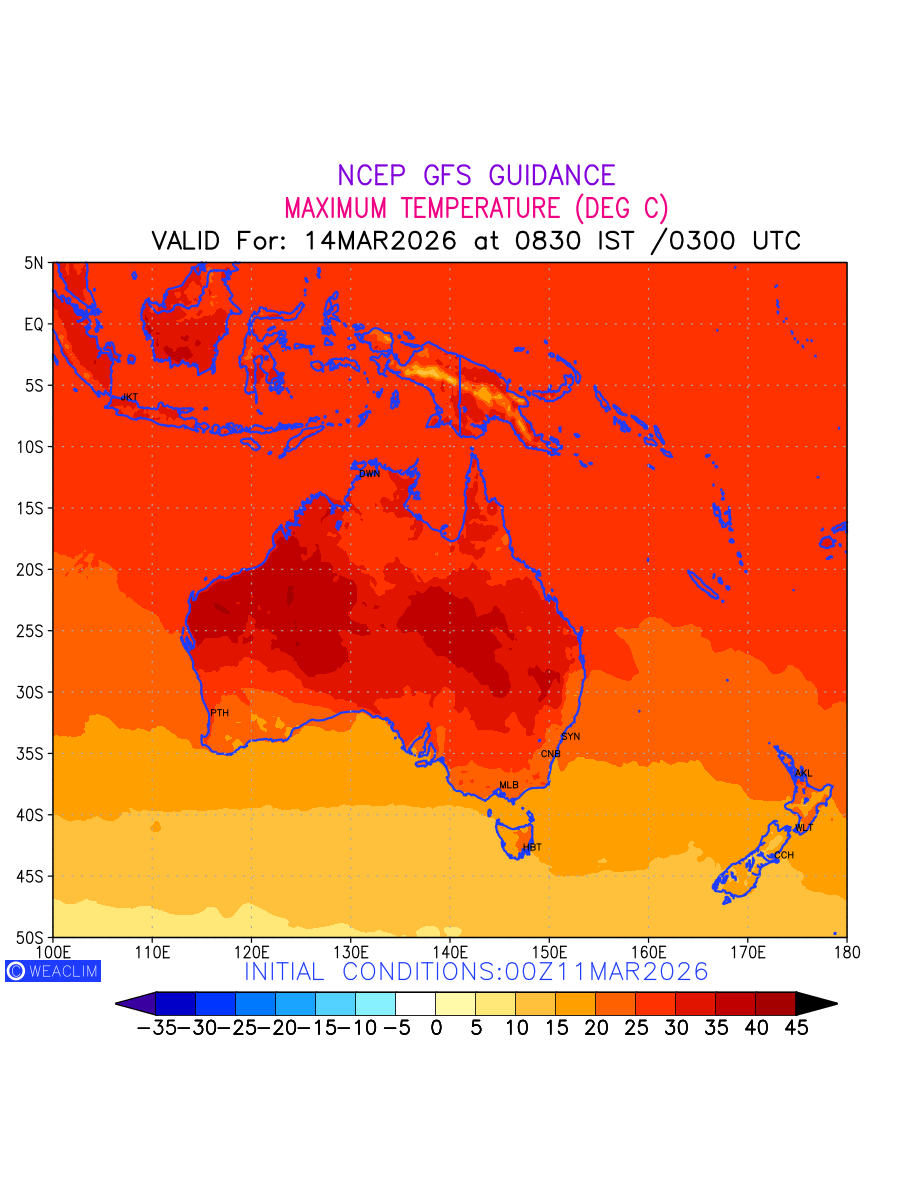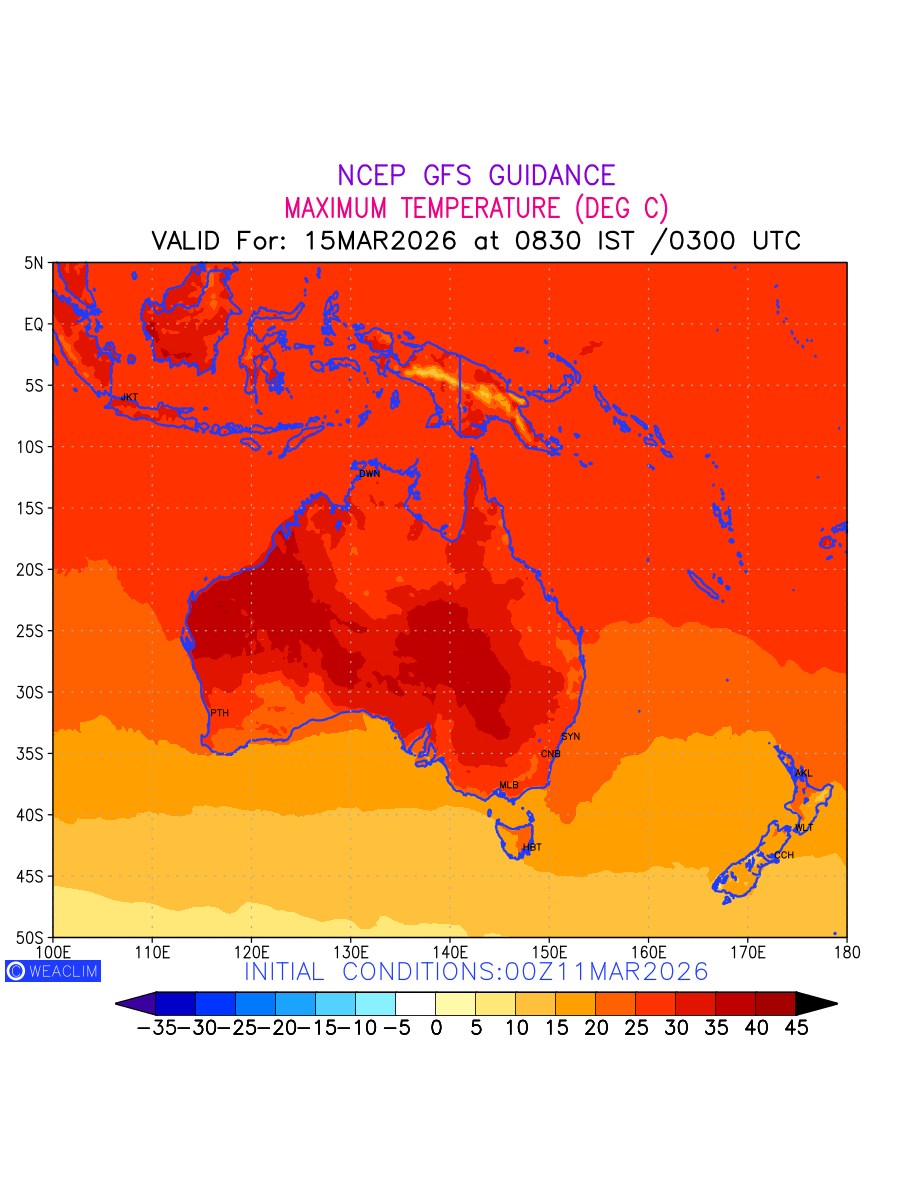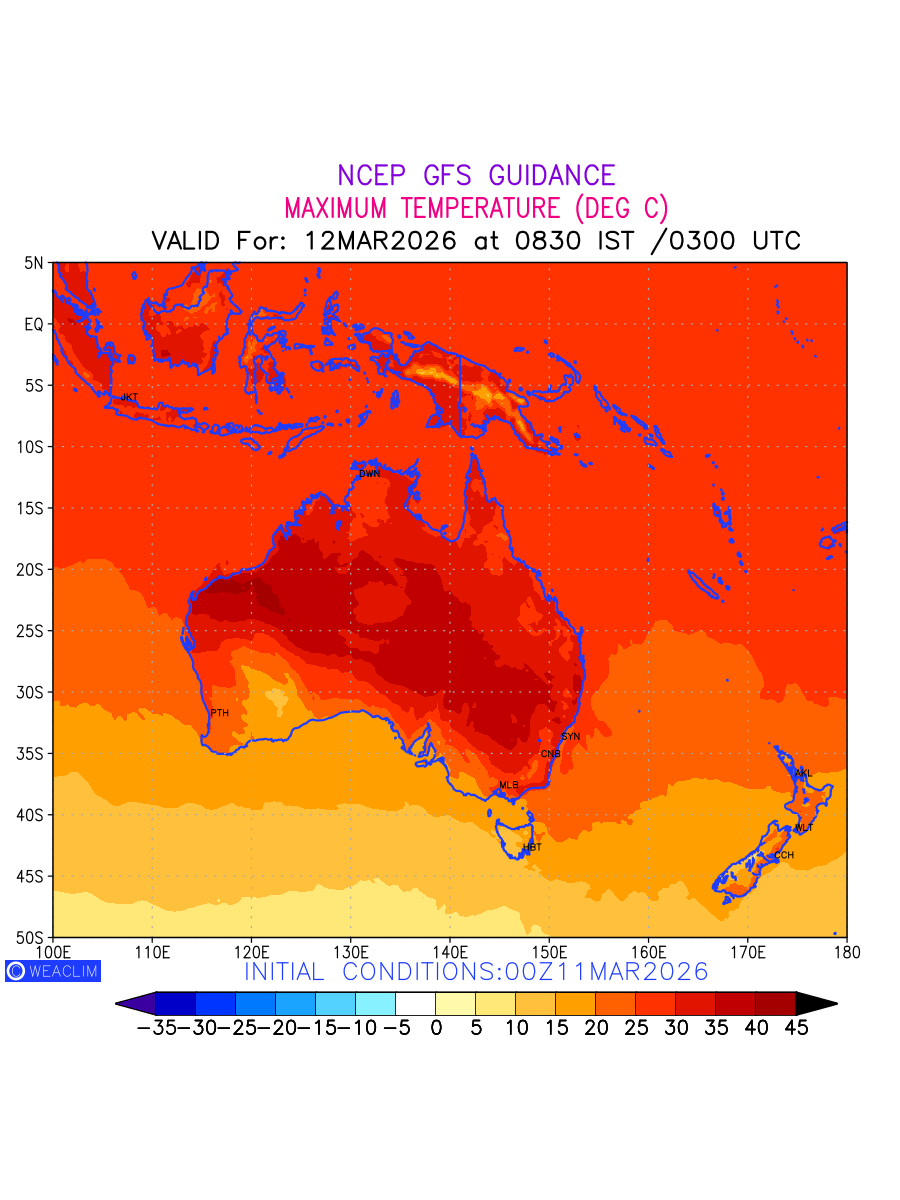 Maximum Temperature for Australia, New Zealand and Tasmania countries depicts the highest temperatures at 2m above the ground surface between 0300 UTC of the previous date to 0300 UTC of the required date. This is an important variable for weather forecasting, as it determines the conditions at the Earth’s surface during the warmest part of the date, affecting human activities, agriculture, and the environment. 2m Temperature data can be used for a variety of applications, such as predicting the onset of heatwaves or cold spells, forecasting temperature trends, and studying the impact of weather on various systems and processes.