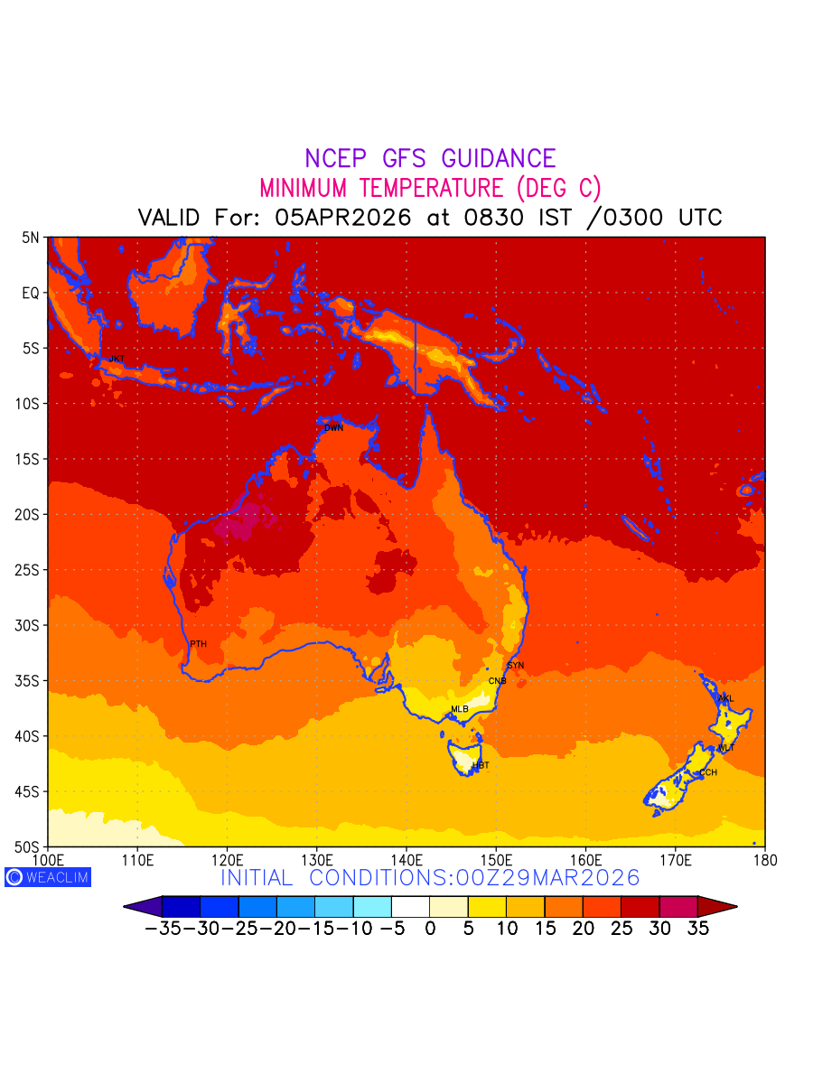 Minimum Temperature for Australia, New Zealand and Tasmania depicts the highest temperatures at 2m above the ground surface between 0300 UTC of the previous date to 0300 UTC of the required date. This is an important variable for weather forecasting, as it determines the conditions at the Earth’s surface during the coldest part of the date, affecting human activities, agriculture, and the environment. 2m Temperature data can be used for a variety of applications, such as predicting the onset of cold spells, forecasting temperature trends, and studying the impact of weather on various systems and processes.
