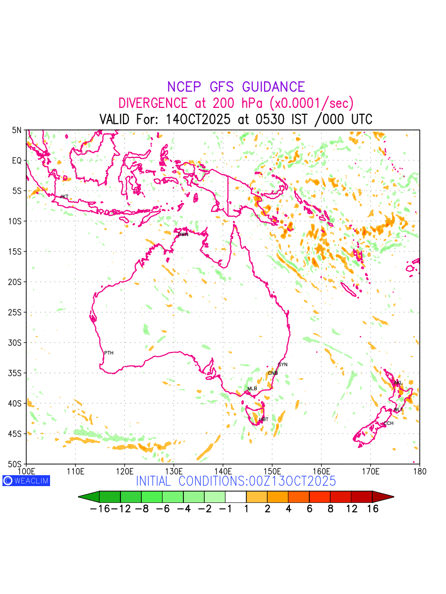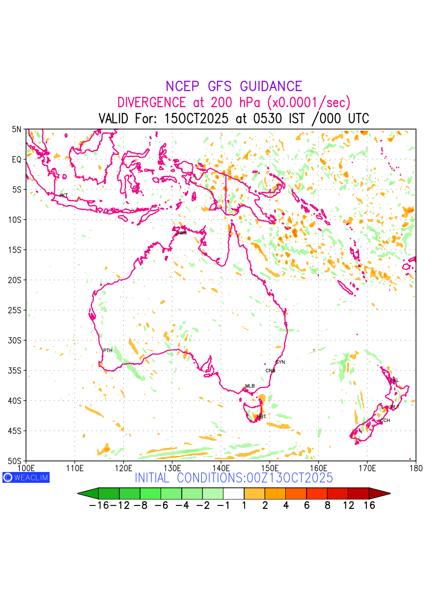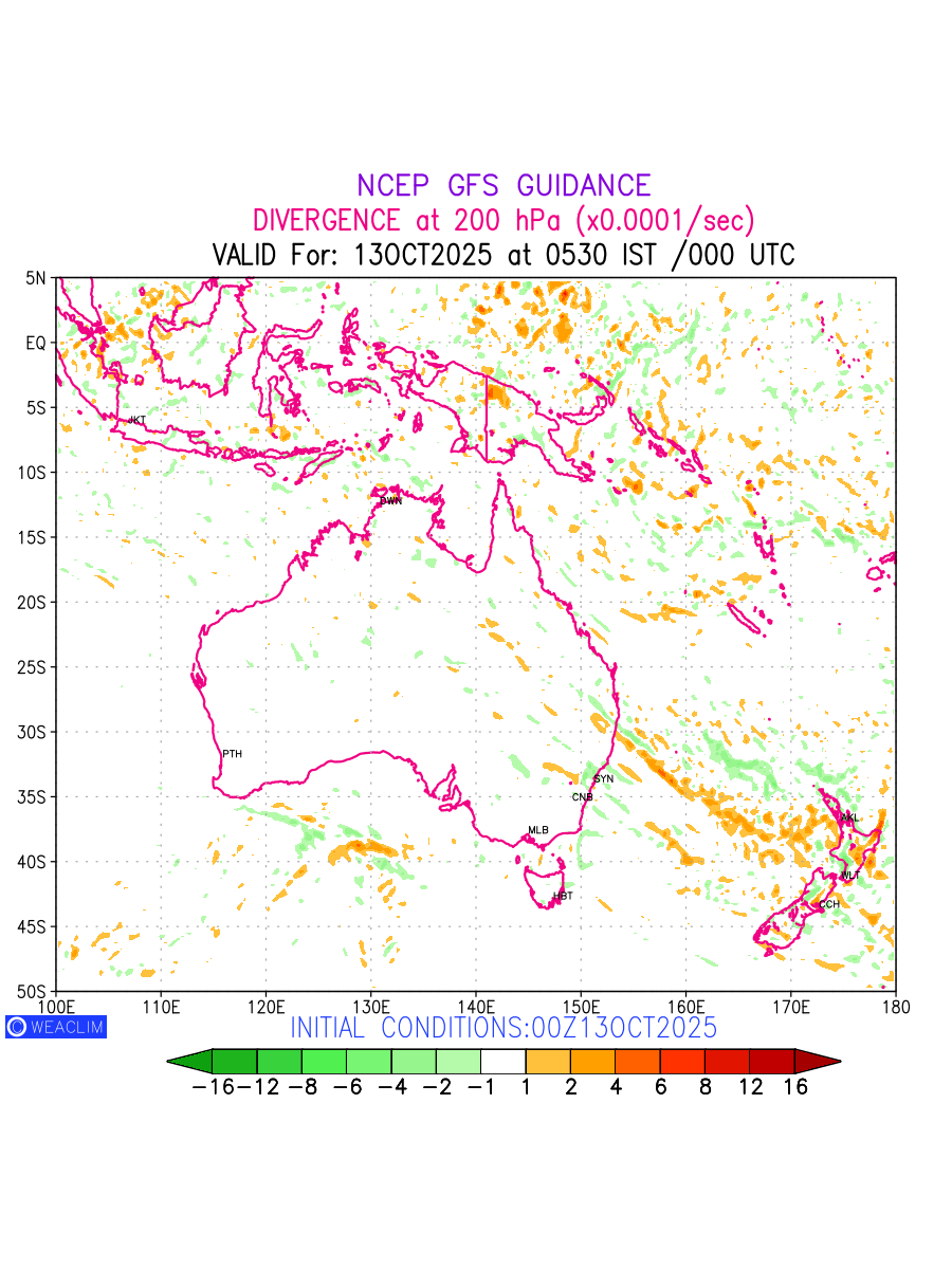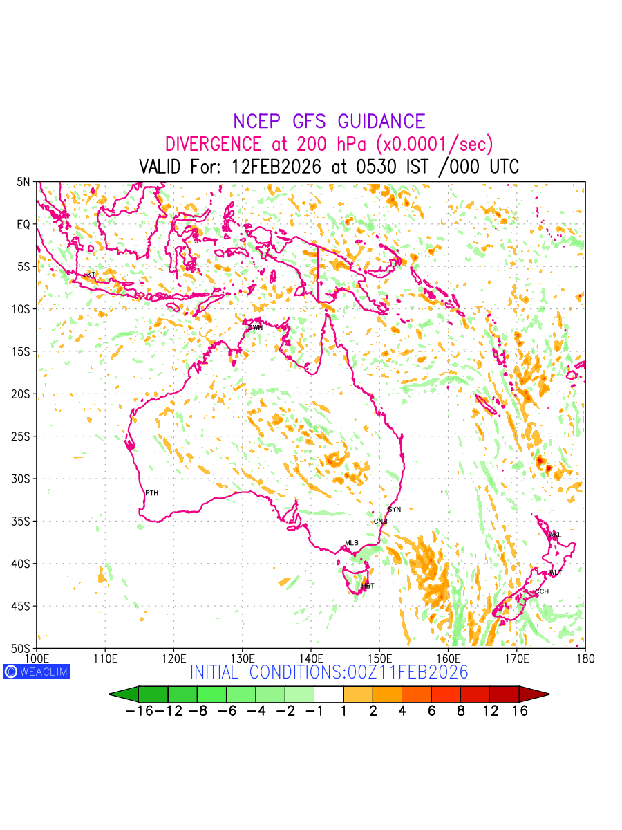 Upper Level Divergence at the 24 th hour for Australia, New Zealand and Tasmania is the graphical representation that depict the magnitude and pattern of horizontal rotation (or the vorticity) of atmosphere around a vertical axis or the vorticity at 200 hPa (12.0km). In northern hemisphere, it is displayed in warm colors such as red and yellow indicating positive vorticity (cyclonic rotation), and cool colors such as blue and green indicating negative vorticity (anticyclonic rotation). It can be associated with weather systems such as troughs,ridges, and jet streams.