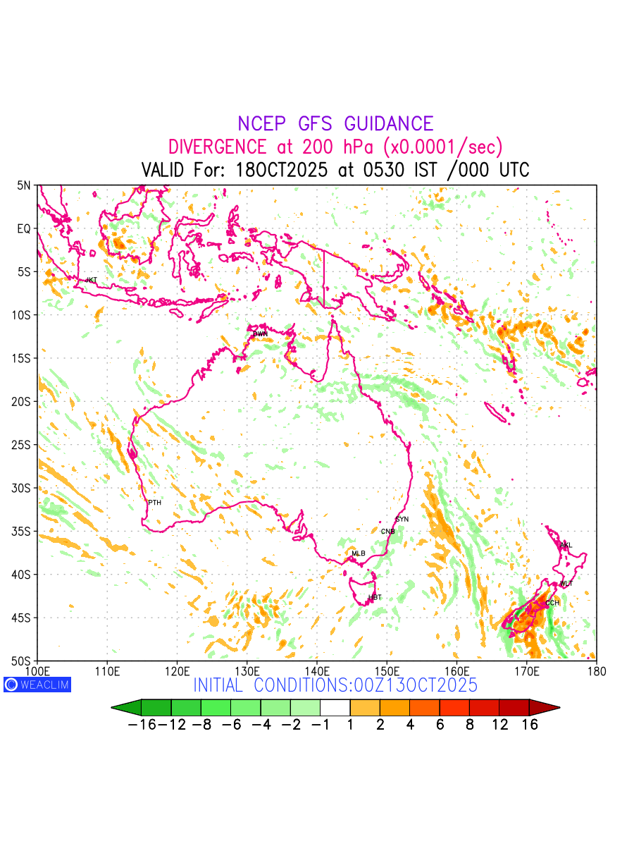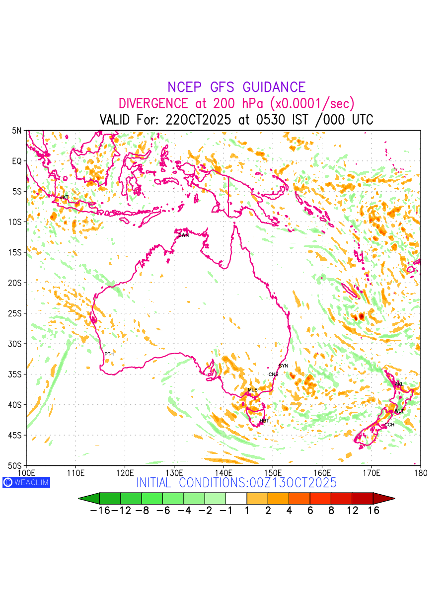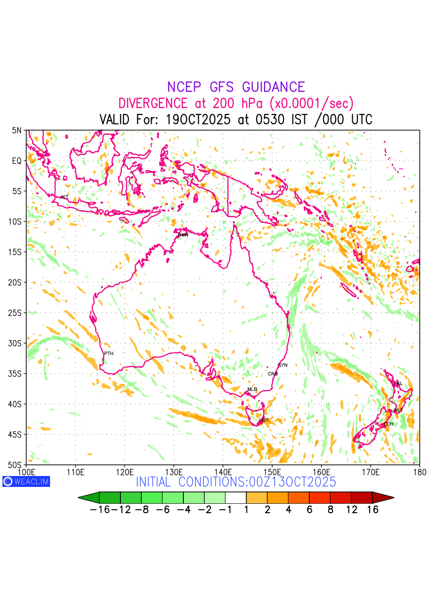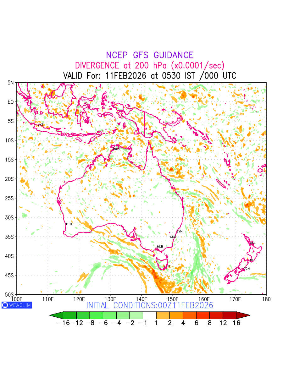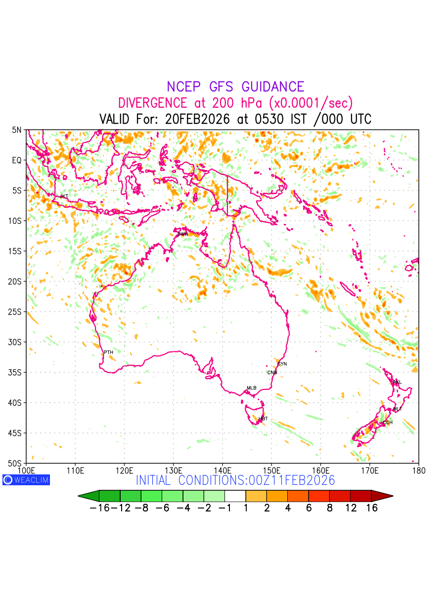Upper Level Divergence at the 24 th hour for Australia, New Zealand and Tasmania is the graphical representation that depict the magnitude and pattern of horizontal rotation (or the vorticity) of atmosphere around a vertical axis or the vorticity at 200 hPa (12.0km). In northern hemisphere, it is displayed in warm colors such as red and yellow indicating positive vorticity (cyclonic rotation), and cool colors such as blue and green indicating negative vorticity (anticyclonic rotation). It can be associated with weather systems such as troughs,ridges, and jet streams.