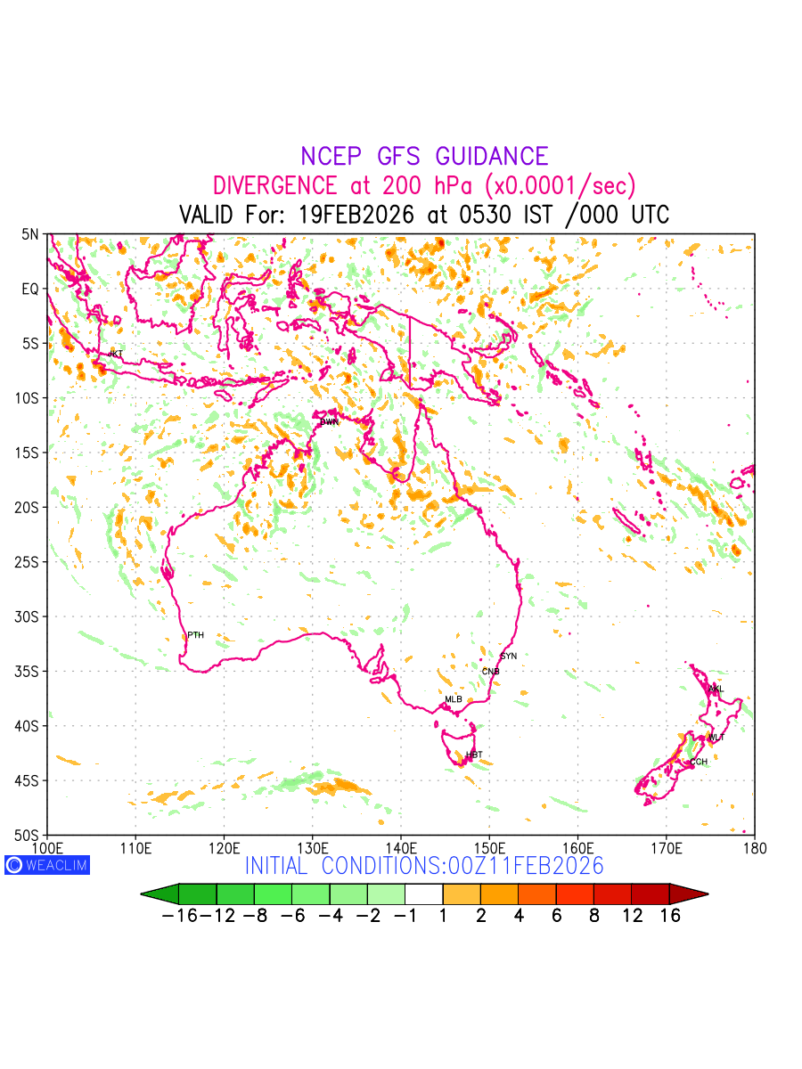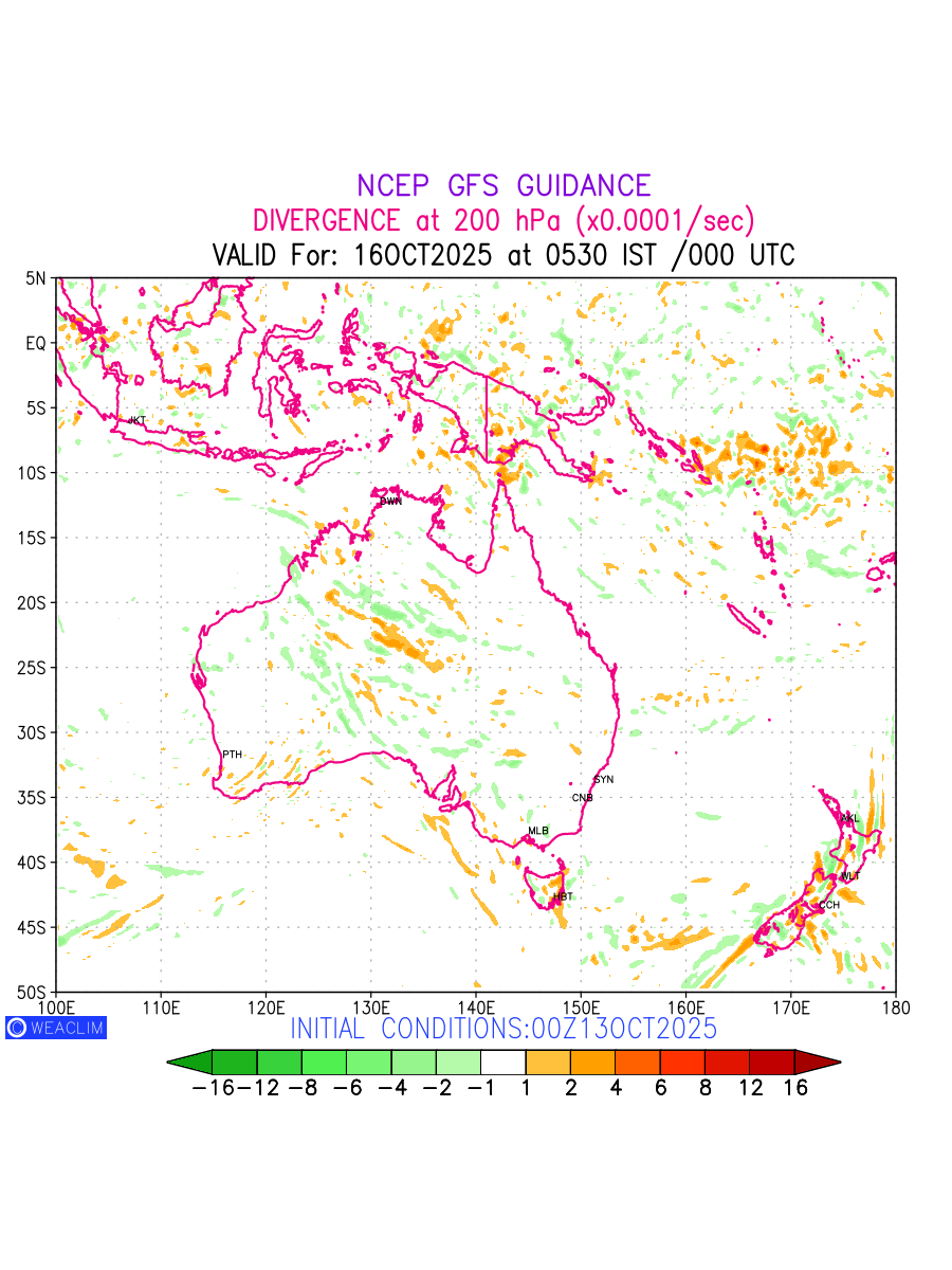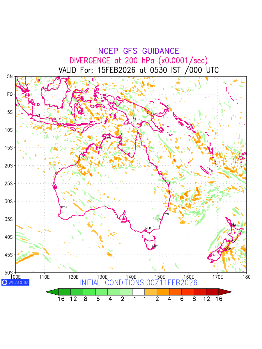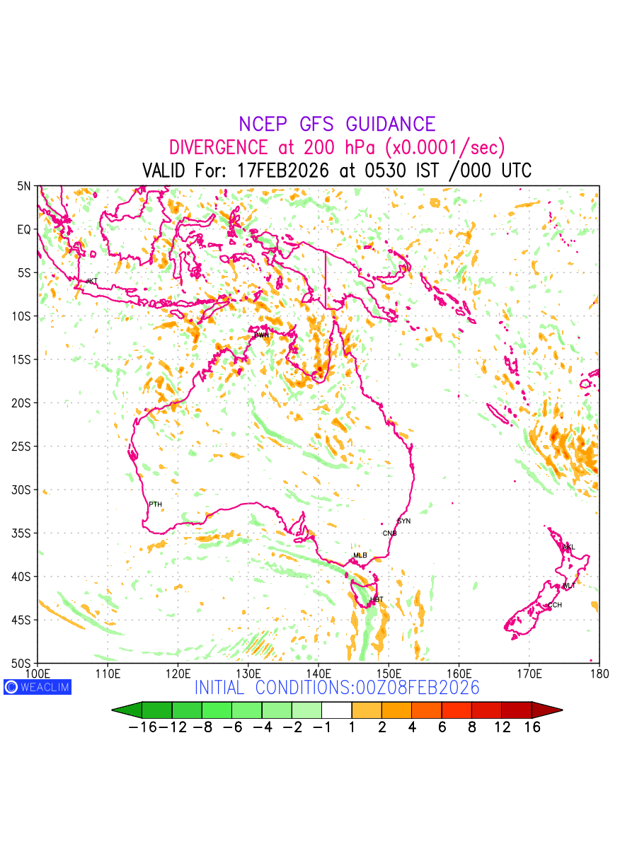 Upper Level Divergence at the 24 th hour for Australia, New Zealand and Tasmania is the graphical representation that depict the magnitude and pattern of horizontal rotation (or the vorticity) of atmosphere around a vertical axis or the vorticity at 200 hPa (12.0km). In northern hemisphere, it is displayed in warm colors such as red and yellow indicating positive vorticity (cyclonic rotation), and cool colors such as blue and green indicating negative vorticity (anticyclonic rotation). It can be associated with weather systems such as troughs,ridges, and jet streams.