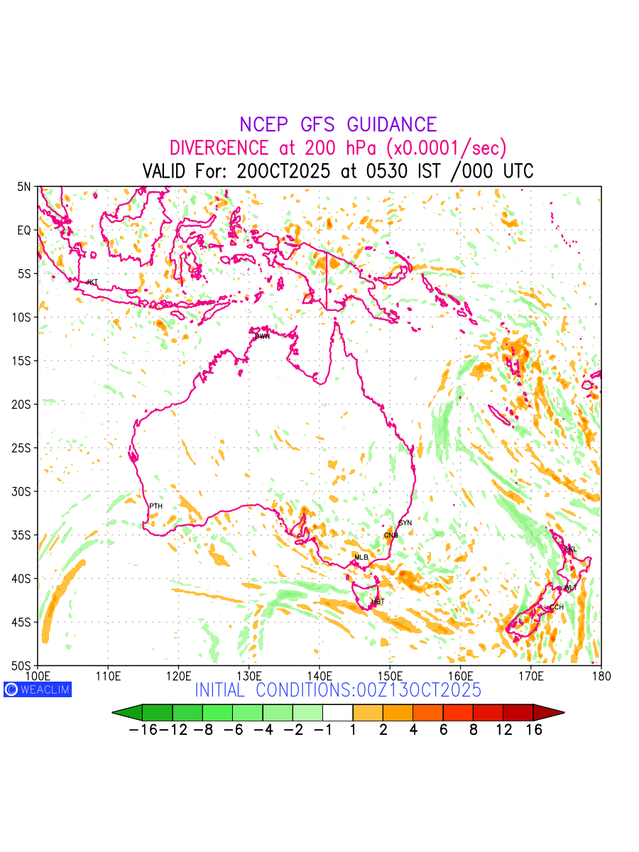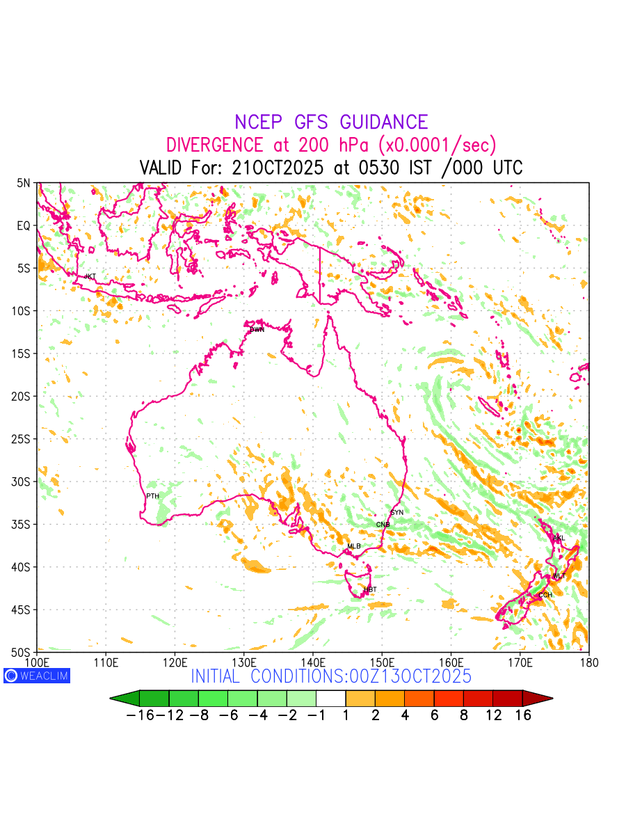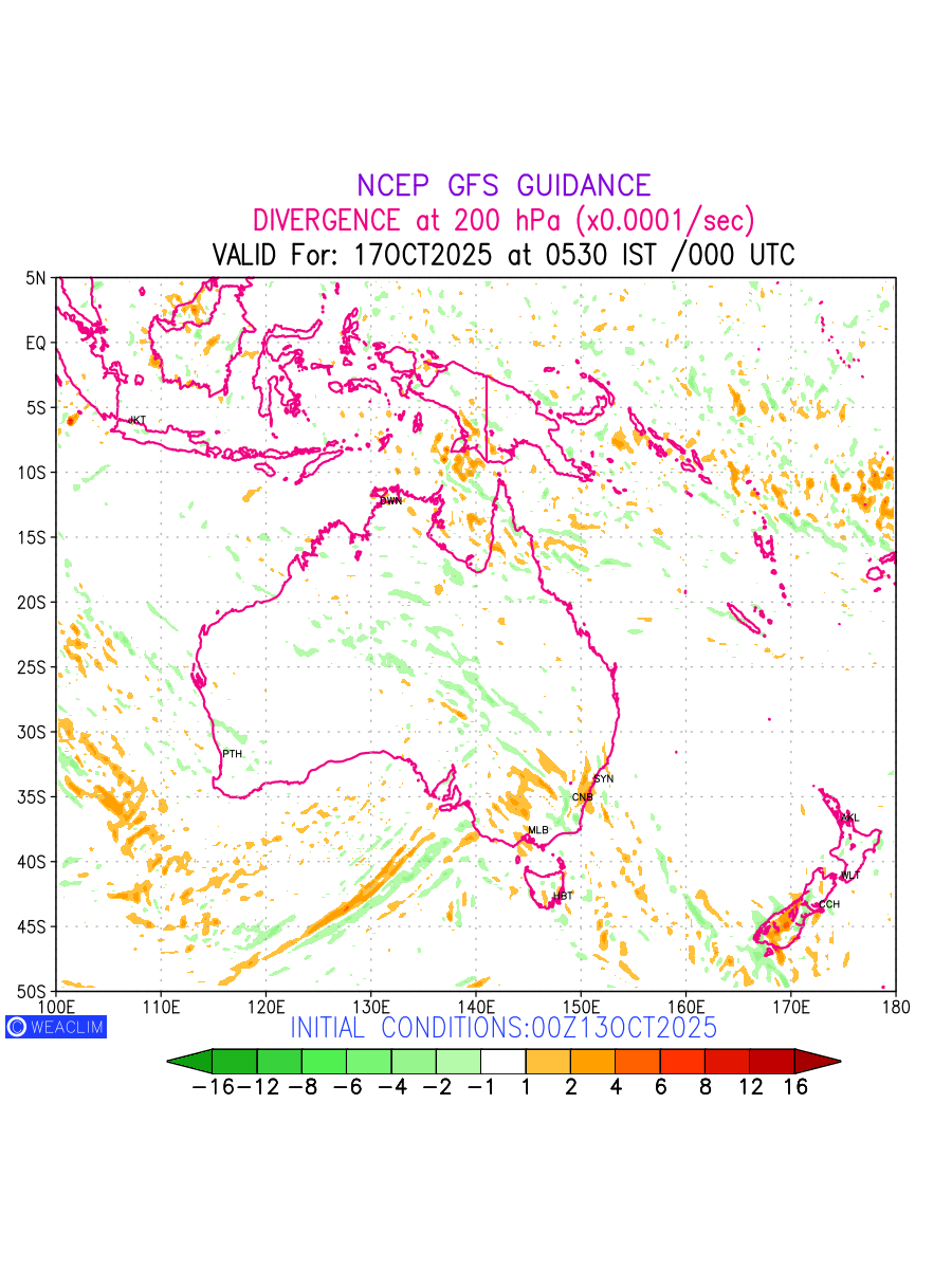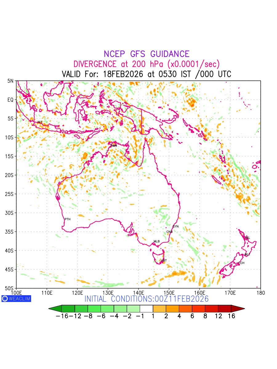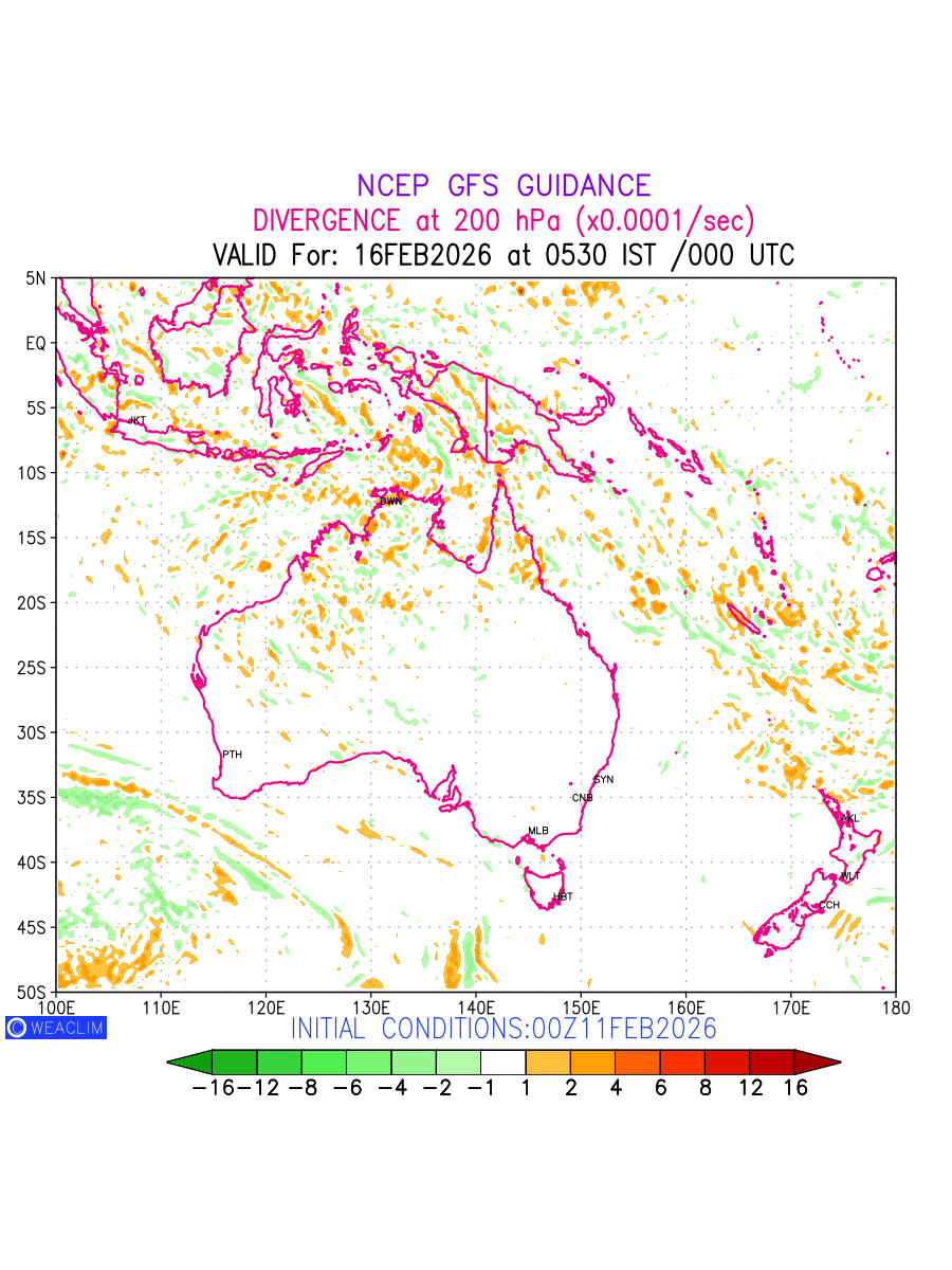 Upper Level Divergence at the 24 th hour for Australia, New Zealand and Tasmania is the graphical representation that depict the magnitude and pattern of horizontal rotation (or the vorticity) of atmosphere around a vertical axis or the vorticity at 200 hPa (12.0km). In northern hemisphere, it is displayed in warm colors such as red and yellow indicating positive vorticity (cyclonic rotation), and cool colors such as blue and green indicating negative vorticity (anticyclonic rotation). It can be associated with weather systems such as troughs,ridges, and jet streams.