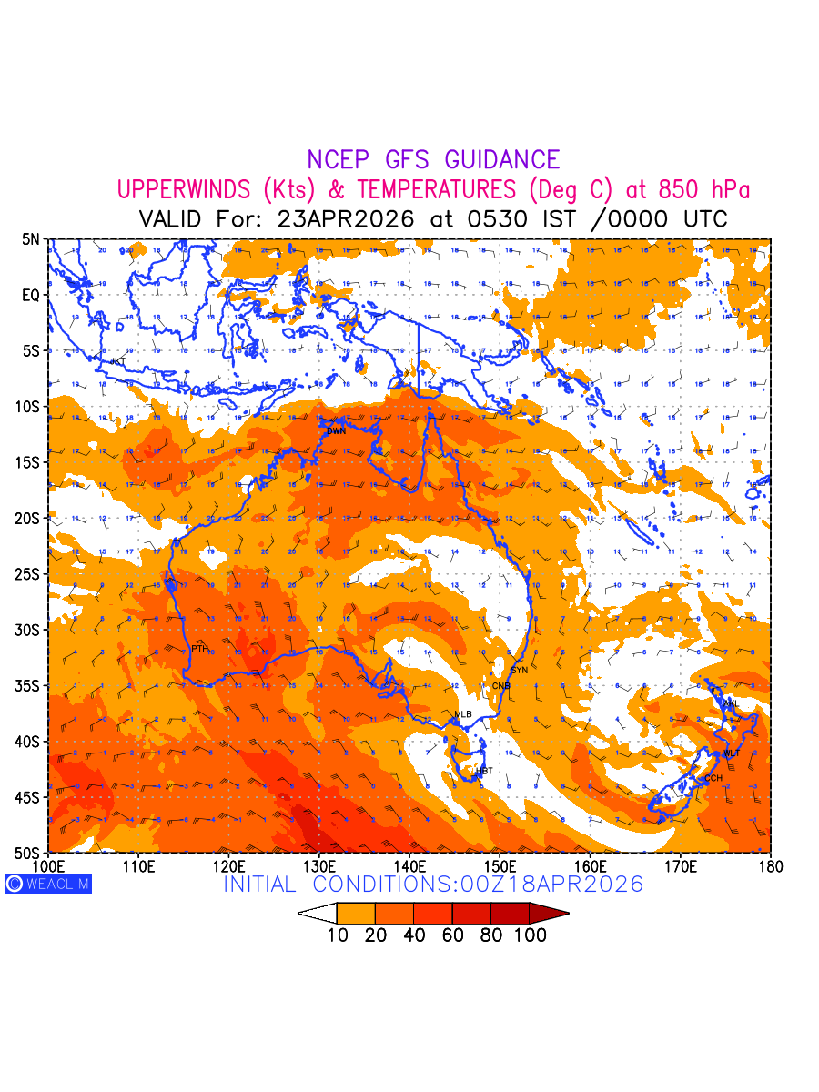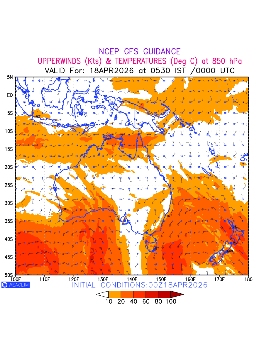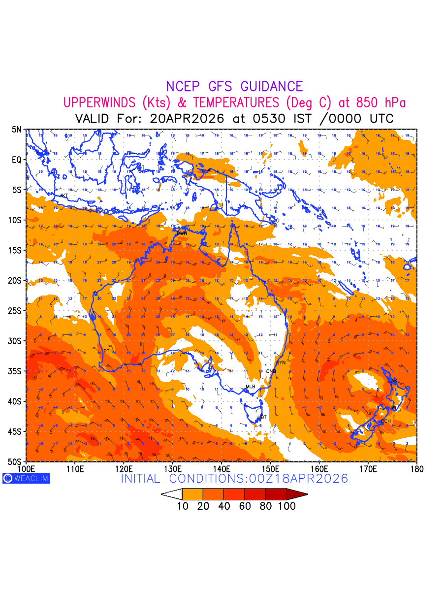 Winds at 850 hPa at the 24th hour for Australia, New Zealand and Tasmania refers to the predicted wind direction and speed at a pressure level of 850 hPa, which is located in the lower troposphere (1,500 meters or 5,000 feet above the Earth’s surface). The winds are presented in knots (kt), and the direction is given in degrees from true north. Winds with magnitude of more than 20 kt are marked in shades of red. Being close to the Earth’s surface it is strongly influenced by surface features such as mountains, valleys, and bodies of water. It gives insight into the strength and direction of wind flow in the lower troposphere, affecting the movement of weather systems and the transport of heat, moisture, and pollutants in the atmosphere. Depiction also shows the temperature along with the wind barb on the grid points at 850 hPa. Along with the wind speed (kt) and direction, upper air temperatures (Deg C) are also shown at the grid points over the Australian Region at 850 hPa level for the next ten days.