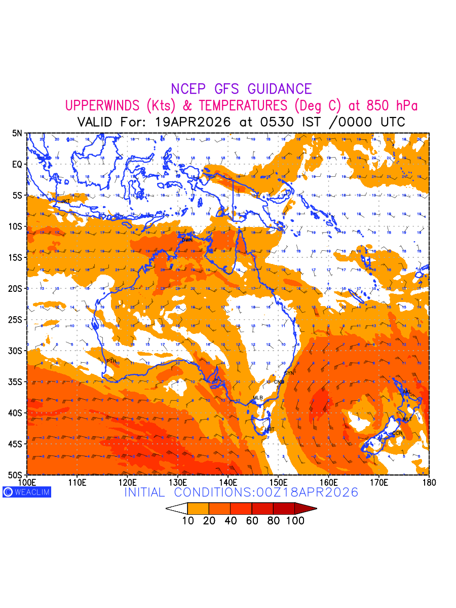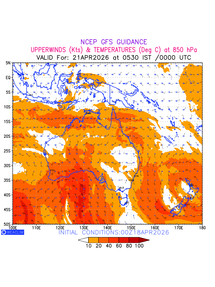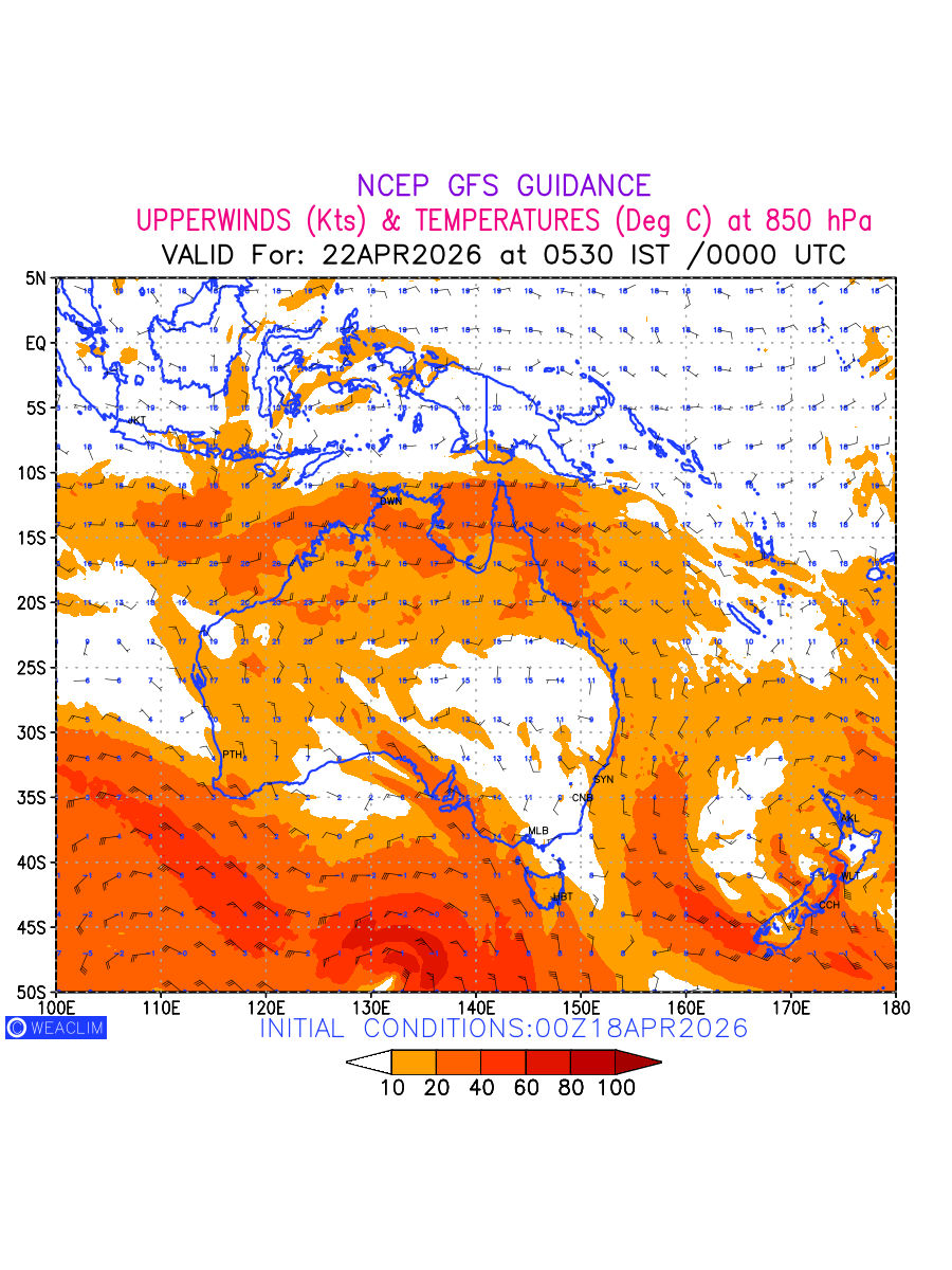 Winds at 850 hPa at the 24th hour for Australia, New Zealand and Tasmania refers to the predicted wind direction and speed at a pressure level of 850 hPa, which is located in the lower troposphere (1,500 meters or 5,000 feet above the Earth’s surface). The winds are presented in knots (kt), and the direction is given in degrees from true north. Winds with magnitude of more than 20 kt are marked in shades of red. Being close to the Earth’s surface it is strongly influenced by surface features such as mountains, valleys, and bodies of water. It gives insight into the strength and direction of wind flow in the lower troposphere, affecting the movement of weather systems and the transport of heat, moisture, and pollutants in the atmosphere. Depiction also shows the temperature along with the wind barb on the grid points at 850 hPa. Along with the wind speed (kt) and direction, upper air temperatures (Deg C) are also shown at the grid points over the Australian Region at 850 hPa level for the next ten days.