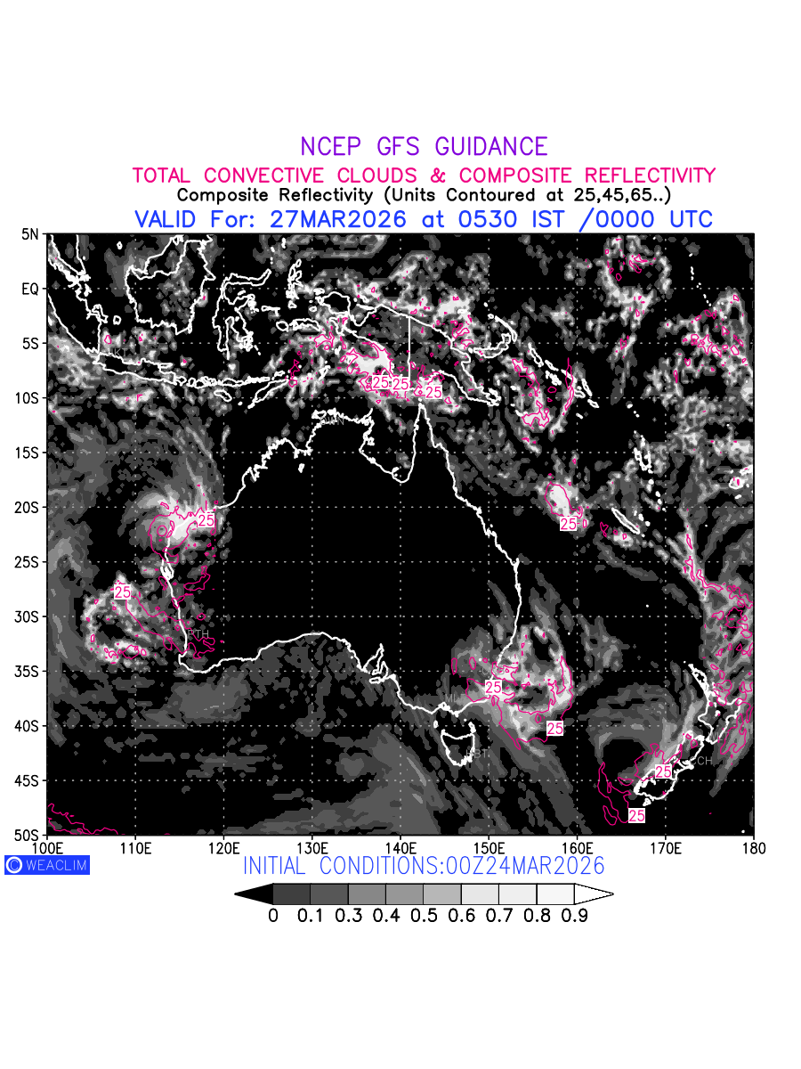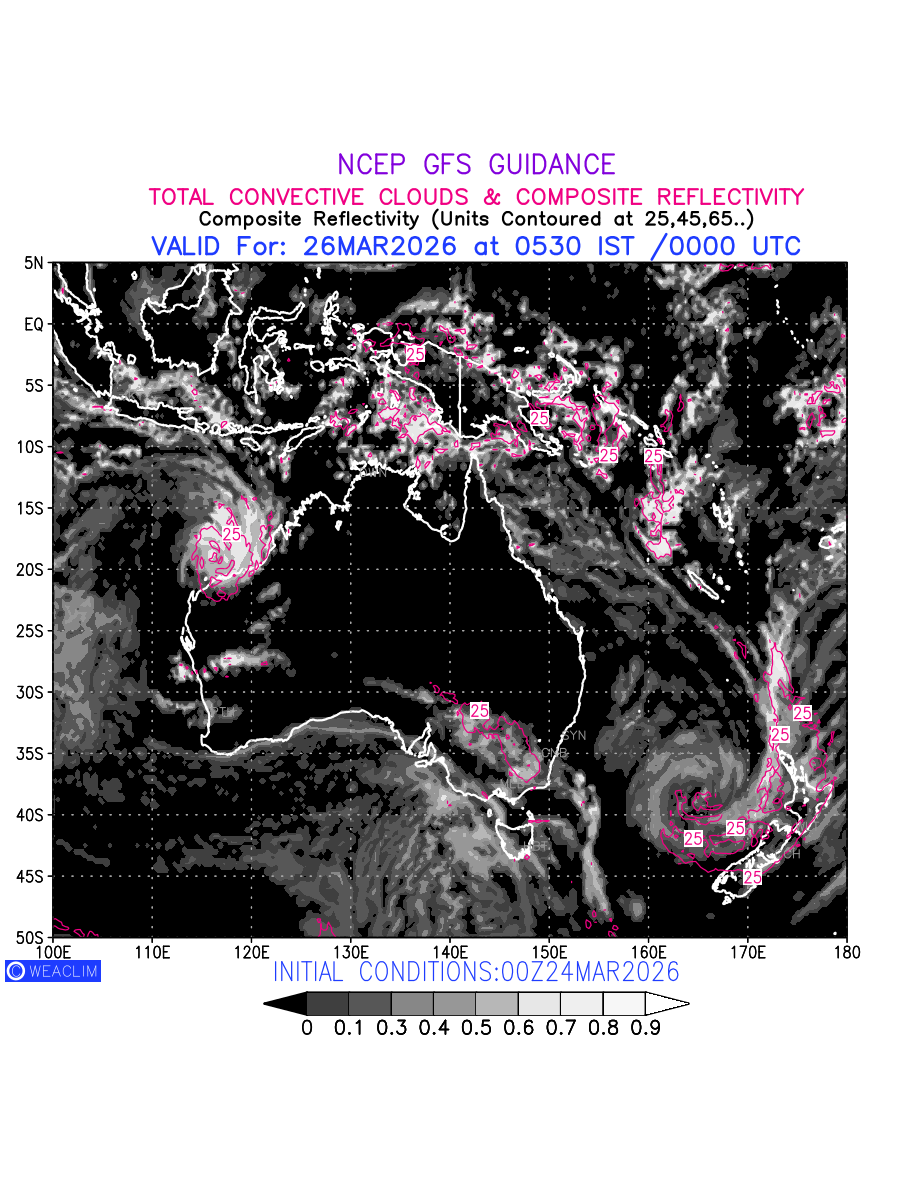 Convective clouds are formed by the vertical movement of air in the atmosphere and are associated with thunderstorms and other types of severe weather like intense rainfall, strong gusty winds etc. Shades from black to white on scale of 0 to 1 with whiter shade depicting more intensity of convection has been used in the depiction. Also shown is the Composite Reflectivity that takes the maximum reflectivity from each elevation angle of the Doppler Weather Radar and meshes it into one image. Advantage of this type of image is the ability to quickly assess the intensity of storms. Predicted pattern of Total Convective Clouds and percentage of the sky covered by them is shown here along with Composite Reflectivity for the Australian Region for the next ten days.