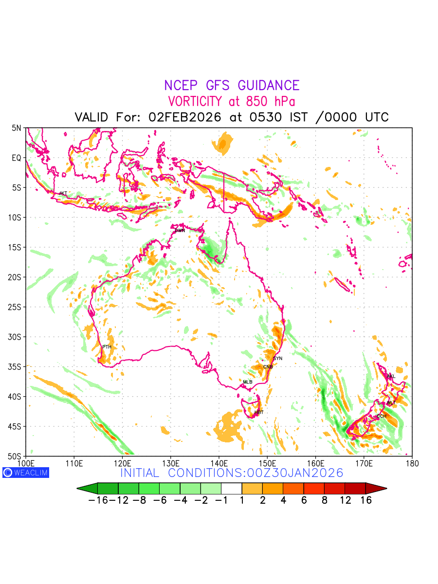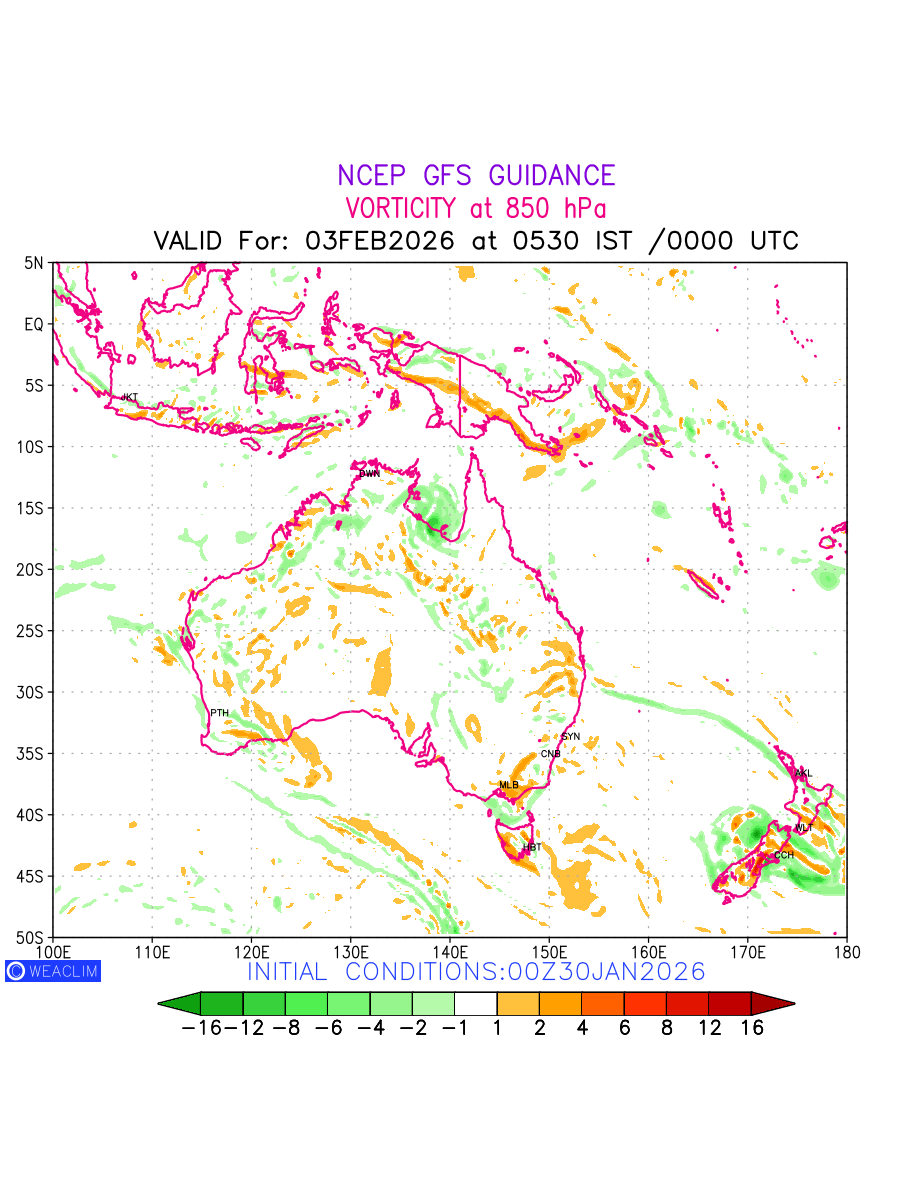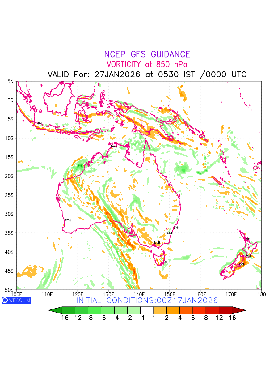 Low Level Convergence at the 24th hour for Australia, New Zealand and Tasmania is the graphical representation of the expected magnitude and pattern of horizontal rotation (or the vorticity) of atmosphere around a vertical axis or the vorticity at 850 hPa (1.5km). In northern hemisphere it is typically displayed with warm colors ranging from shades of red (to yellow) indicating positive vorticity (cyclonic rotation), and cool colors shades of green (to blue) indicating negative vorticity (anticyclonic rotation). They are useful tools for identifying areas of high and low vorticity, associated with weather systems such as fronts, lows, and highs etc.
