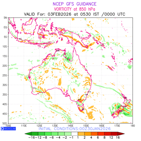 Low Level Convergence at the 24th hour for Australia, New Zealand and Tasmania is the graphical representation of the expected magnitude and pattern of horizontal rotation (or the vorticity) of atmosphere around a vertical axis or the vorticity at 850 hPa (1.5km). In northern hemisphere it is typically displayed with warm colors ranging from shades of red (to yellow) indicating positive vorticity (cyclonic rotation), and cool colors shades of green (to blue) indicating negative vorticity (anticyclonic rotation). They are useful tools for identifying areas of high and low vorticity, associated with weather systems such as fronts, lows, and highs etc.