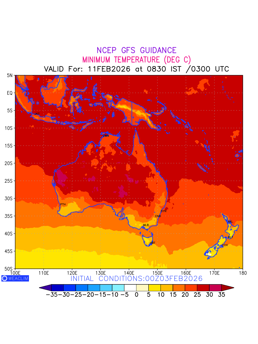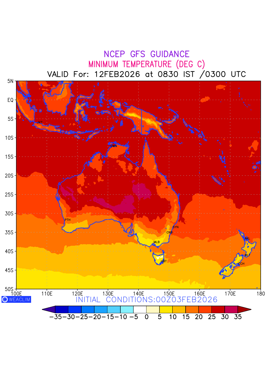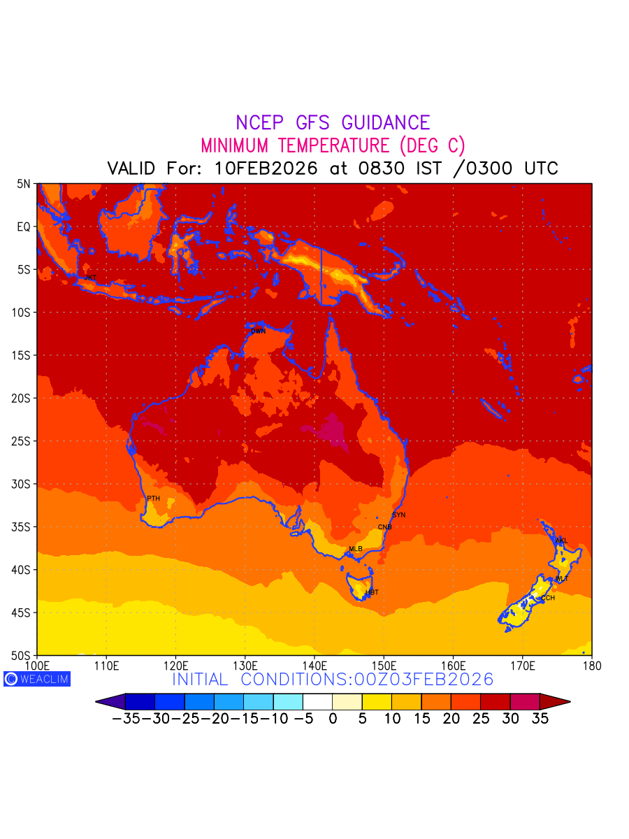 Minimum Temperature for Australia, New Zealand and Tasmania depicts the highest temperatures at 2m above the ground surface between 0300 UTC of the previous date to 0300 UTC of the required date. This is an important variable for weather forecasting, as it determines the conditions at the Earth’s surface during the coldest part of the date, affecting human activities, agriculture, and the environment. 2m Temperature data can be used for a variety of applications, such as predicting the onset of cold spells, forecasting temperature trends, and studying the impact of weather on various systems and processes.