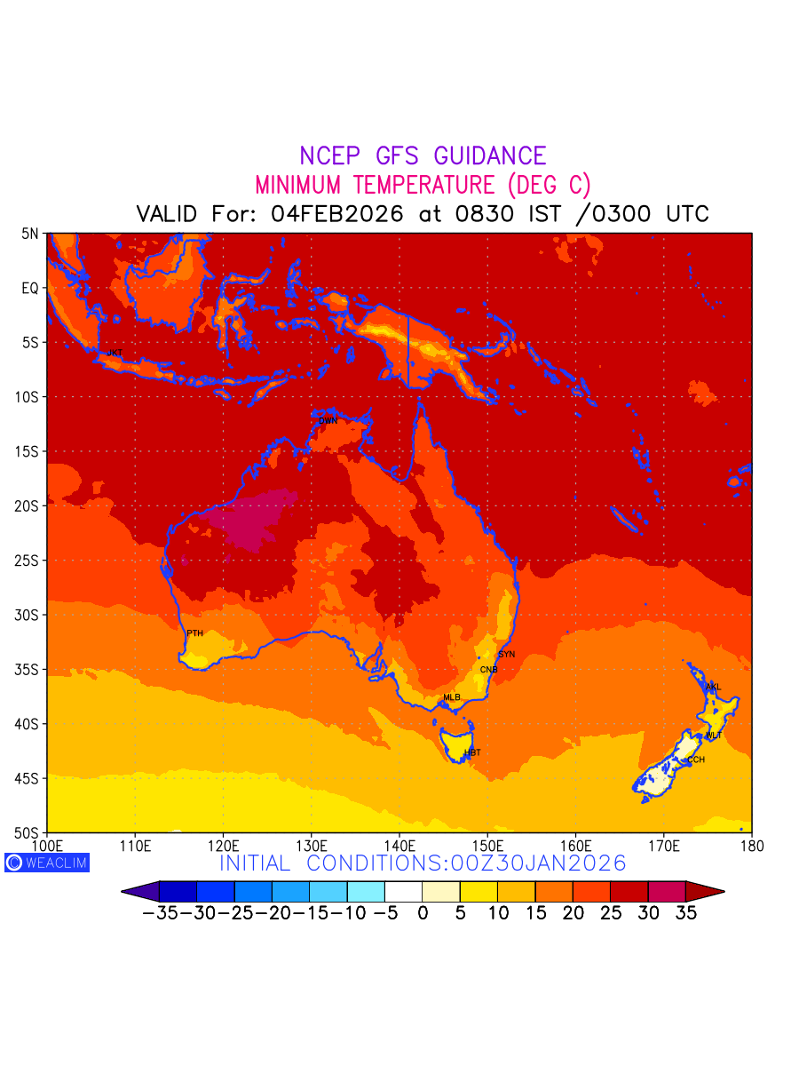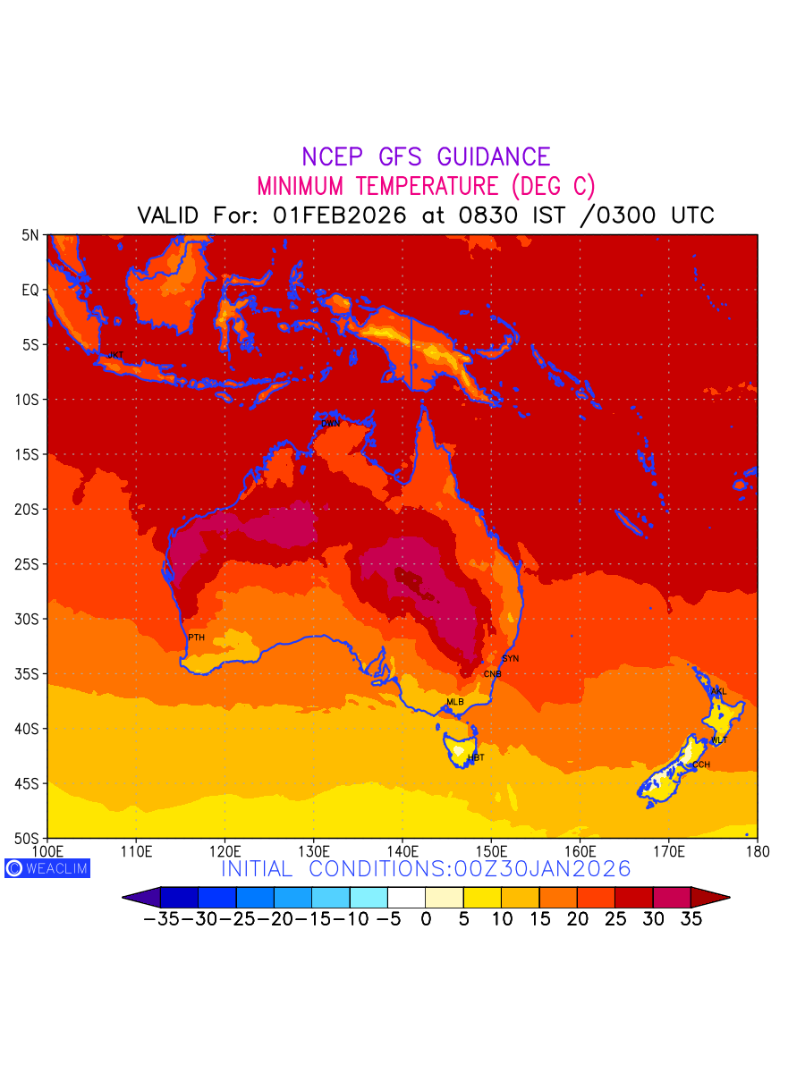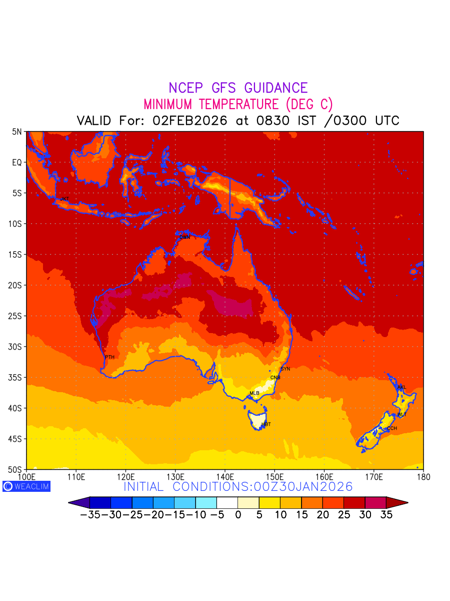 Minimum Temperature for Australia, New Zealand and Tasmania depicts the highest temperatures at 2m above the ground surface between 0300 UTC of the previous date to 0300 UTC of the required date. This is an important variable for weather forecasting, as it determines the conditions at the Earth’s surface during the coldest part of the date, affecting human activities, agriculture, and the environment. 2m Temperature data can be used for a variety of applications, such as predicting the onset of cold spells, forecasting temperature trends, and studying the impact of weather on various systems and processes.