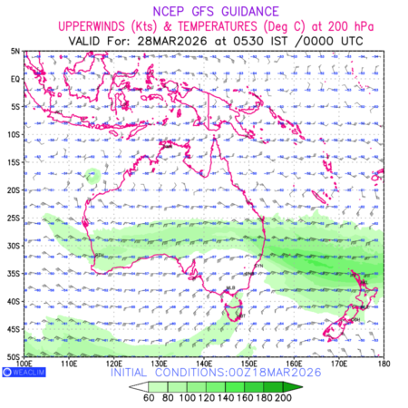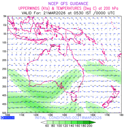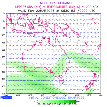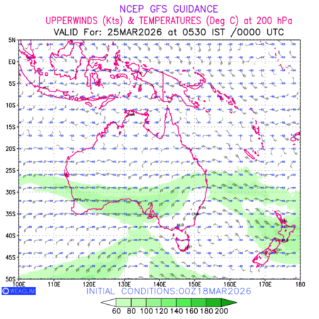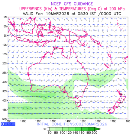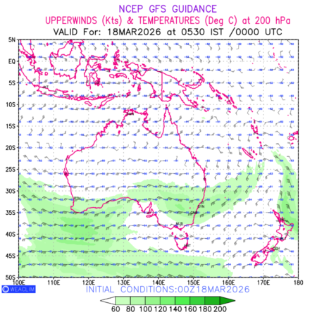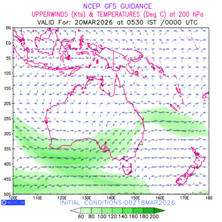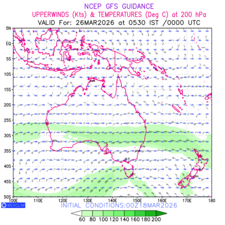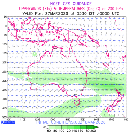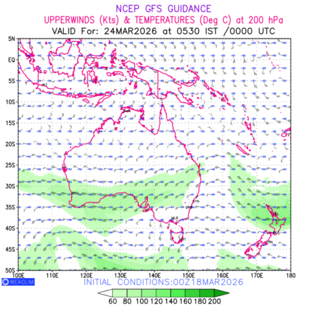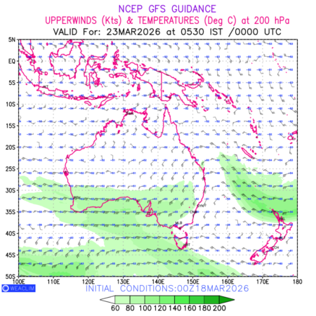 Winds at 200 hPa at the 24th hour for Australia, New Zealand and Tasmania refers to the predicted wind direction and speed at a pressure level of 200 hPa, which is located in the upper troposphere (approximately 12 Km or 7.5 miles above the Earths surface). The winds are presented knots (kt), and the direction is given in degrees from true north. ‘Jet Streams’ are marked in shades of green for winds with magnitude of more than 60kt is a narrow band of high-speed winds that can influence weather patterns over large areas. long with the wind speed (kt) and direction , upper air temperatures (Deg C) are also shown at the grid points over the Australian Region at 200 hPa level for the next ten days