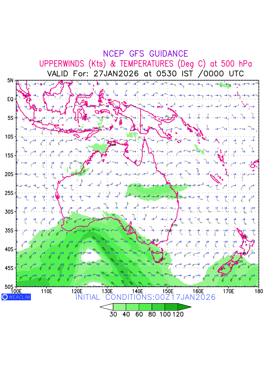Winds at 500 hPa at the 24th hour for Australia, New Zealand and Tasmania refers to the predicted wind direction and speed at a pressure level of 500 hPa, which is located in the upper troposphere about 5.5 km (18,000ft) above the Earths surface. The winds are presented in knots (kt), and the direction is given in degrees from true north. Winds with magnitude of more than 40 kt are marked in shades of green. It provides important information on forecasting weather patterns, including the movement and intensification of storms, the development of weather fronts, and the location and strength of high and low pressure systems. The depiction also shows the temperature along with the wind barb on the grid points at 500 hPa. Along with the wind speed (kt) and direction, upper air temperatures (Deg C) are also shown at the grid points over the African Region at 500 hPa level for the next ten days.
