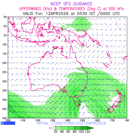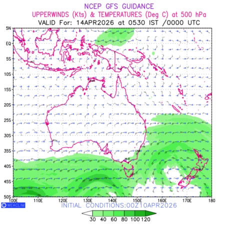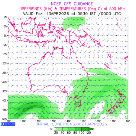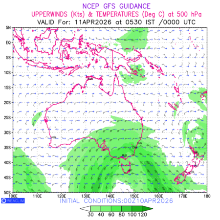 Winds at 500 hPa at the 24th hour for Australia, New Zealand and Tasmania refers to the predicted wind direction and speed at a pressure level of 500 hPa, which is located in the upper troposphere about 5.5 km (18,000ft) above the Earths surface. The winds are presented in knots (kt), and the direction is given in degrees from true north. Winds with magnitude of more than 40 kt are marked in shades of green. It provides important information on forecasting weather patterns, including the movement and intensification of storms, the development of weather fronts, and the location and strength of high and low pressure systems. The depiction also shows the temperature along with the wind barb on the grid points at 500 hPa. Along with the wind speed (kt) and direction, upper air temperatures (Deg C) are also shown at the grid points over the African Region at 500 hPa level for the next ten days.