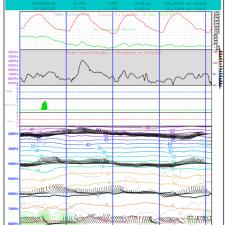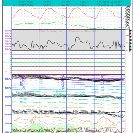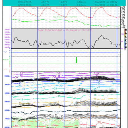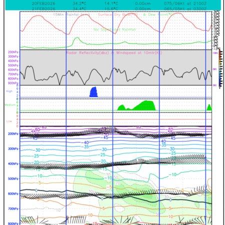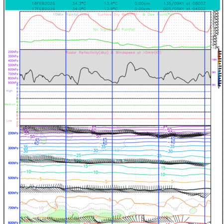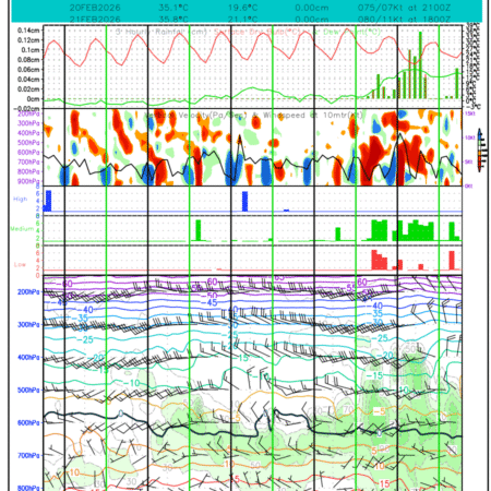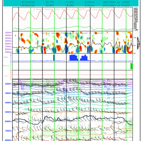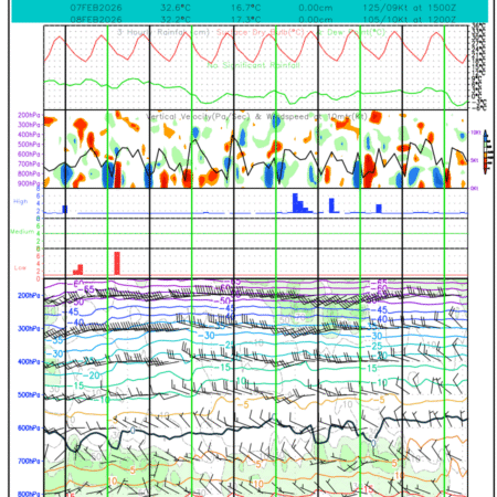 Location Specific Forecasts or Meteograms are graphics that display predicted meteorological data over time for a particular location. They provide a convenient way to quickly visualize and interpret complex weather data, allowing users to make informed decisions based on the latest weather information. These predictions are customised to a time frame with validity of ten days from the date of issue. First Panel at the bottom is the time height representation of the atmospheric profile from surface to 100 hPa level showing the magnitude and direction of winds through wind barbs, isotherm of temperature with freezing level depicted in black and the relative humidity contoured and shaded in green. Second, third and fourth panels show the oktas of low, medium and high clouds in red, green and blue colors, respectively. The fifth panel shows time height representation of Vertical Velocity (ω in Pa/Sec) contoured in shaded colors and the wind speed at 10 meters (kt). Vertical velocity shows the magnitude of verti al winds with negative values showing upward movement (causing formation of convective clouds) and positive values showing downward movement (leading to clear skies) of the airmass at the selected location. The sixth panel shows the Hourly Rainfall (in cm) along with Surface Dry Bulb and Dew Point Temperatures ( o C) over the time period of next ten days. The seventh panel shows the values of predicted Maximum and Minimum Temperature ( o C), Rainfall amount (in cm) and time of Maximum Winds (kt) expected during the next three days.The eighth panel at the top gives the general information on name of the selected location, time of initial conditions (in UTC), latitude and longitude of the location and its model elevation.