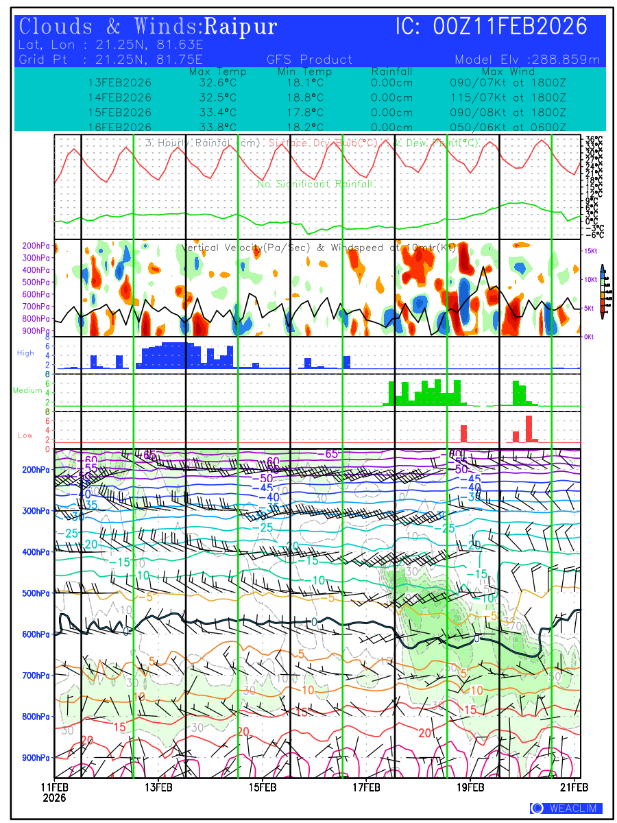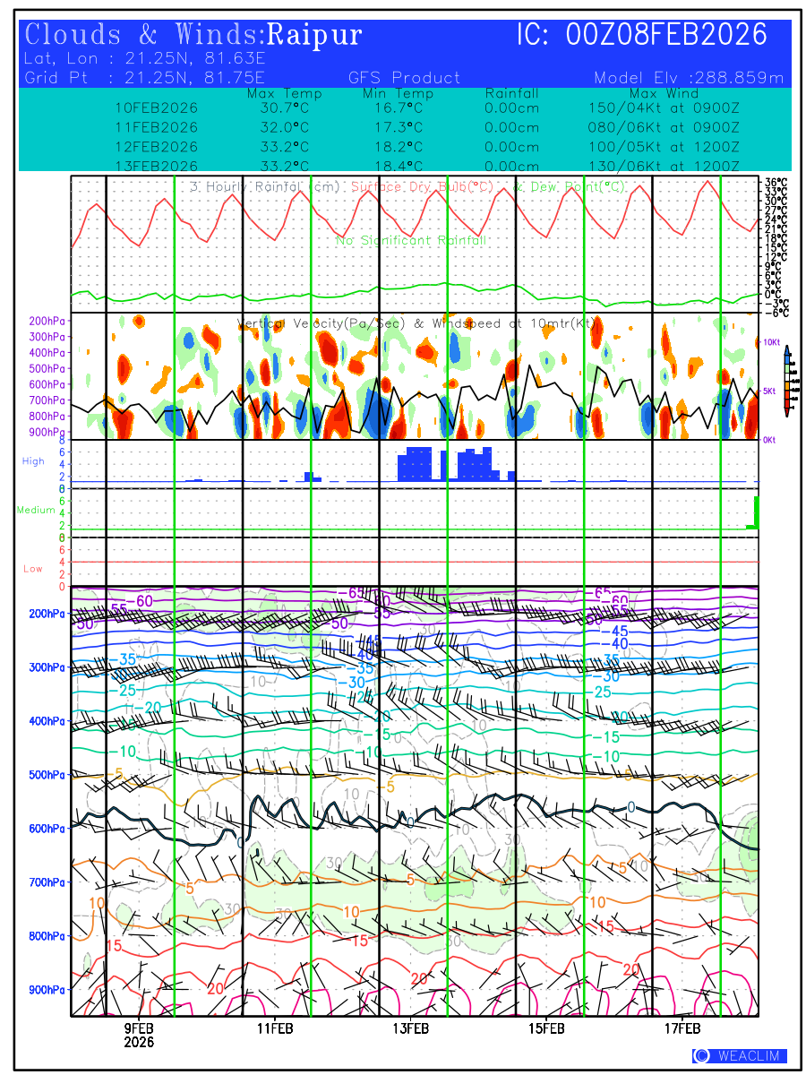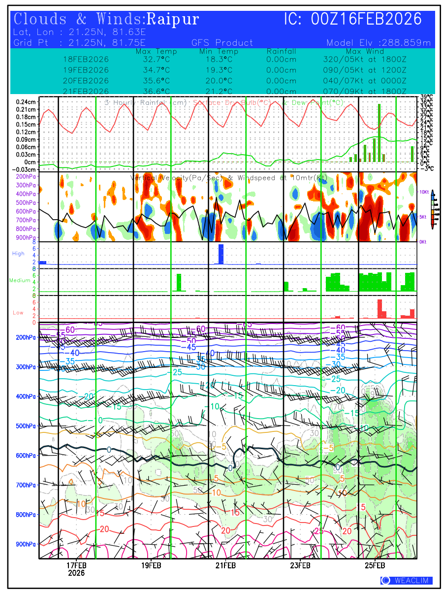 Location Specific Forecasts or Meteograms are graphics that display predicted meteorological data over time for a particular location. They provide a convenient way to quickly visualize and interpret complex weather data, allowing users to make informed decisions based on the latest weather information. These predictions are customised to a time frame with validity of ten days from the date of issue. First Panel at the bottom is the time height representation of the atmospheric profile from surface to 100 hPa level showing the magnitude and direction of winds through wind barbs, isotherm of temperature with freezing level depicted in black and the relative humidity contoured and shaded in green. Second, third and fourth panels show the oktas of low, medium and high clouds in red, green and blue colors, respectively. The fifth panel shows time height representation of Vertical Velocity (ω in Pa/Sec) contoured in shaded colors and the wind speed at 10 meters (kt). Vertical velocity shows the magnitude of verti al winds with negative values showing upward movement (causing formation of convective clouds) and positive values showing downward movement (leading to clear skies) of the airmass at the selected location. The sixth panel shows the Hourly Rainfall (in cm) along with Surface Dry Bulb and Dew Point Temperatures ( o C) over the time period of next ten days. The seventh panel shows the values of predicted Maximum and Minimum Temperature ( o C), Rainfall amount (in cm) and time of Maximum Winds (kt) expected during the next three days.The eighth panel at the top gives the general information on name of the selected location, time of initial conditions (in UTC), latitude and longitude of the location and its model elevation.