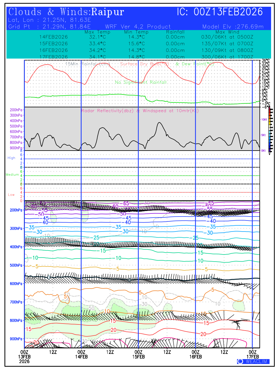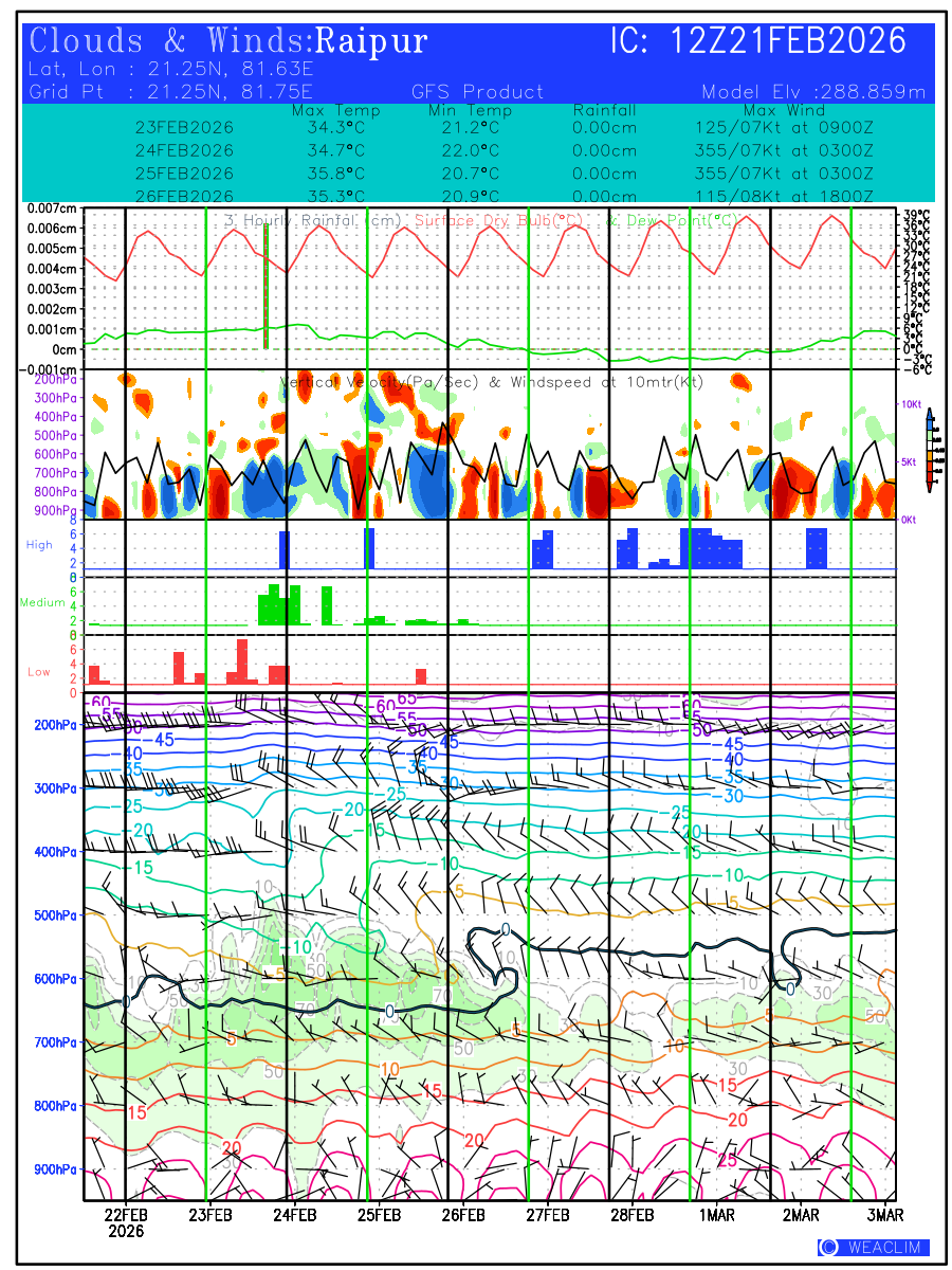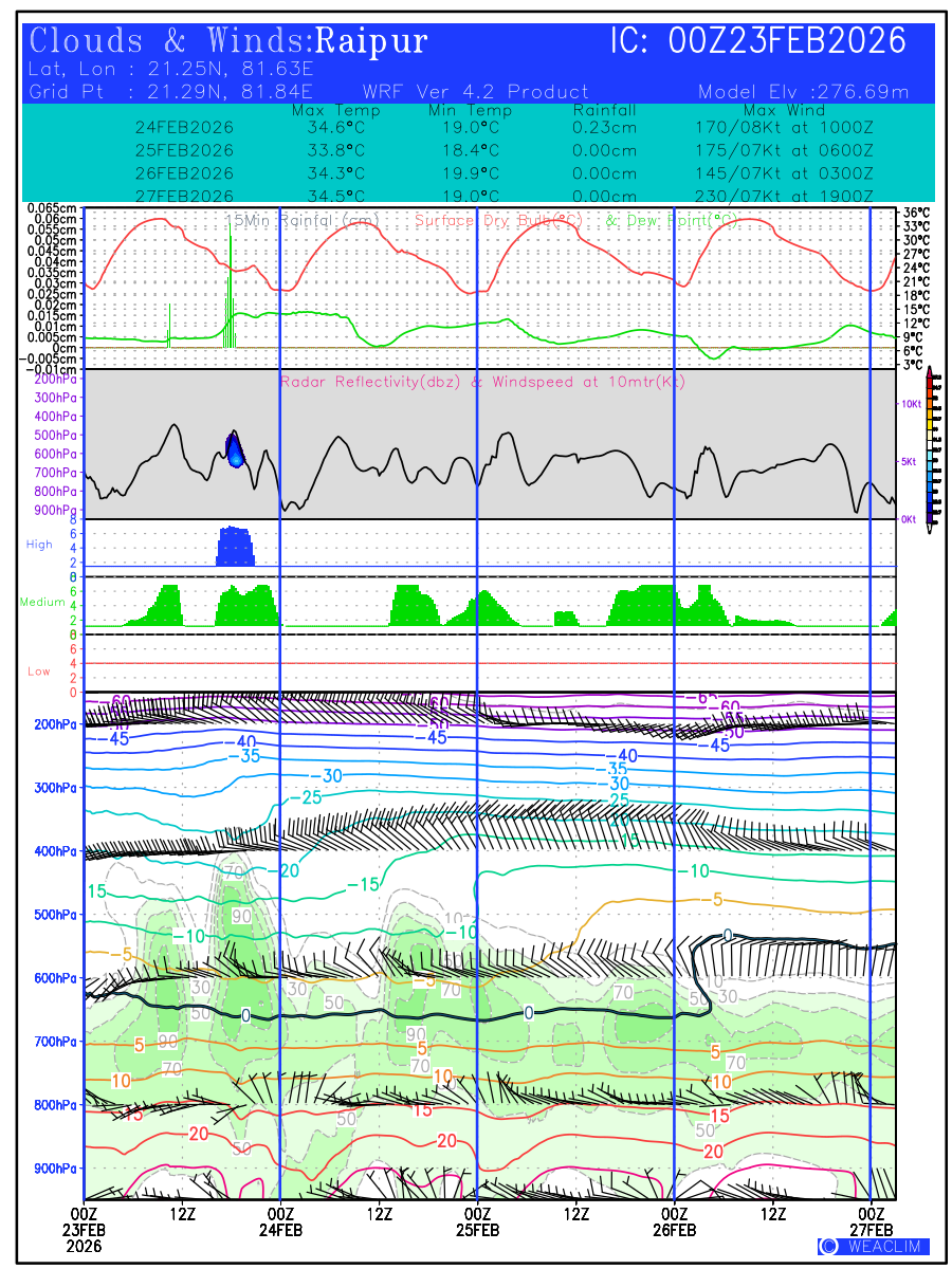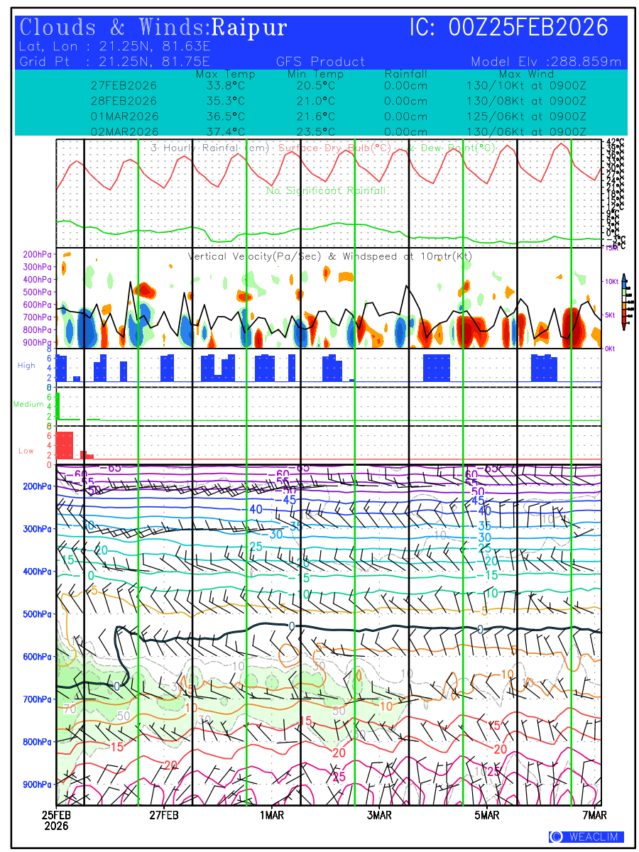Location Specific Forecasts or Meteograms are graphics that display predicted meteorological data over time for a particular location. They provide a convenient way to quickly visualize and interpret complex weather data, allowing users to make informed decisions based on the latest weather information. These predictions are customised to a time frame with validity of ten days from the date of issue. First Panel at the bottom is the time height representation of the atmospheric profile from surface to 100 hPa level showing the magnitude and direction of winds through wind barbs, isotherm of temperature with freezing level depicted in black and the relative humidity contoured and shaded in green. Second, third and fourth panels show the oktas of low, medium and high clouds in red, green and blue colors, respectively. The fifth panel shows time height representation of Vertical Velocity (ω in Pa/Sec) contoured in shaded colors and the wind speed at 10 meters (kt). Vertical velocity shows the magnitude of verti al winds with negative values showing upward movement (causing formation of convective clouds) and positive values showing downward movement (leading to clear skies) of the airmass at the selected location. The sixth panel shows the Hourly Rainfall (in cm) along with Surface Dry Bulb and Dew Point Temperatures ( o C) over the time period of next ten days. The seventh panel shows the values of predicted Maximum and Minimum Temperature ( o C), Rainfall amount (in cm) and time of Maximum Winds (kt) expected during the next three days.The eighth panel at the top gives the general information on name of the selected location, time of initial conditions (in UTC), latitude and longitude of the location and its model elevation.