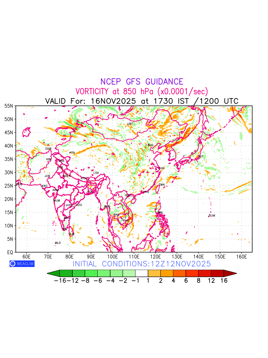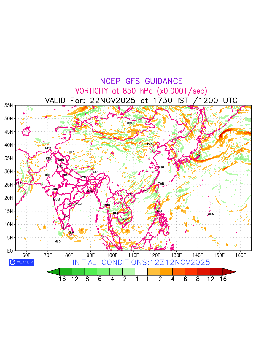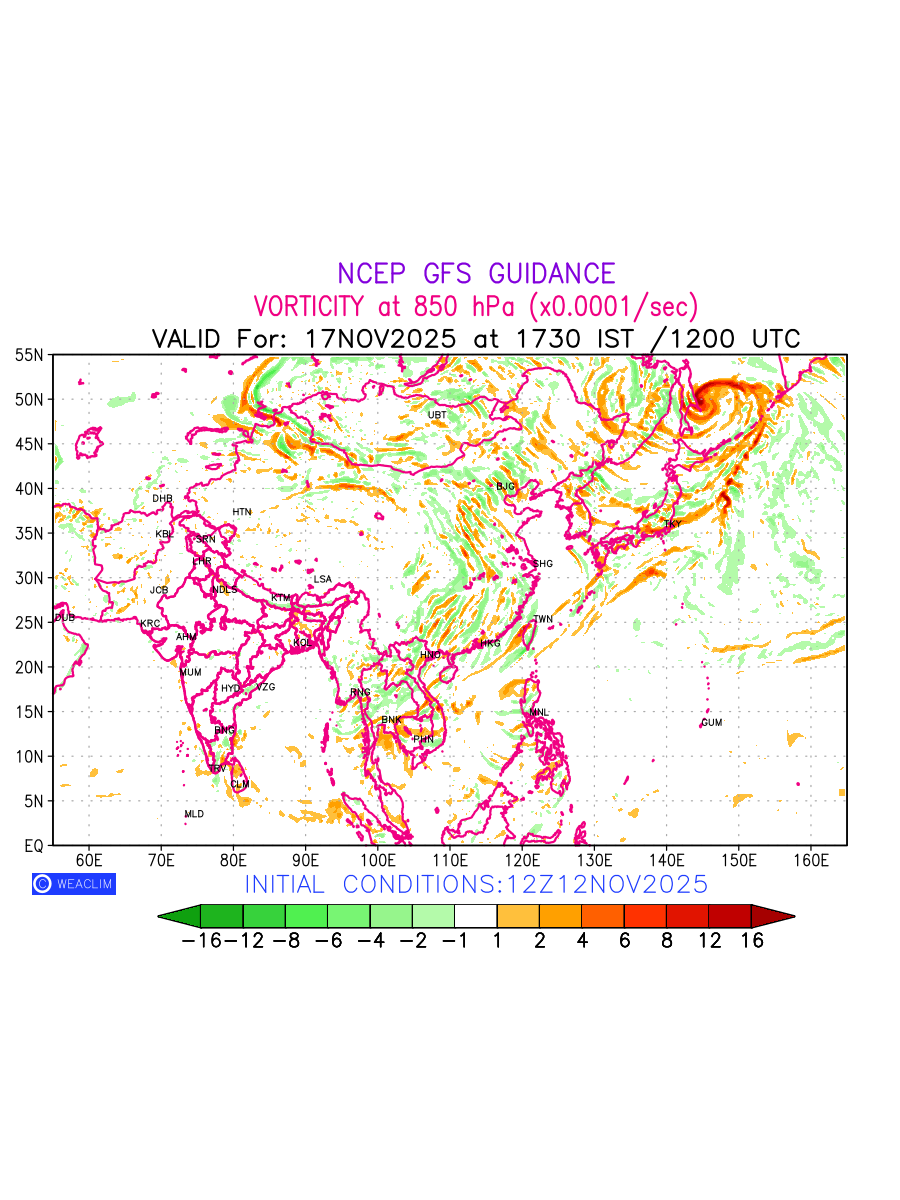 Low Level Convergence at the 24th hour for East Asia is the graphical representation of the expected magnitude and pattern of horizontal rotation (or the vorticity) of atmosphere around a vertical axis or the vorticity at 850hPa (1.5km). In northern hemisphere it is typically displayed with warm colors ranging from shades of red (to yellow) indicating positive vorticity (cyclonic rotation), and cool colors shades of green (to blue) indicating negative vorticity (anticyclonic rotation). They are useful in identifying areas of high and low vorticity, associated with weather systems such as fronts, lows, and highs etc.