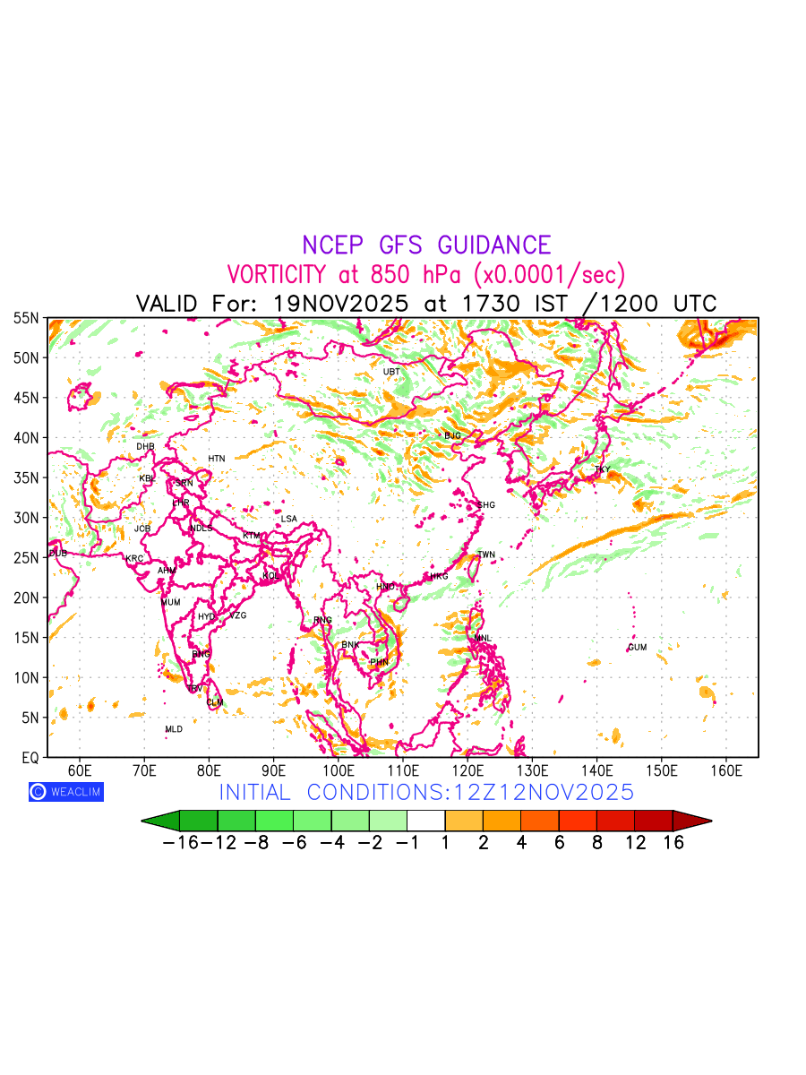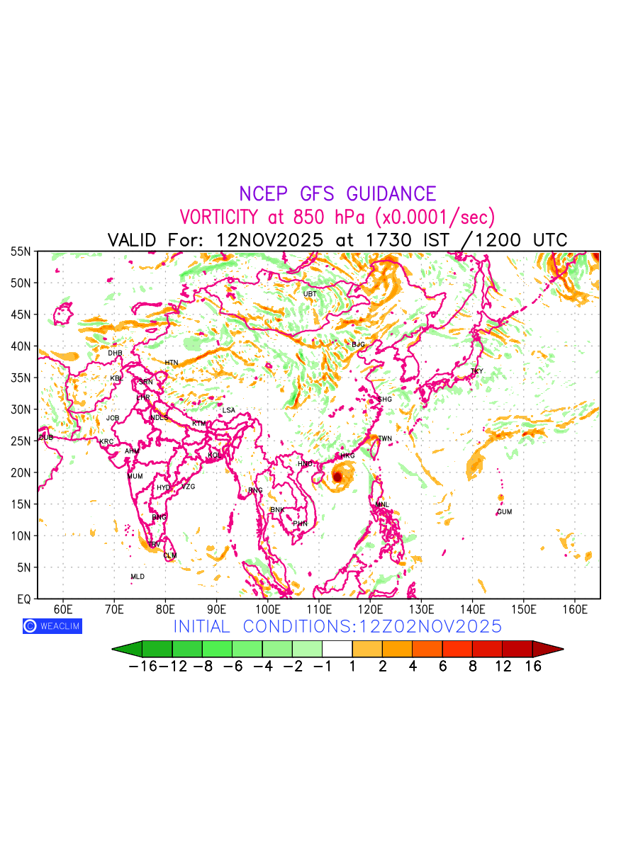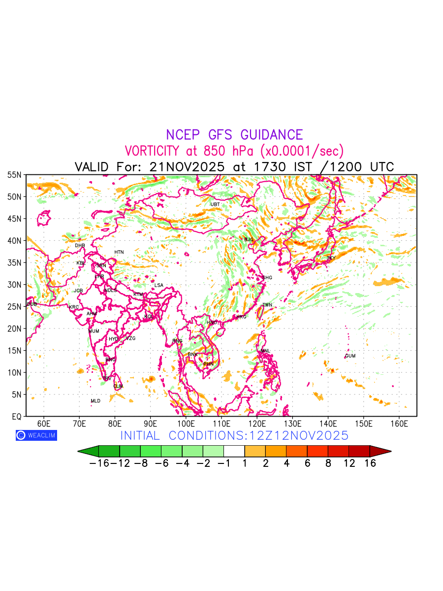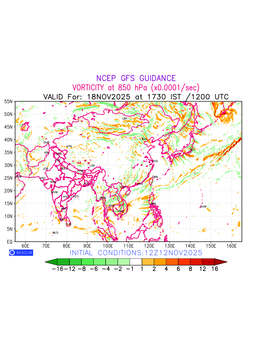 Low Level Convergence at the 24th hour for East Asia is the graphical representation of the expected magnitude and pattern of horizontal rotation (or the vorticity) of atmosphere around a vertical axis or the vorticity at 850hPa (1.5km). In northern hemisphere it is typically displayed with warm colors ranging from shades of red (to yellow) indicating positive vorticity (cyclonic rotation), and cool colors shades of green (to blue) indicating negative vorticity (anticyclonic rotation). They are useful in identifying areas of high and low vorticity, associated with weather systems such as fronts, lows, and highs etc.
