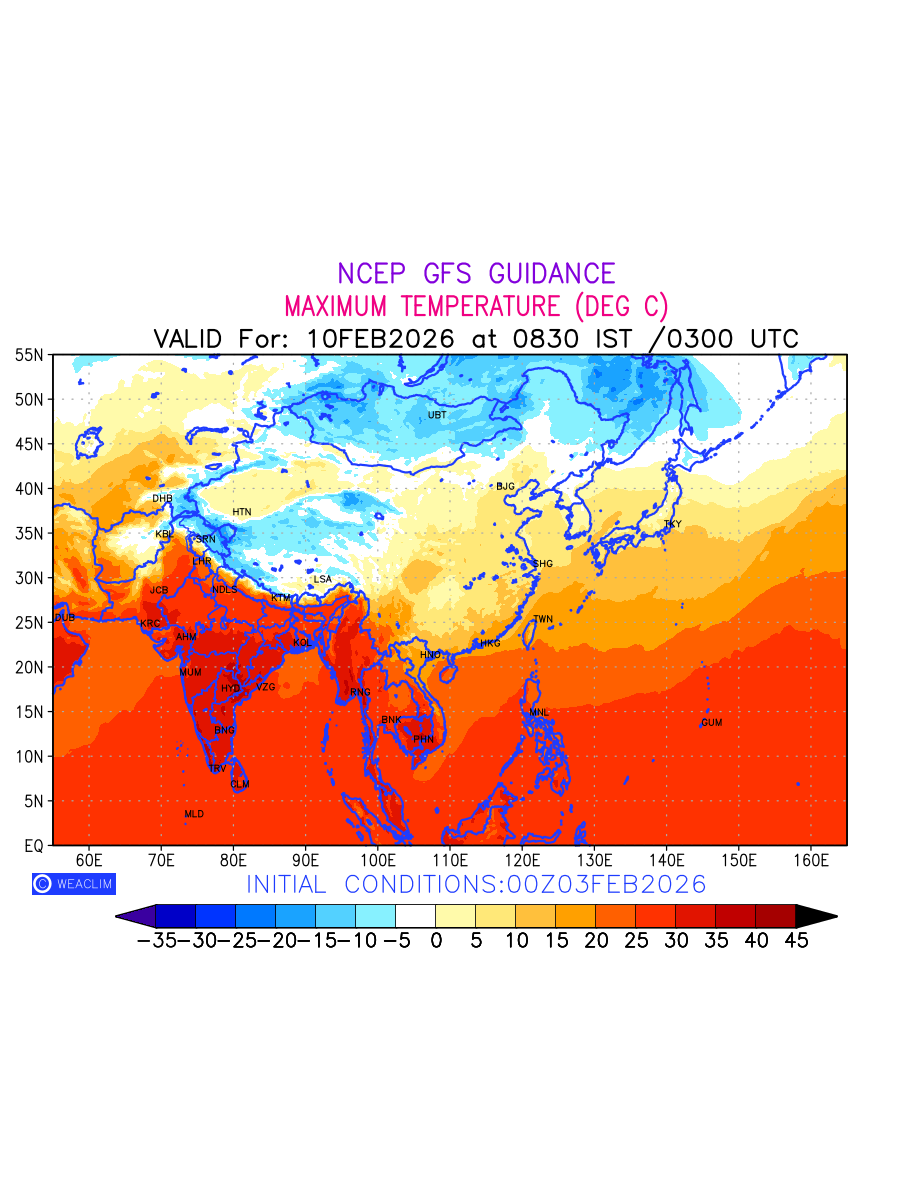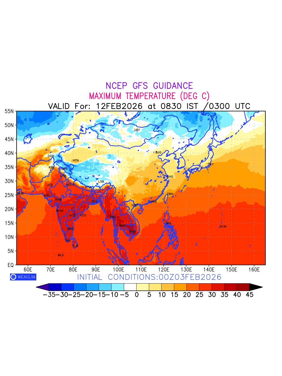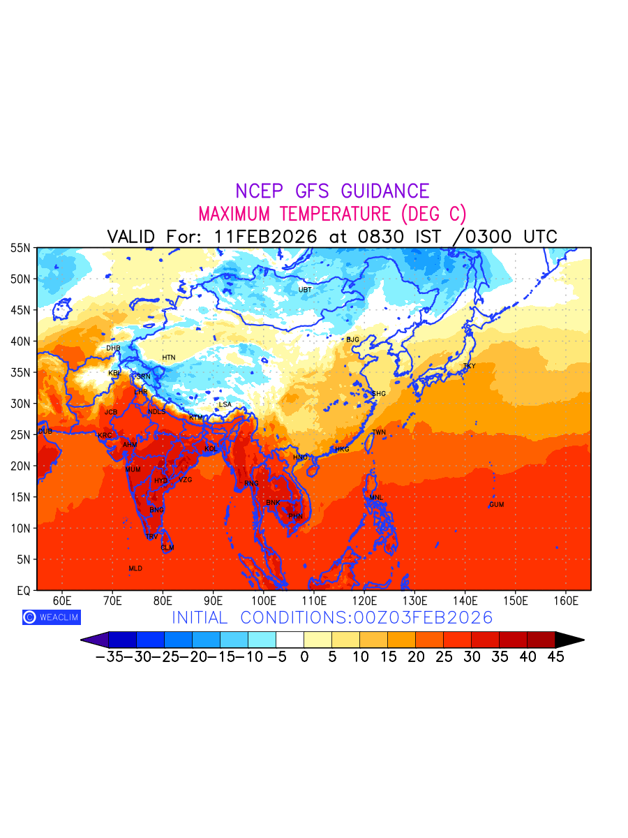 Maximum Temperature for East Asia countries depicts the highest temperatures at 2m above the ground surface between 0300 UTC of the previous date to 0300 UTC of the required date. This is an important variable for weather forecasting, as it determines the conditions at the Earth’s surface during the warmest part of the date, affecting human activities, agriculture, and the environment. 2m Temperature data can be used for a variety of applications, such as predicting the onset of heatwaves or cold spells, forecasting temperature trends, and studying the impact of weather on various systems and processes.