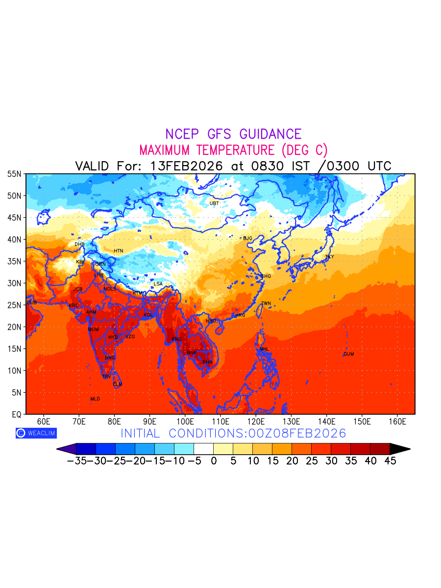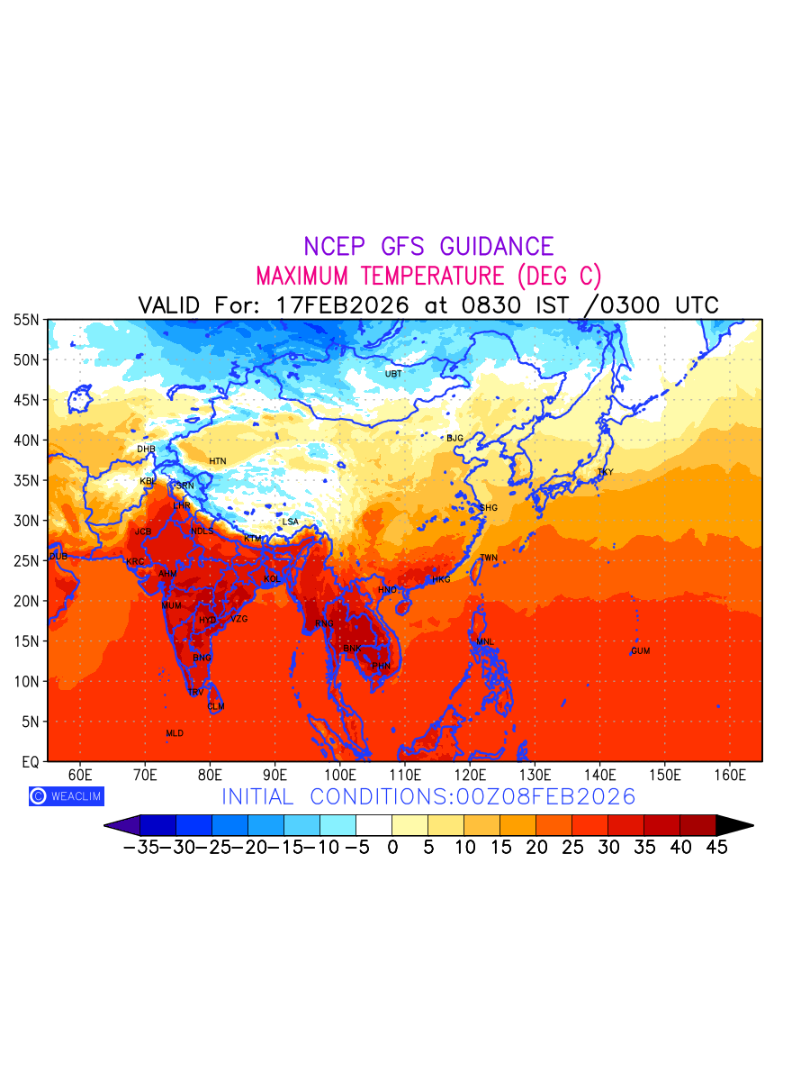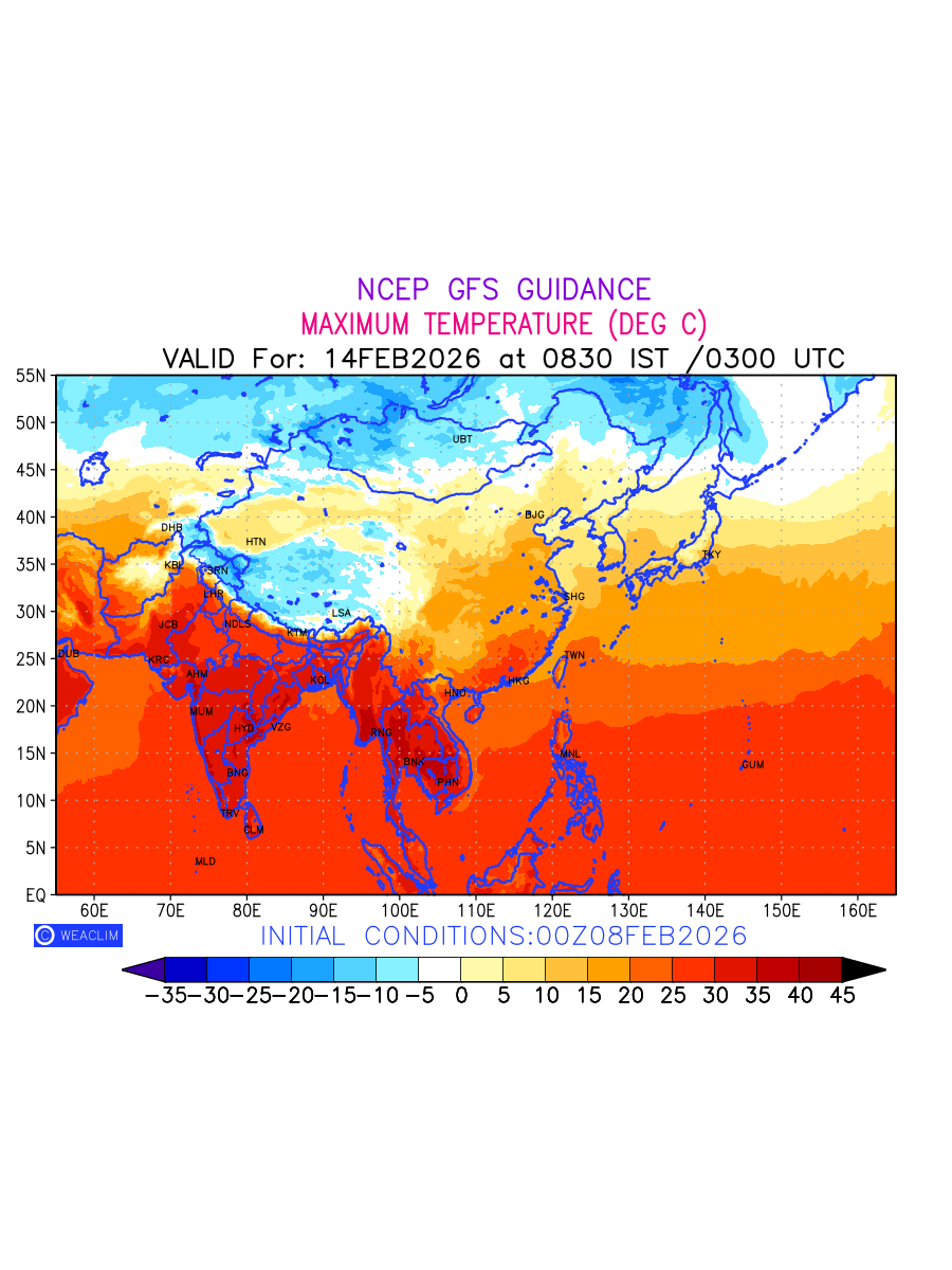 Maximum Temperature for East Asia countries depicts the highest temperatures at 2m above the ground surface between 0300 UTC of the previous date to 0300 UTC of the required date. This is an important variable for weather forecasting, as it determines the conditions at the Earth’s surface during the warmest part of the date, affecting human activities, agriculture, and the environment. 2m Temperature data can be used for a variety of applications, such as predicting the onset of heatwaves or cold spells, forecasting temperature trends, and studying the impact of weather on various systems and processes.