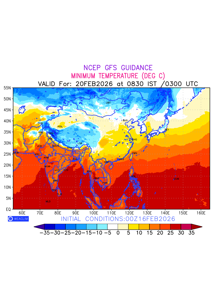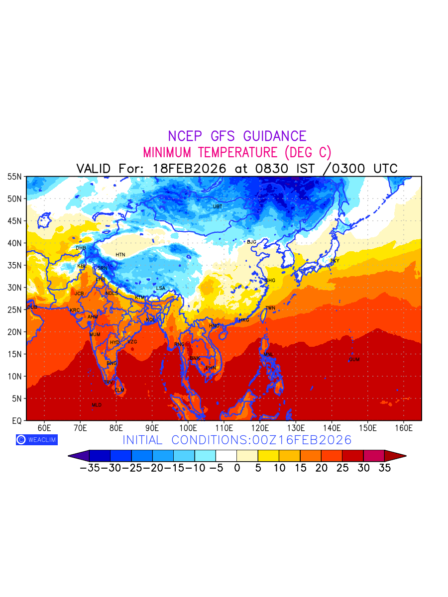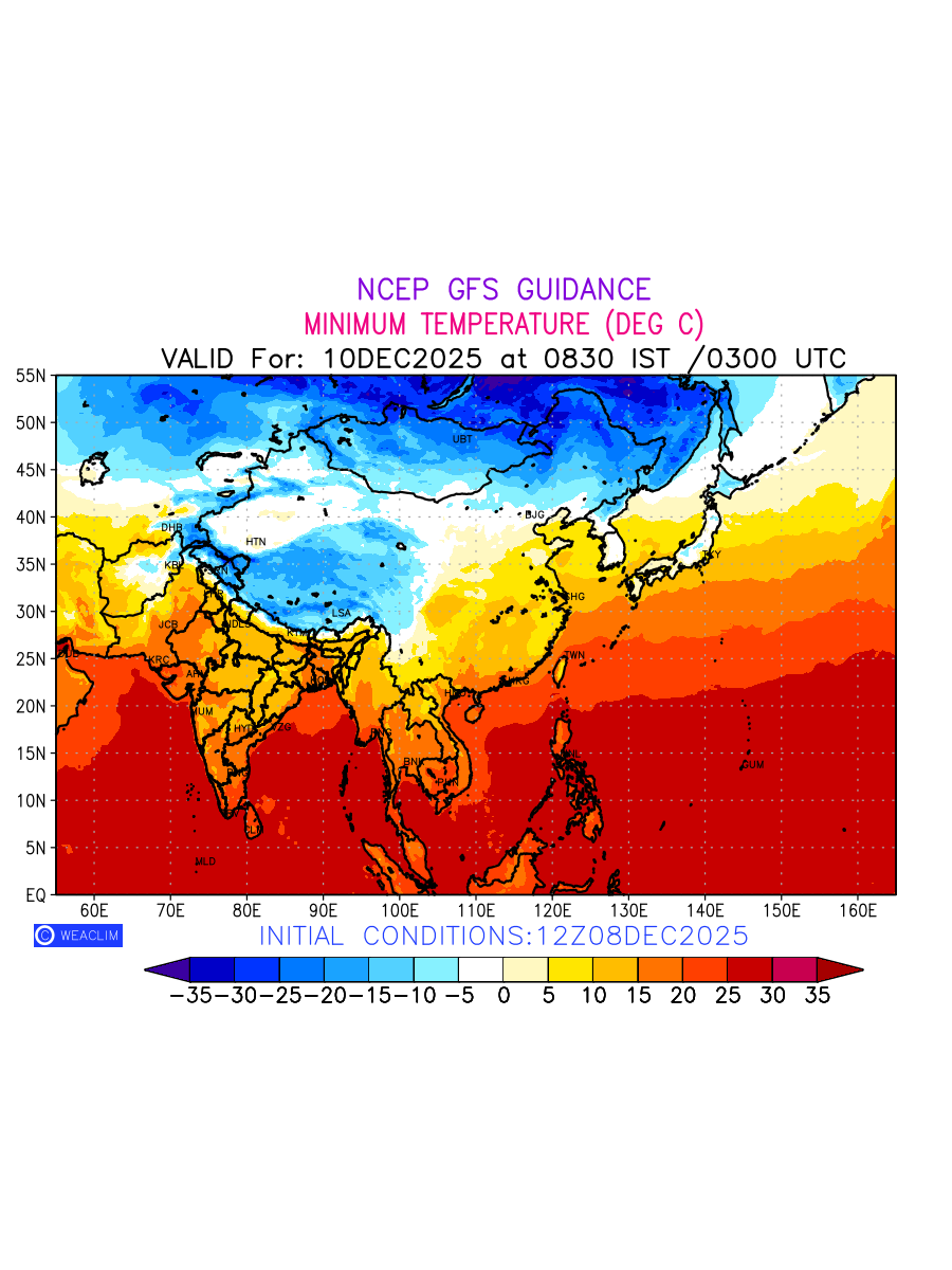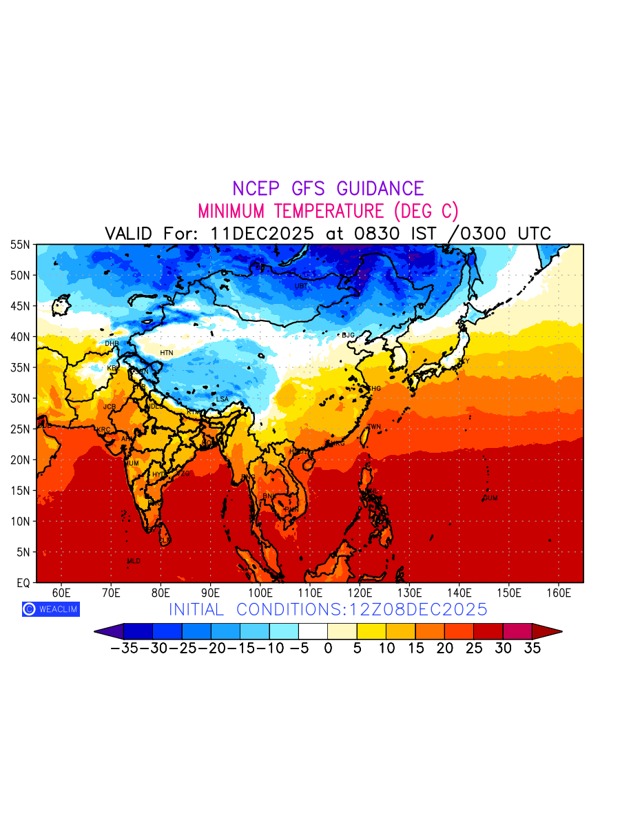Minimum Temperature for East Asia depicts the highest temperatures at 2m above the ground surface between 0300 UTC of the previous date to 0300 UTC of the required date. This is an important variable forweather forecasting, as it determines the conditions at the Earth’s surface during the coldest part of the date, affecting human activities, agriculture, and the environment. 2m Temperature data can be used for a variety of applications, such as predicting the onset of cold spells, forecasting temperature trends, and studying the impact of weather on various systems and processes.